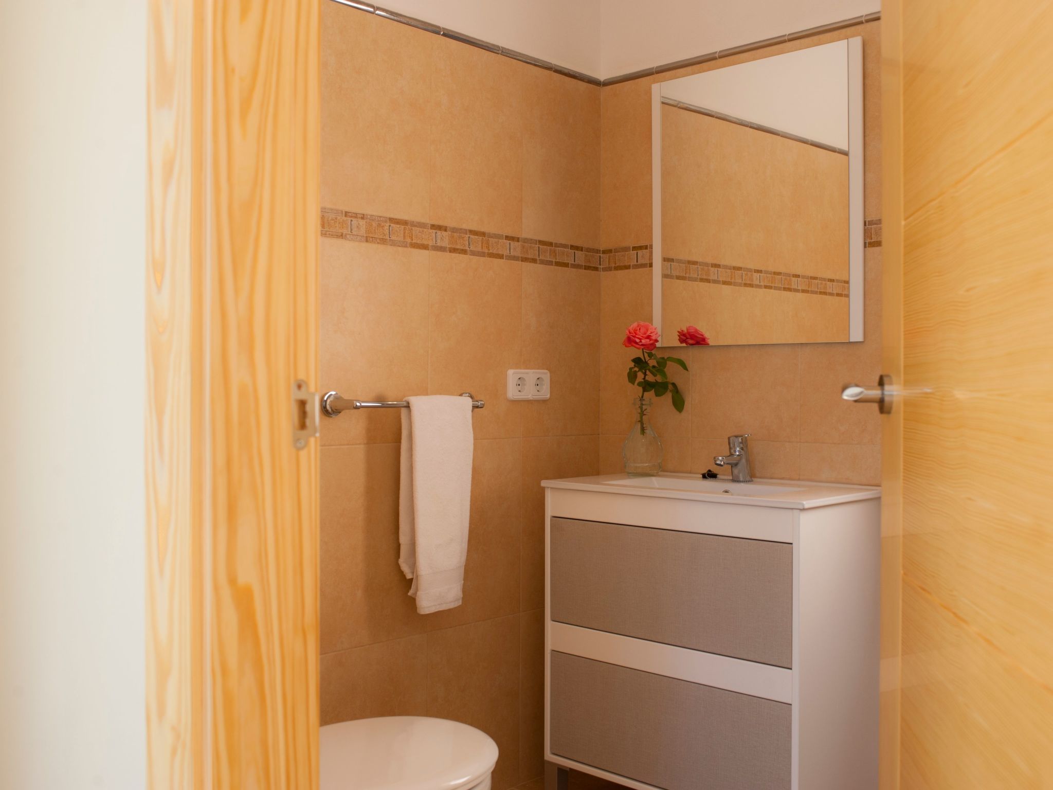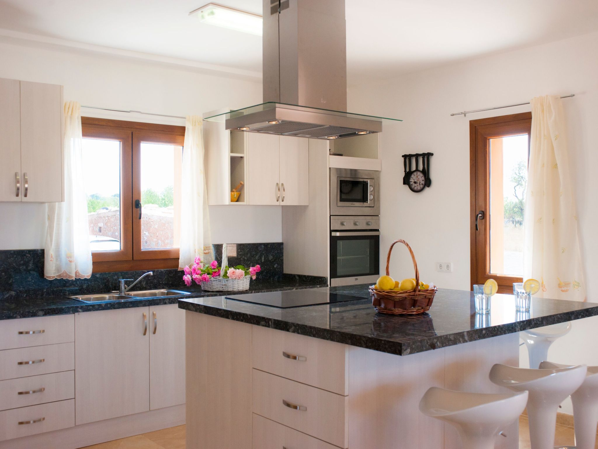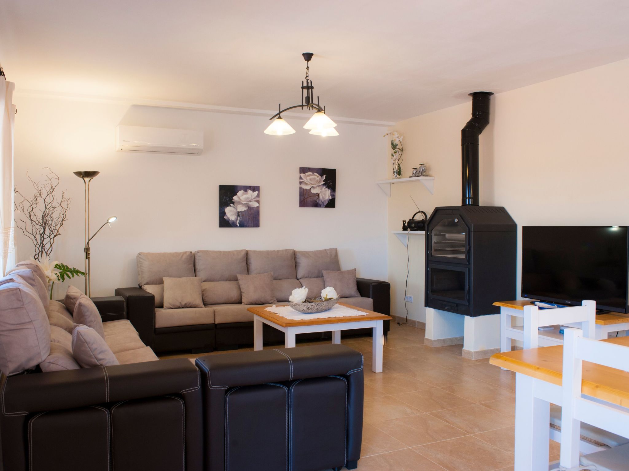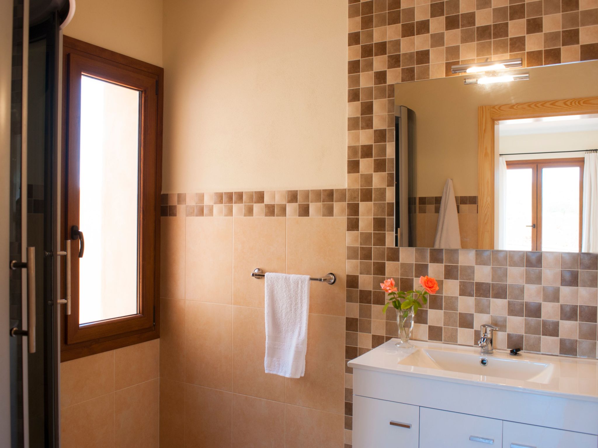 The entrance on the right leads to a large open-plan kitchen with a long dining table and adjoining living area with access to the terrace and pool. From the kitchen, a utility room leads to a spacious bedroom with 2 single beds and en-suite shower room. To the left of the entrance are 2 further bedrooms, also with 2 single beds each, which share a bathroom with Jacuzzi bath. The last bedroom with double bed has an en-suite shower room, the shower has a hydro-massage.