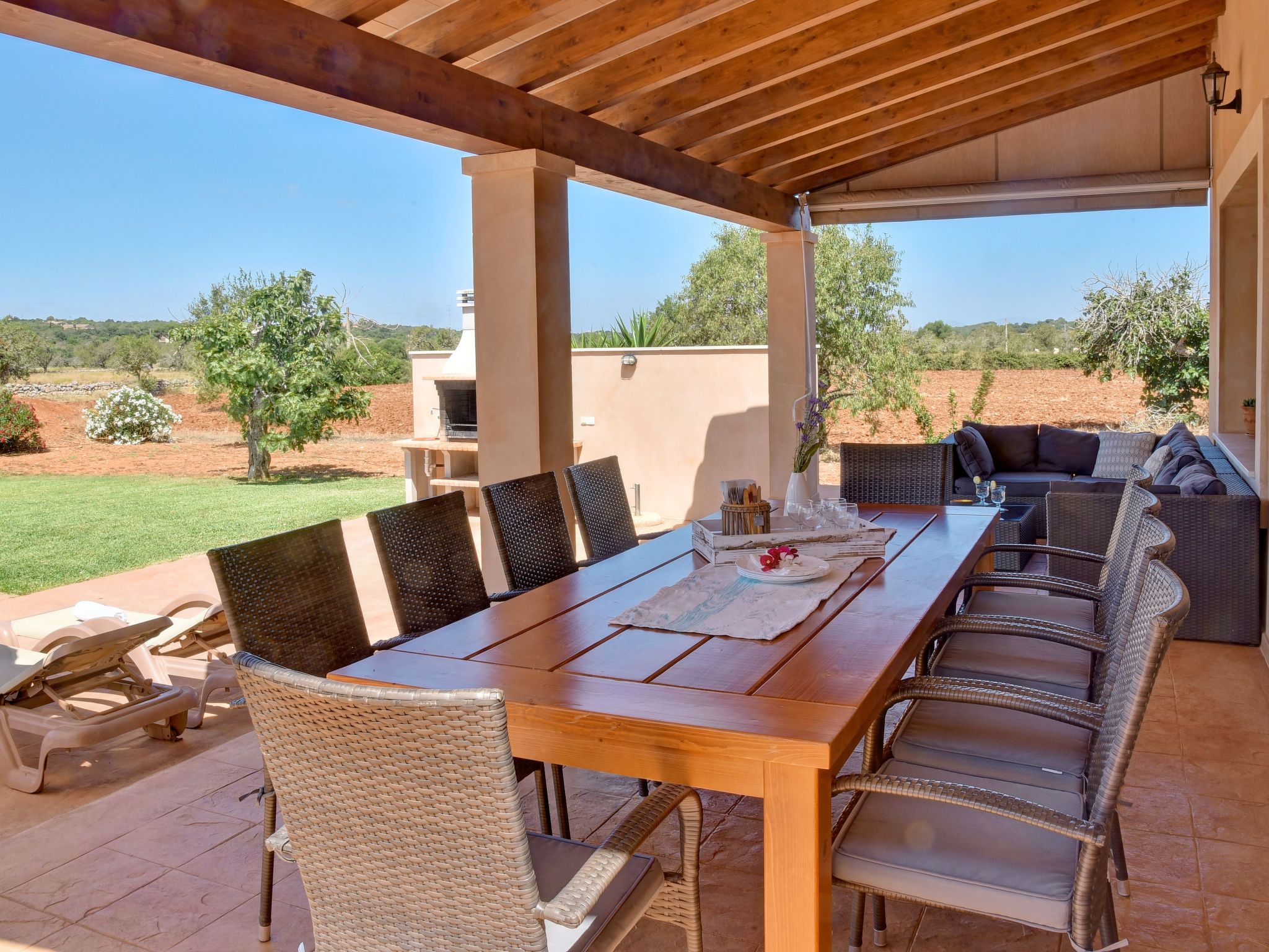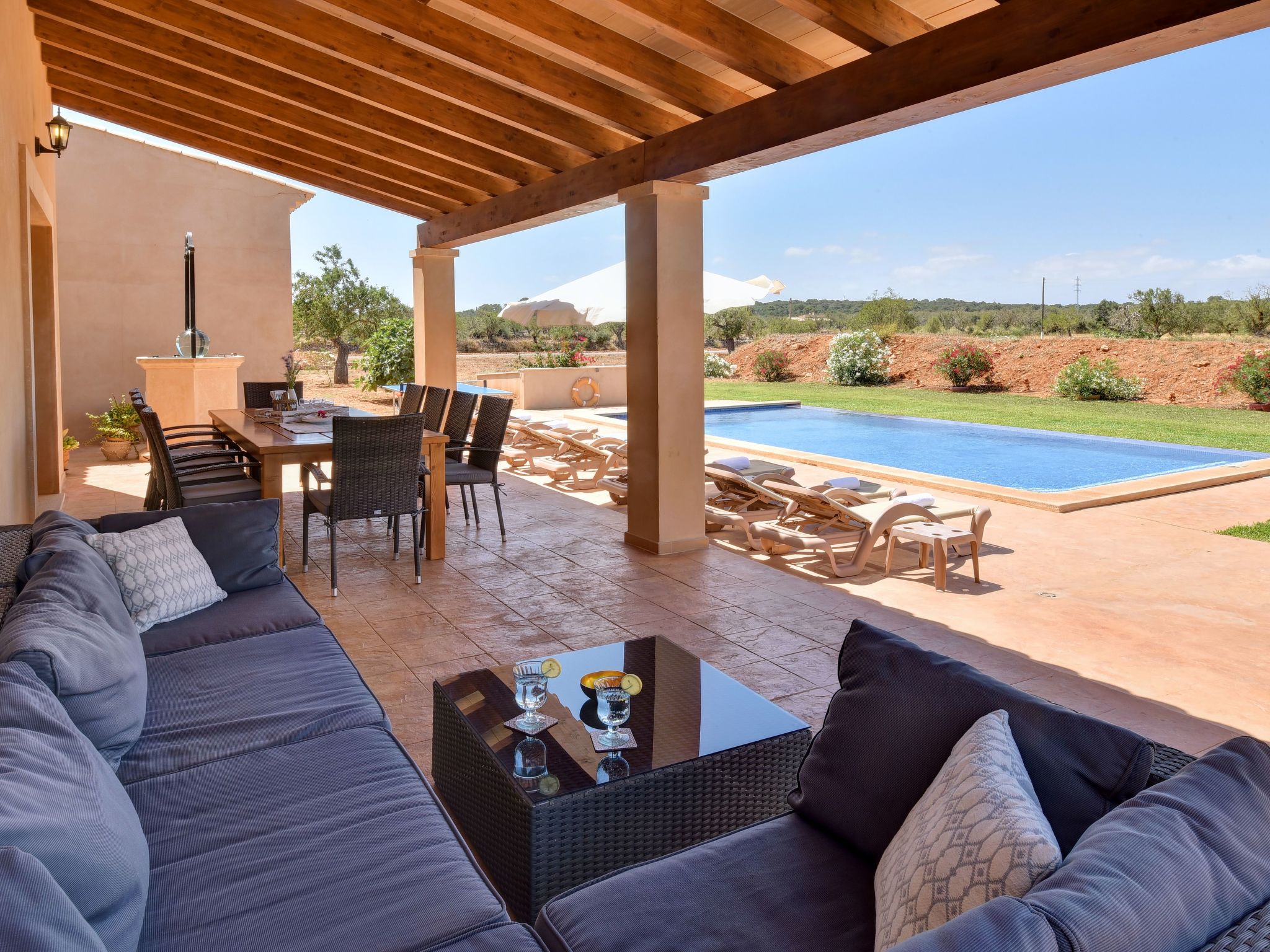 The long, covered terrace with dining area and chill-out seating area is the ideal place for long meals and cosy get-togethers. The 10 x 5 metre infinity pool invites you to take a dip. A brick-built outdoor barbecue is available.