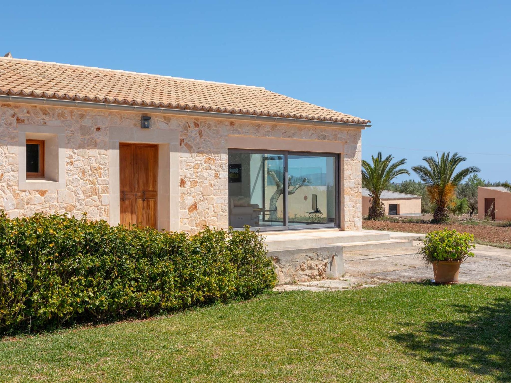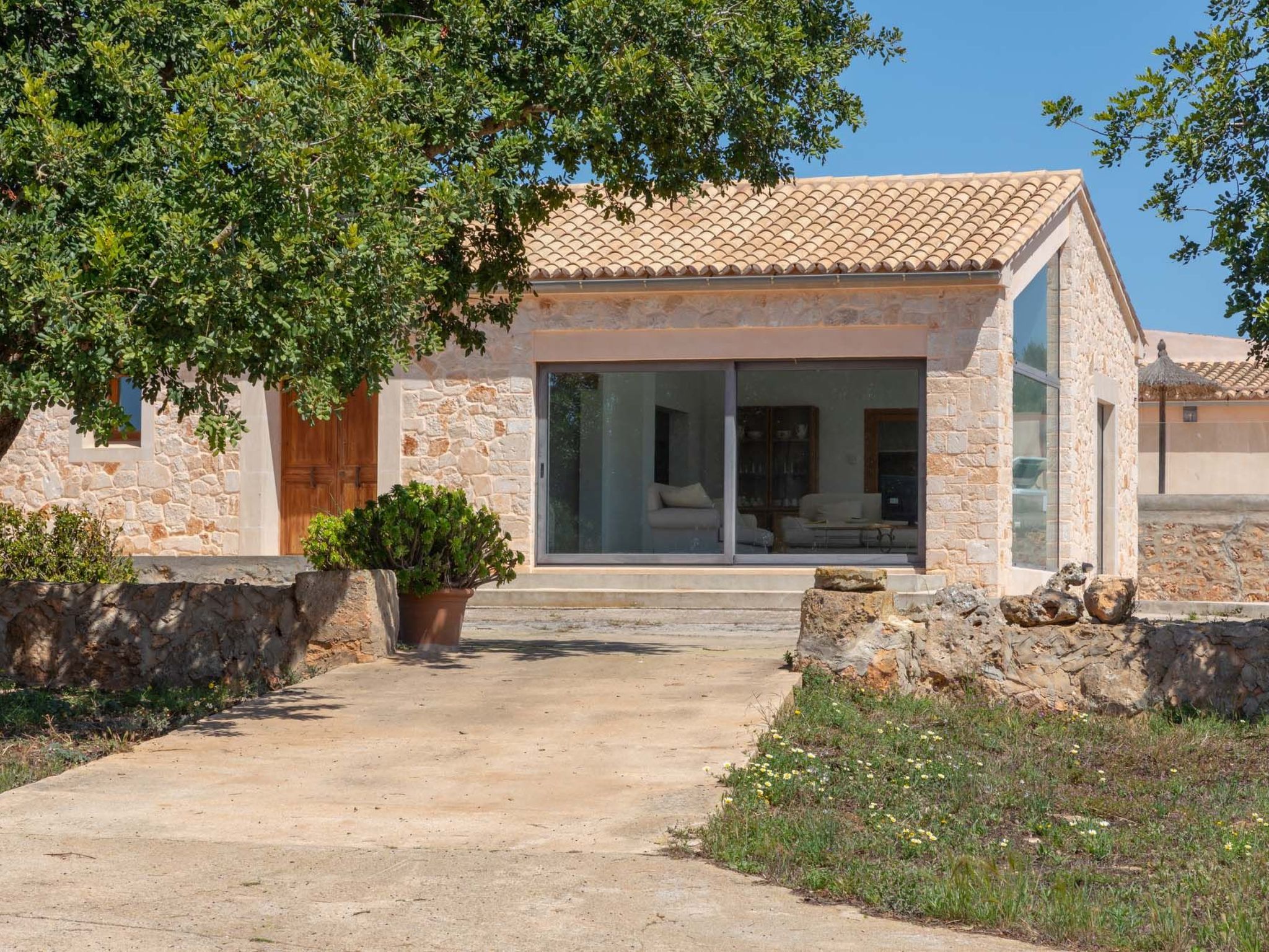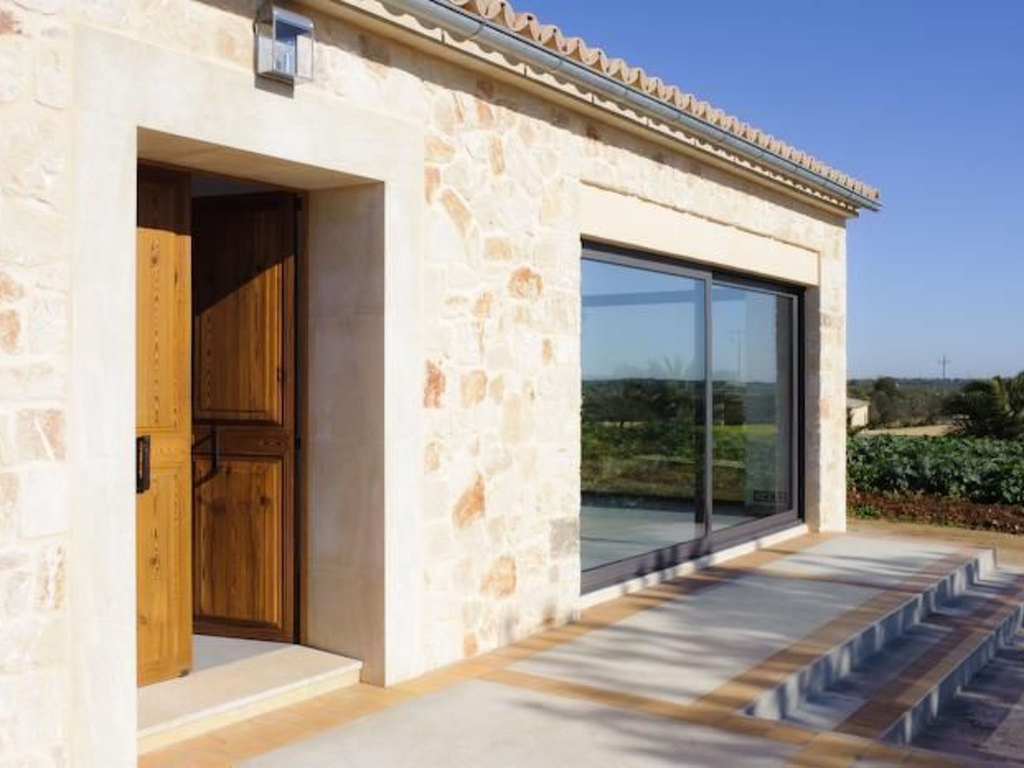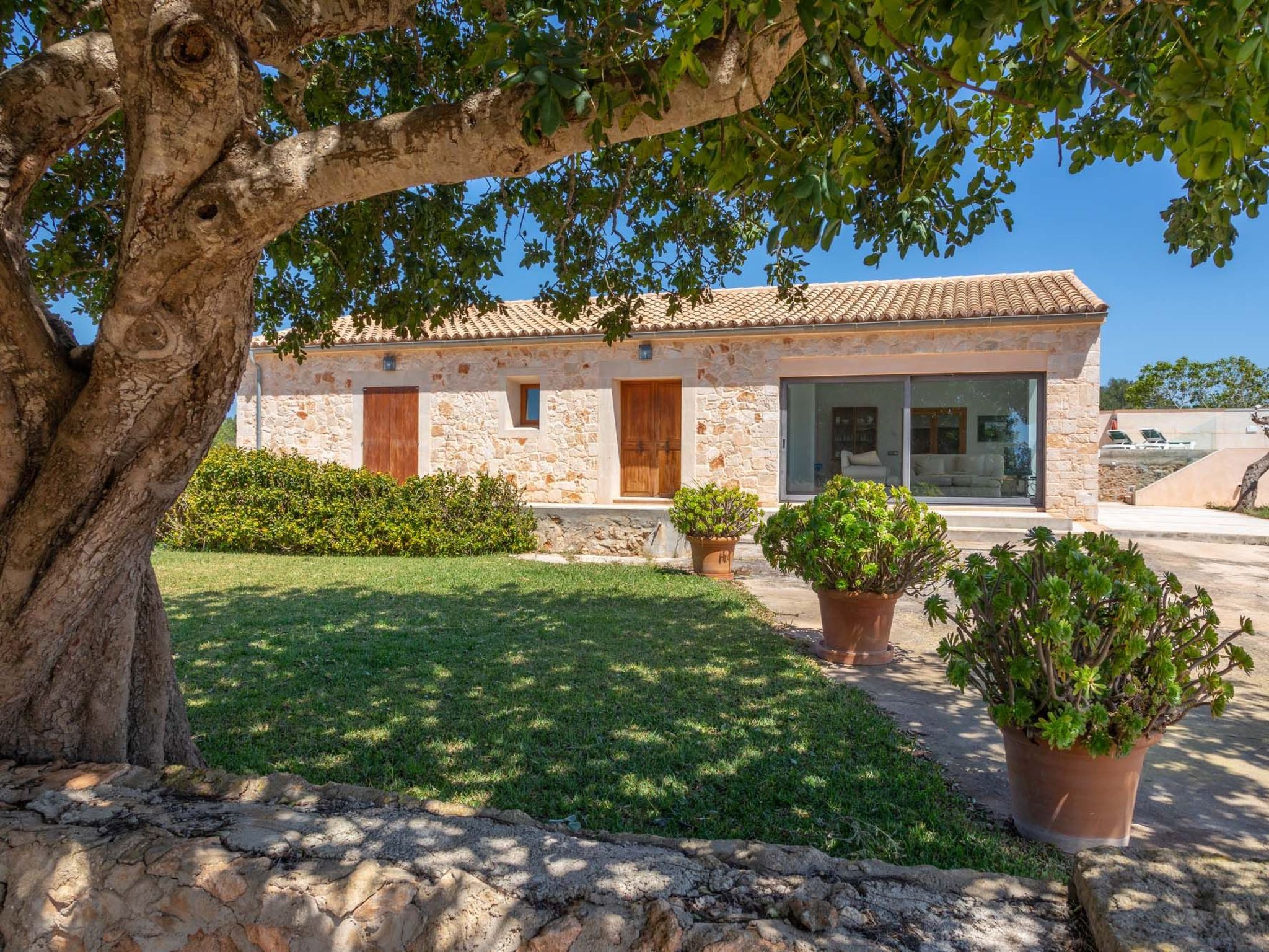 The old farmhouse has been completely renovated and transformed into a modern country house of 130m2. The house is tastefully furnished to a high standard. A door more than 200 years old welcomes the visitor. The entrance area leads to a bright, open-plan living and dining area and an open-plan kitchen. The living and dining area features an Italian teak designer table and cosy sofas. The entire area is flooded with light without being heated by the sunlight (special glazing) and offers a marvellous view of the surrounding area as far as the town of Santanyí in the distance. Large sliding glass doors lead out onto the front terrace. The dining area leads to the open-plan kitchen, which is equipped to a high standard. The house has two double bedrooms. One with walk-in shower en-suite and access to the rear, covered terrace, the other with en-suite bathroom and access to the front terrace.