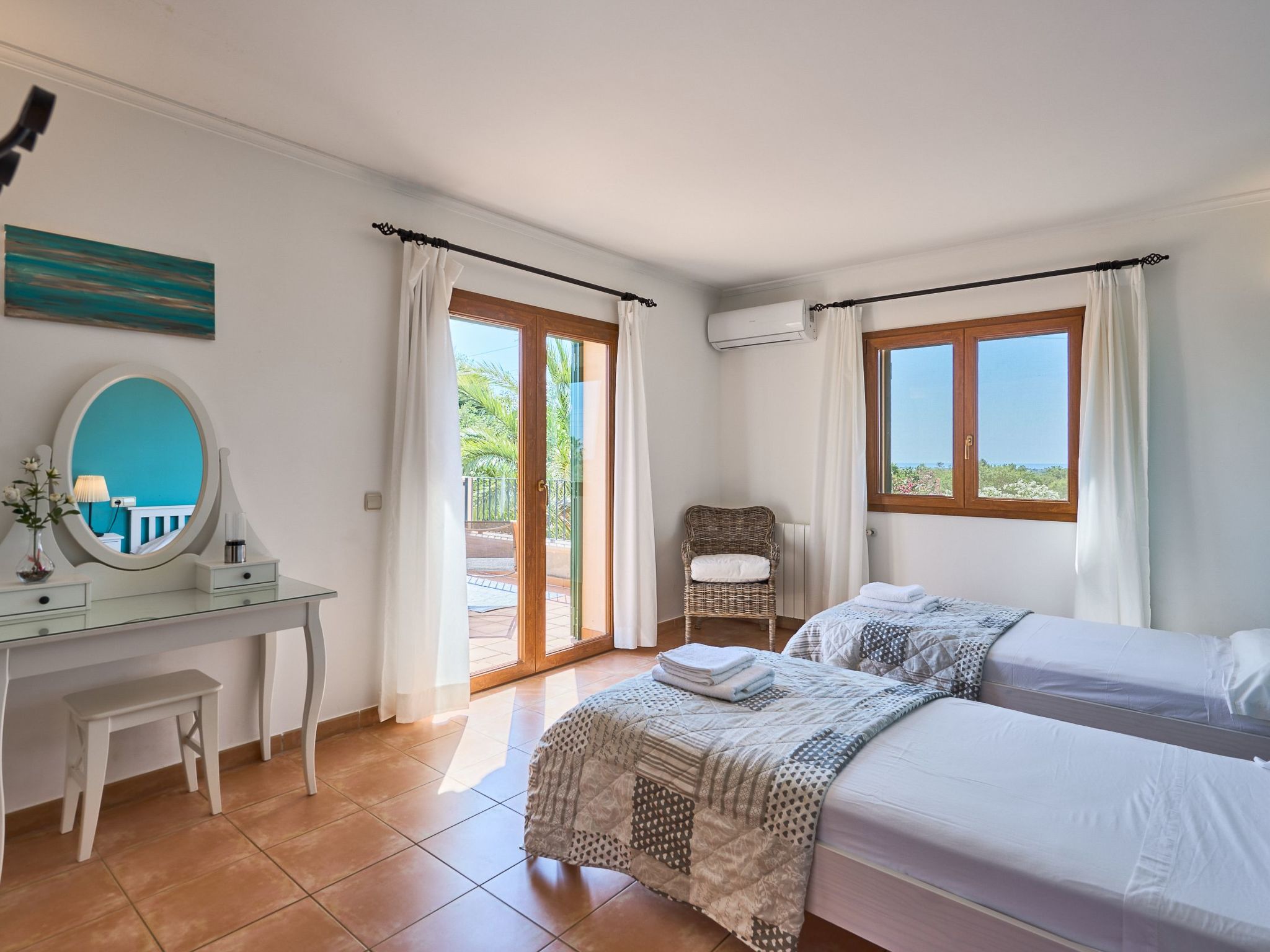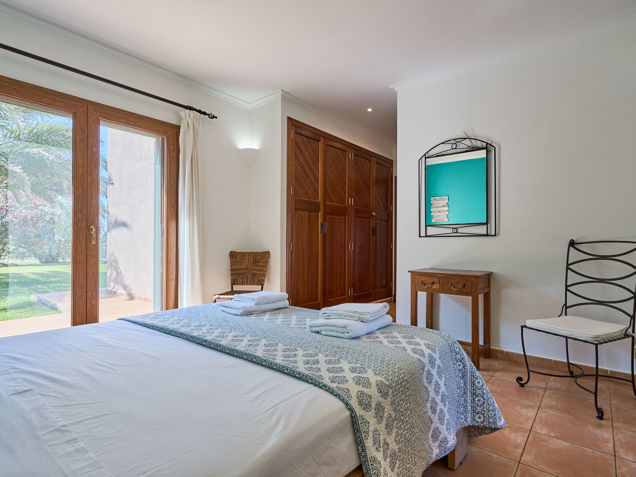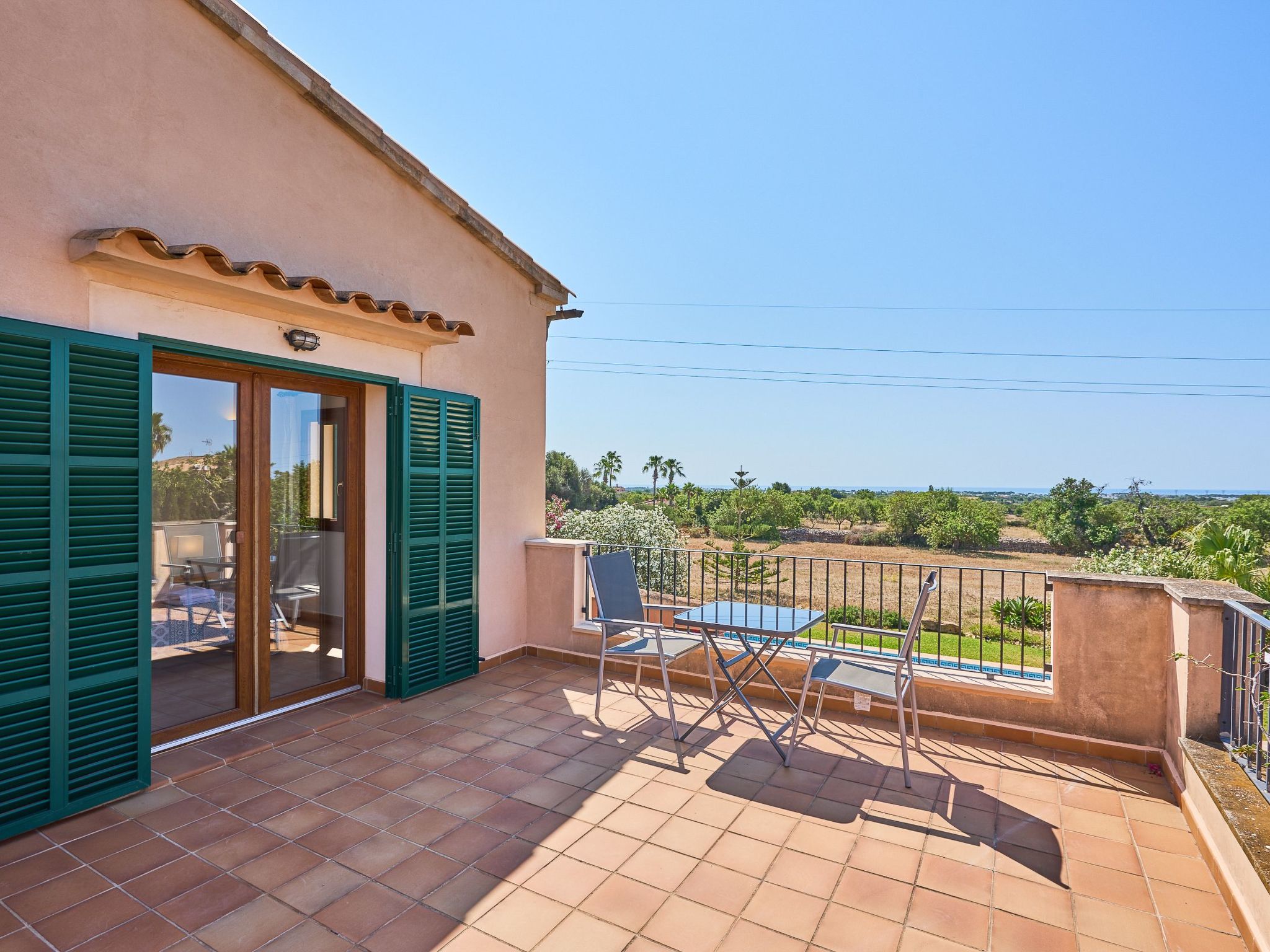Inside the two-storey country house, you will find an inviting interior. The ground floor enchants with an open-plan living/dining room, which offers direct access to the veranda and pool area. A spacious kitchen with a small breakfast table connects directly to the dining room and leads on to the magnificent garden. For your convenience there is a utility room with washing machine. Three double bedrooms - two with shared shower room, the third with en suite bathroom and garden access - already provide comfortable living space here. There are two additional bedrooms on the upper floor: a twin bedroom with en suite bathroom and private terrace and a further double bedroom with en suite shower room and private terrace.