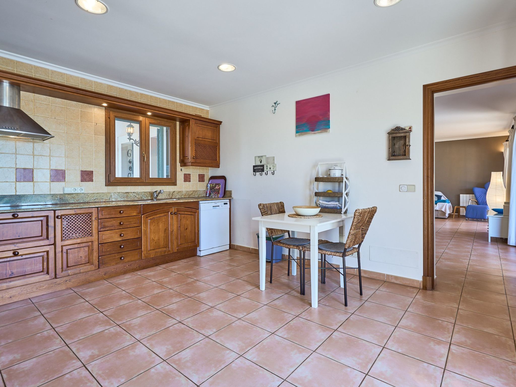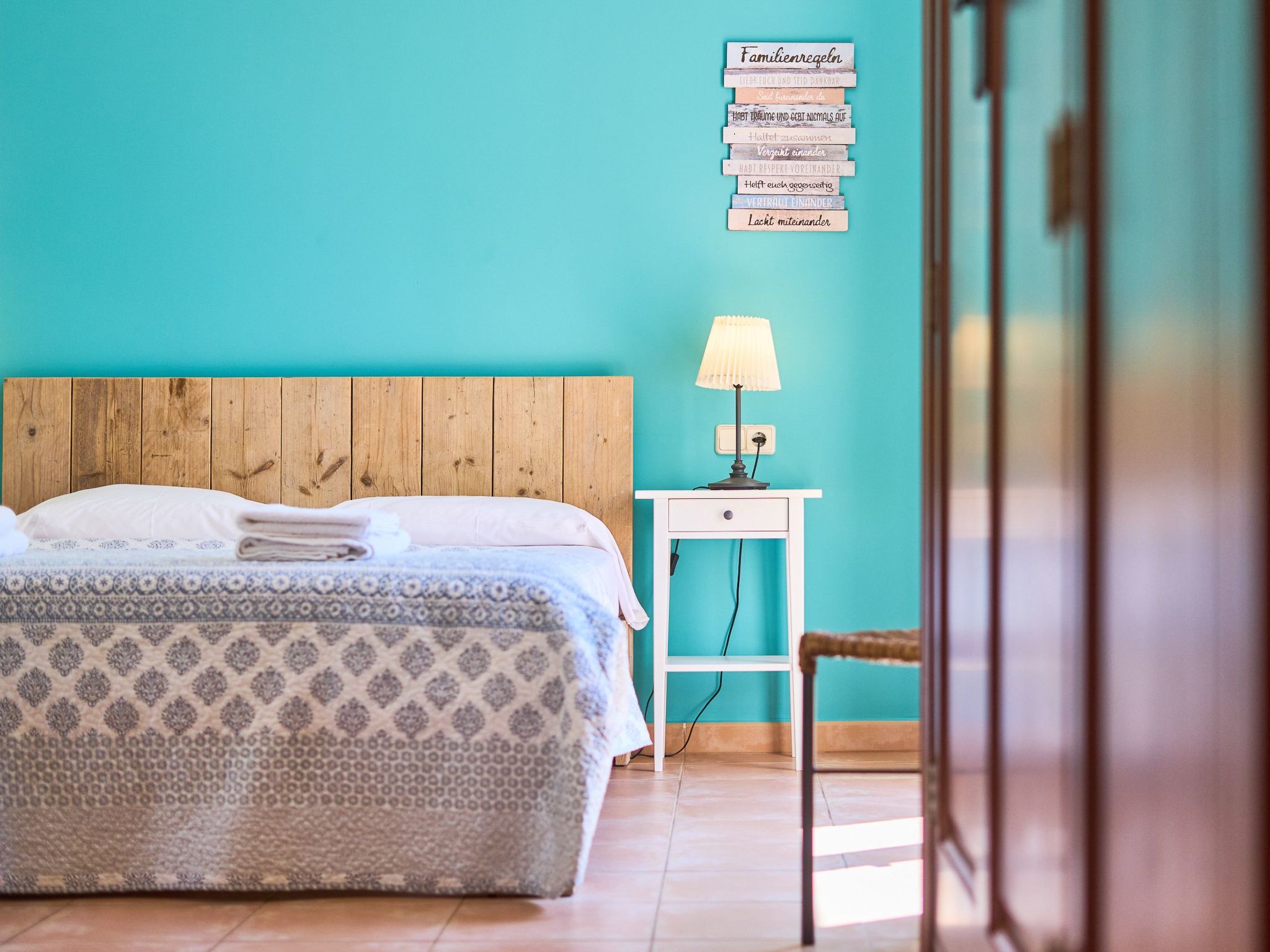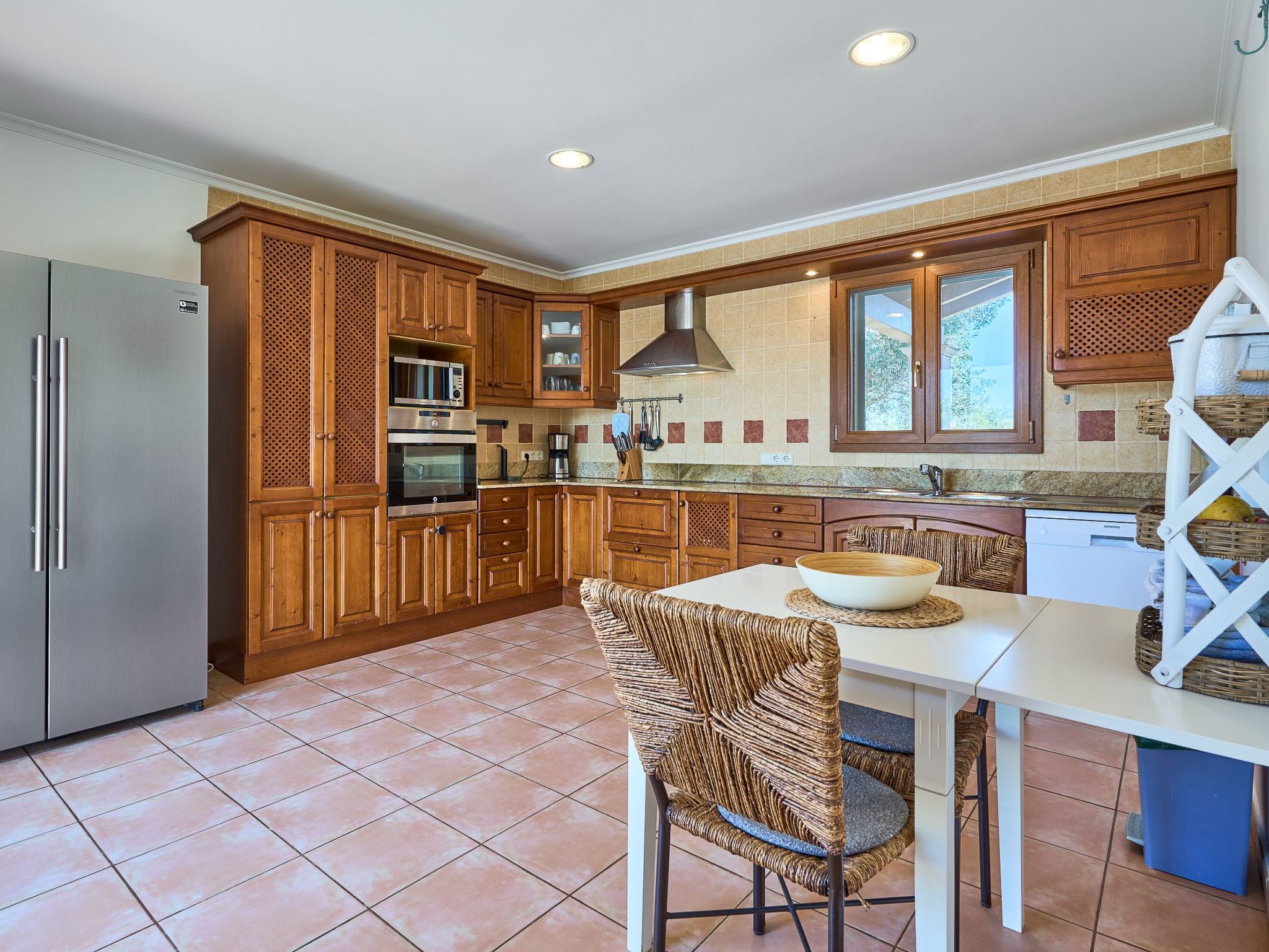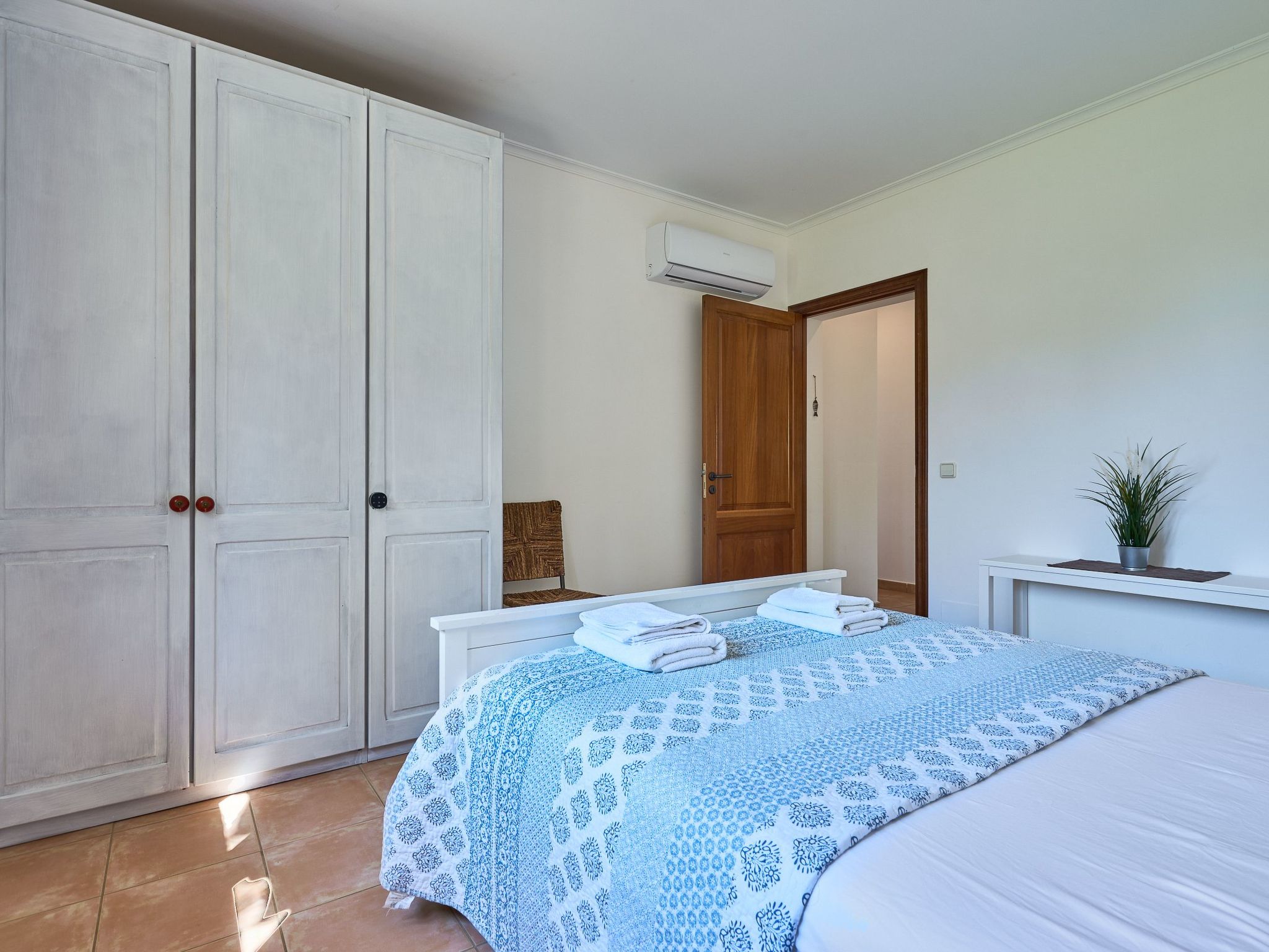 Inside the two-storey country house, you will find an inviting interior. The ground floor enchants with an open-plan living/dining room, which offers direct access to the veranda and pool area. A spacious kitchen with a small breakfast table connects directly to the dining room and leads on to the magnificent garden. For your convenience there is a utility room with washing machine. Three double bedrooms - two with shared shower room, the third with en suite bathroom and garden access - already provide comfortable living space here. There are two additional bedrooms on the upper floor: a twin bedroom with en suite bathroom and private terrace and a further double bedroom with en suite shower room and private terrace.