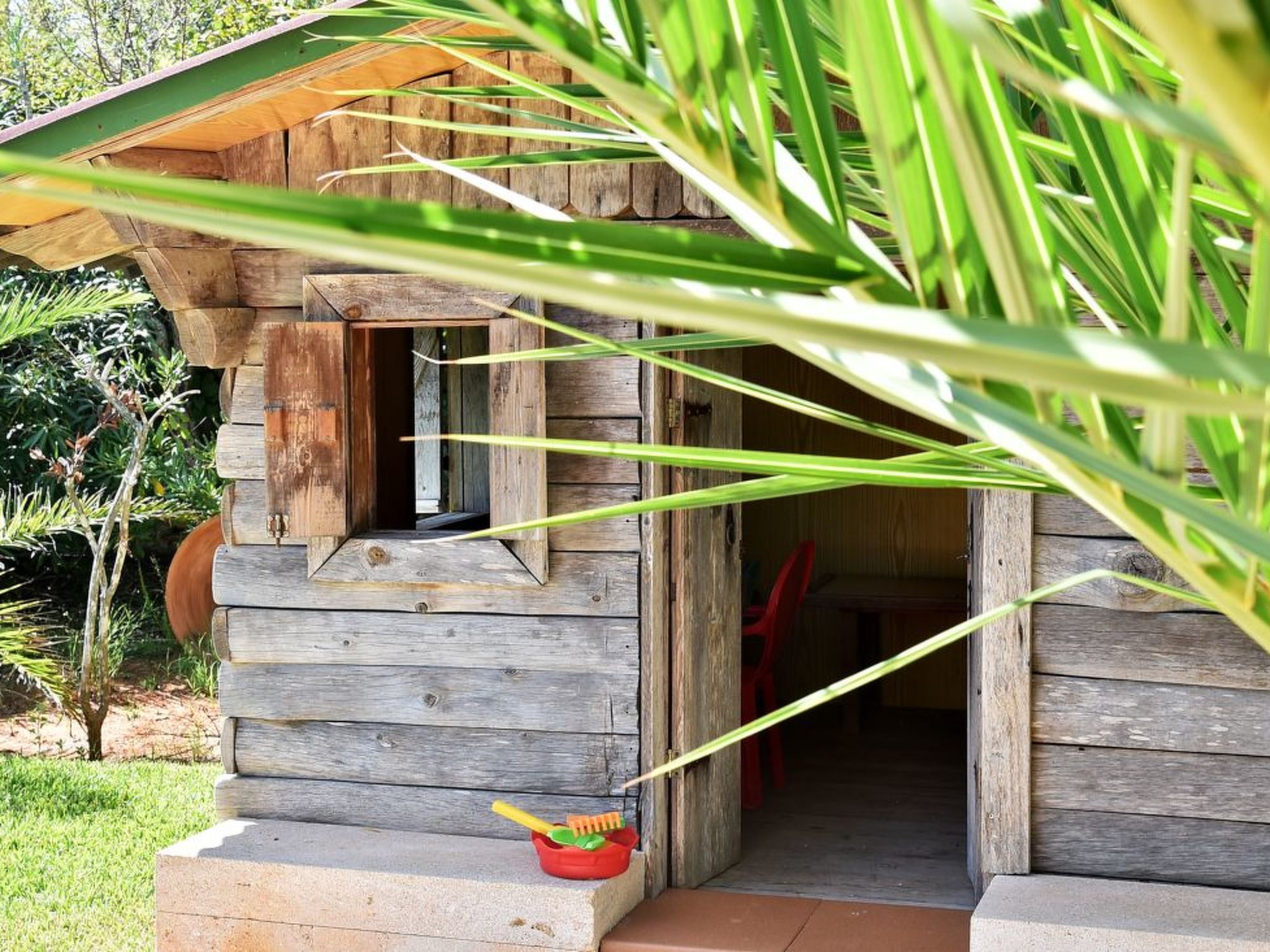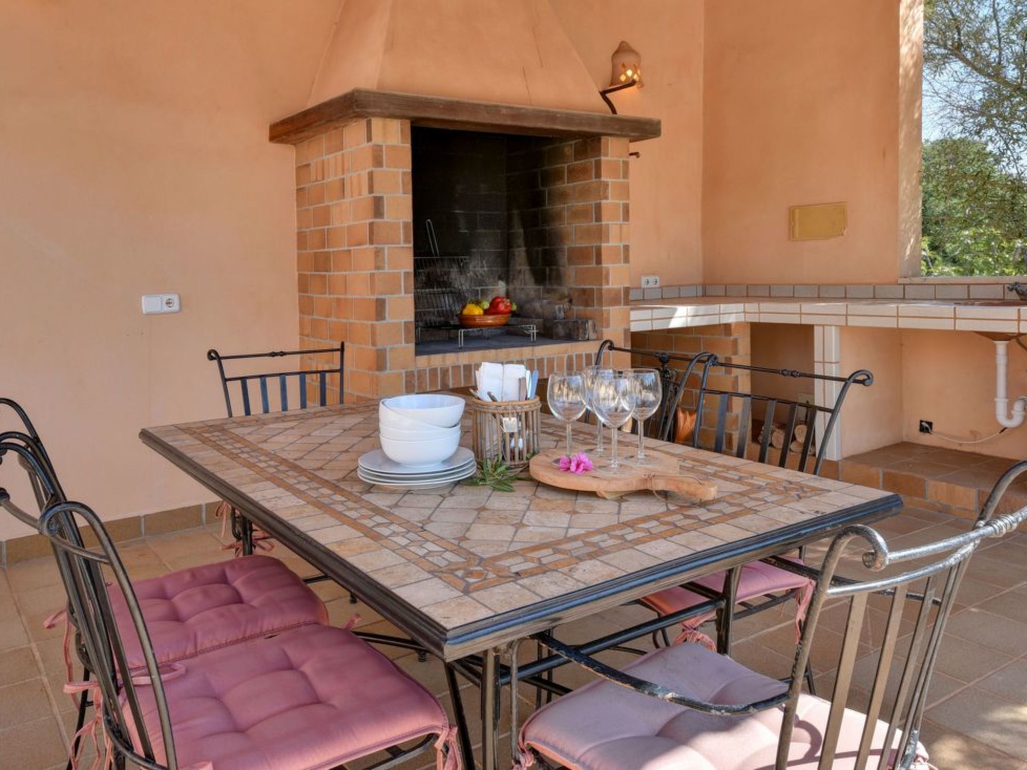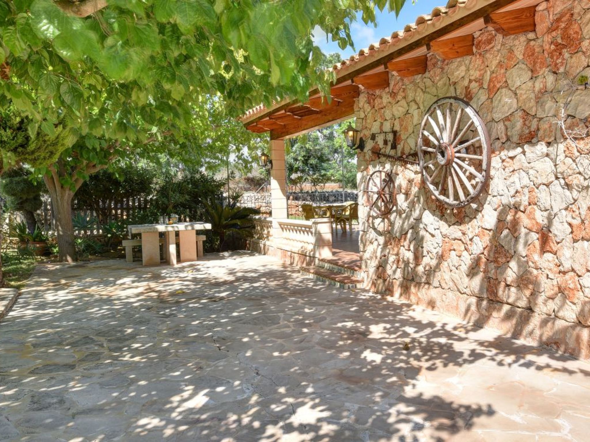 The outdoor area is beautifully landscaped with well-tended, large lawns and Mediterranean plants. The large pool with Roman steps and sun terrace is the ideal place to enjoy the long summer days. A large covered barbecue area overlooking the pool is a real highlight and children will also love the wooden house in the garden and the table tennis table. The entire property is enclosed by a natural stone wall. The entrance and driveway are closed with garden gates.