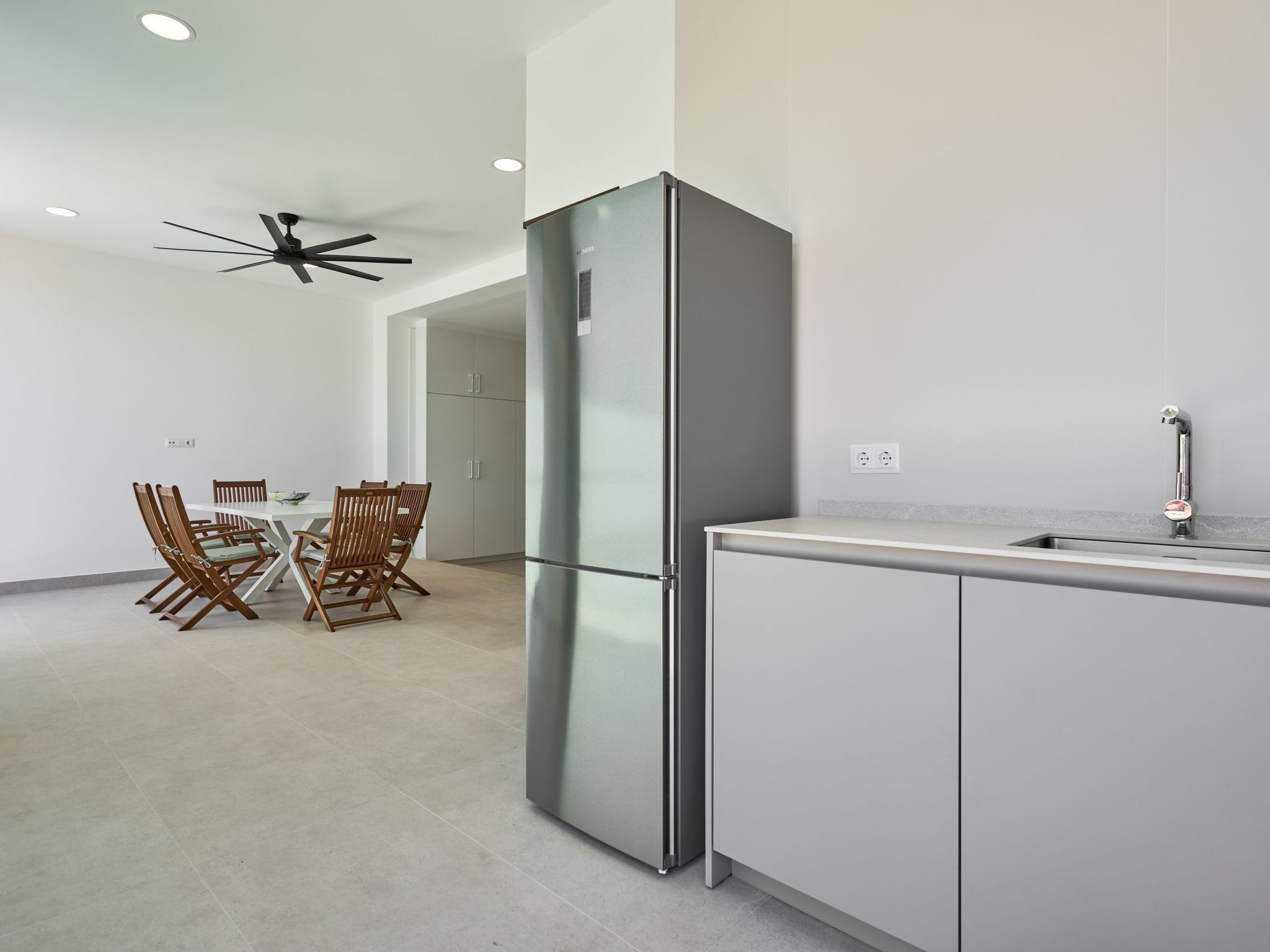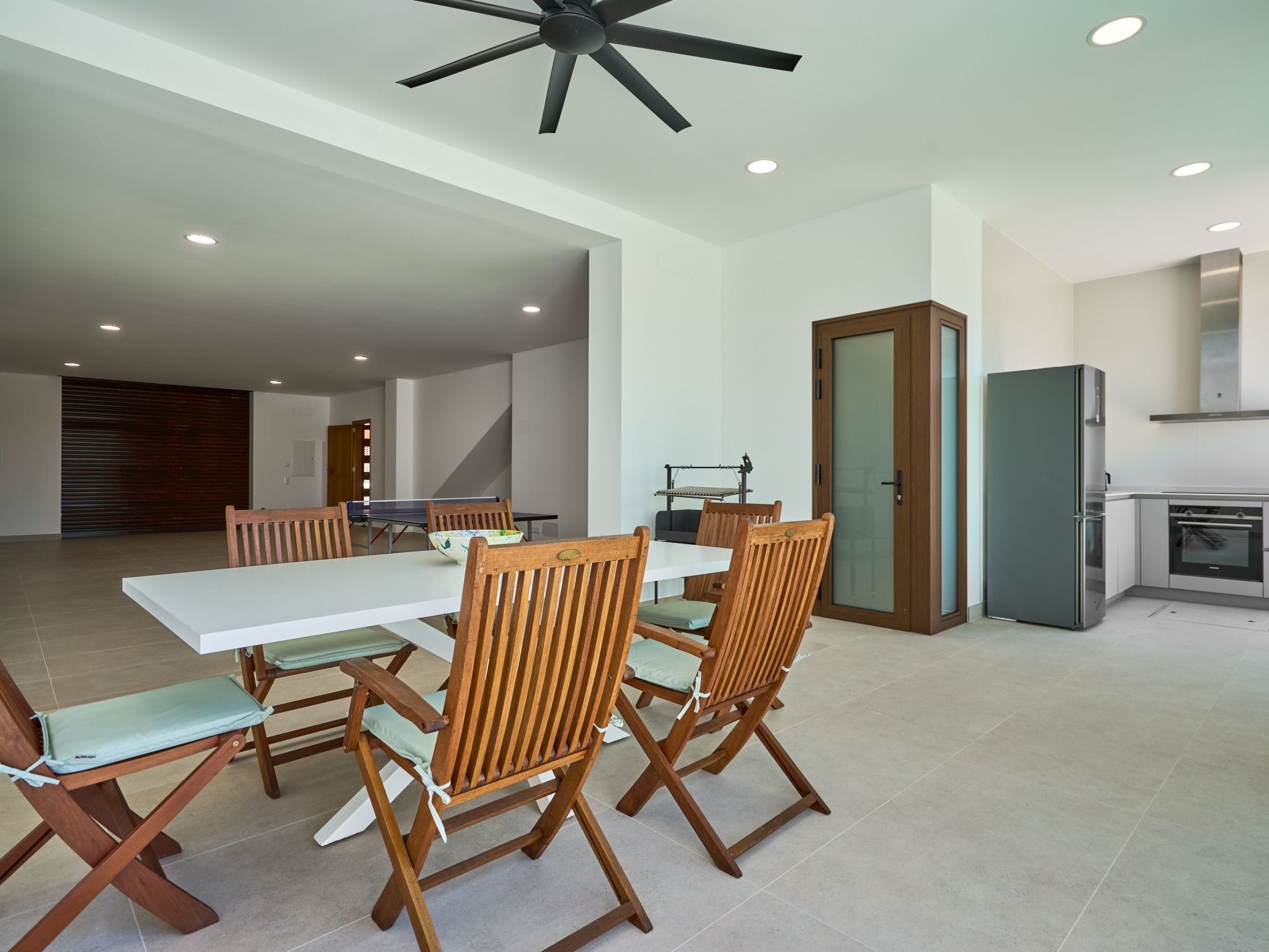 On the ground floor there is a garage with space for 3 cars. From the garage there is access to the back of the house where there is a porch with ceiling fan that houses an additional kitchen with dishwasher, ceramic hob, sink and large fridge.