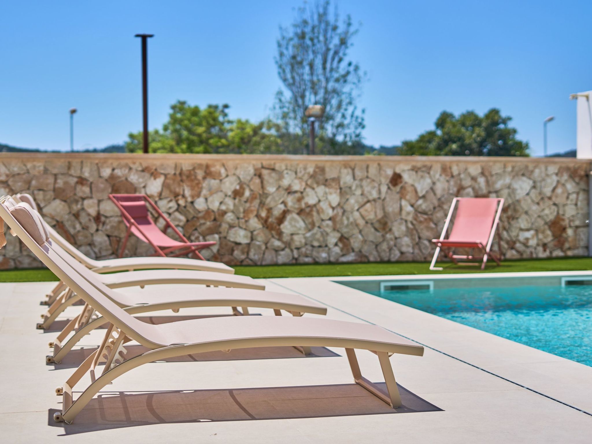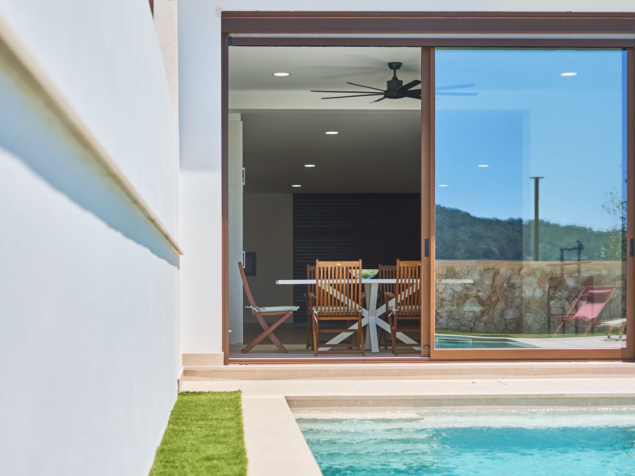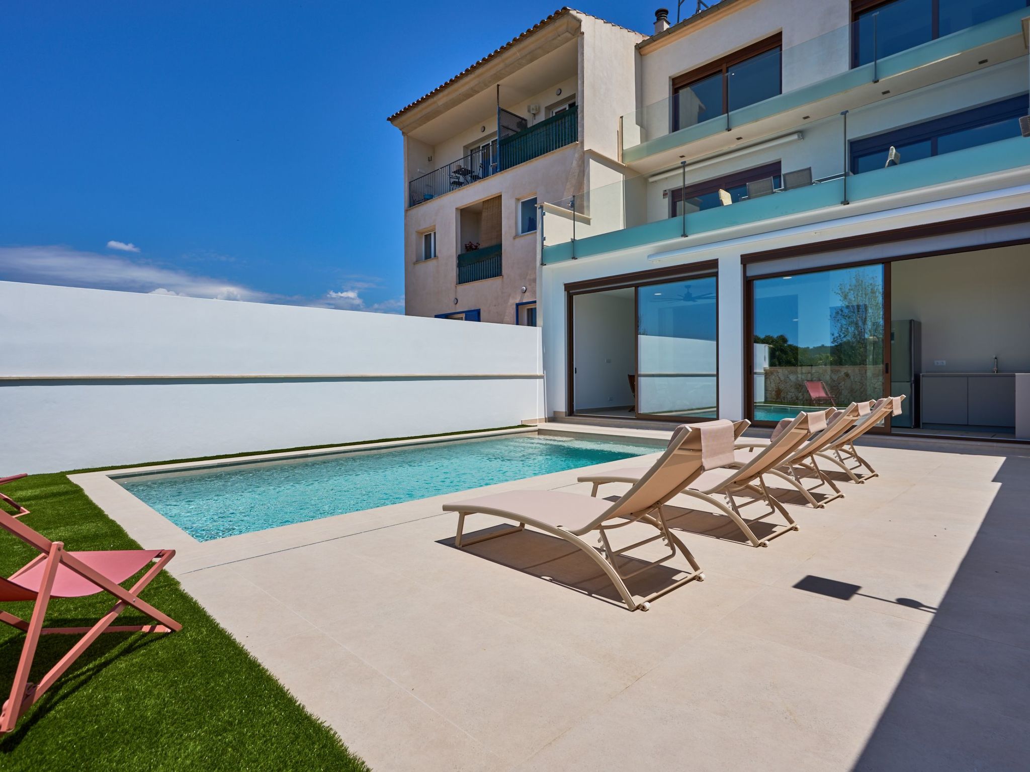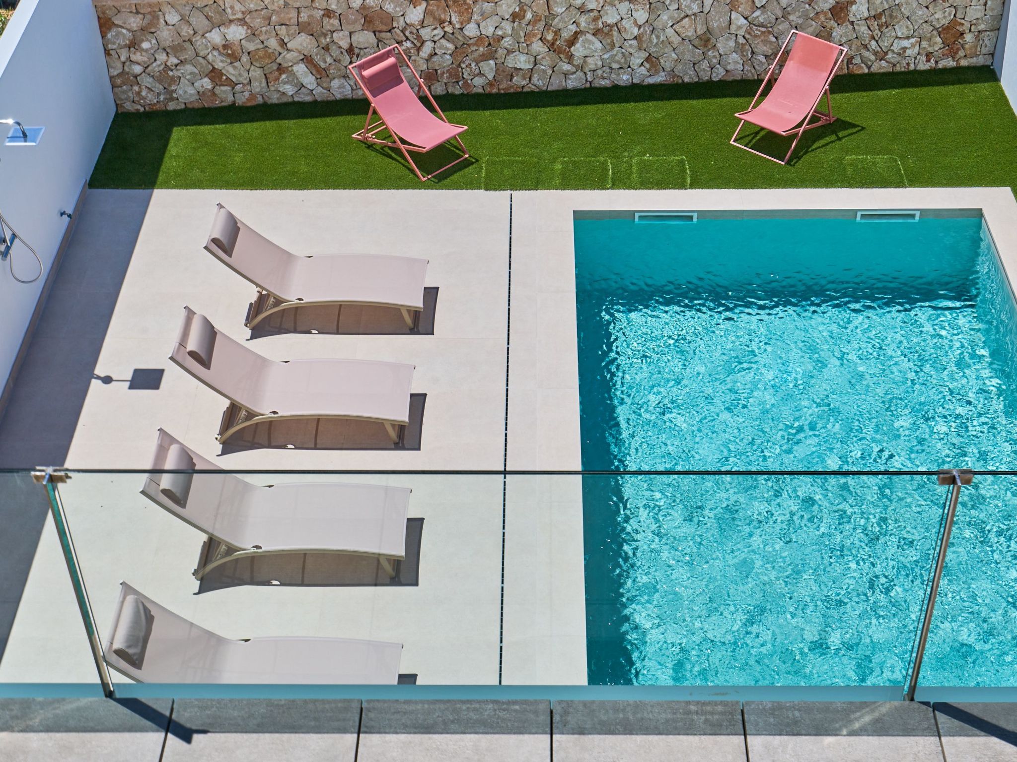 In this area is the pool with awning and a wide access staircase where you can sit and relax in the water like on a beach. Lawn area next to the pool.