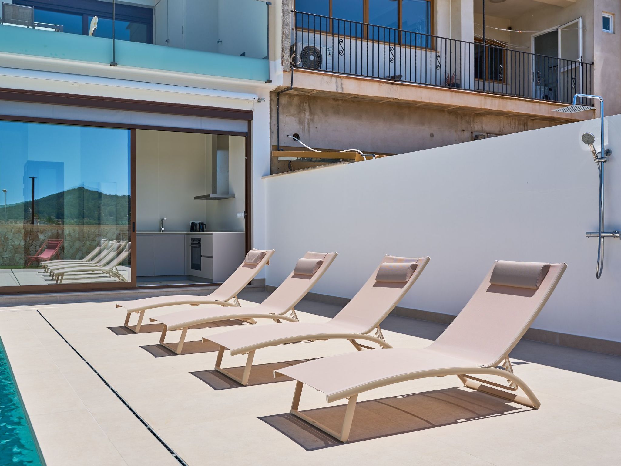 Outdoor shower next to the pool with hot and cold water.