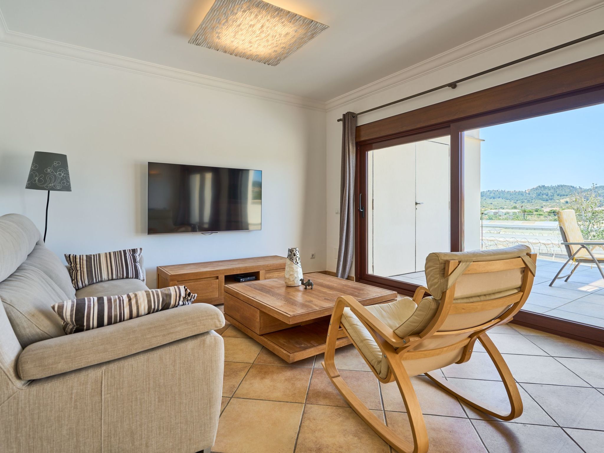 The house is distributed over three floors. From the main entrance, a staircase leads to the floor, where there is a spacious living-dining room and an open-plan kitchen with access to a terrace with uninterrupted views of the beautiful and slightly hilly surroundings. There is a washing machine and tumble dryer on the terrace. On this floor there are also two double bedrooms and a bathroom with bath and separate shower. An internal staircase leads to the top floor where the master bedroom with double bed and en-suite bathroom with whirlpool bath and separate shower is located. On this floor there is a large room where children can play.