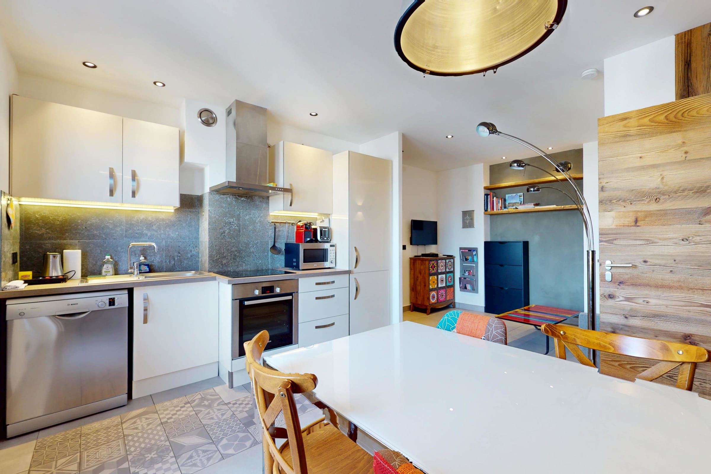 Une cuisine équipée et fonctionnelle dans une belle pièce de vie lumineuse et un confortable canapé lit