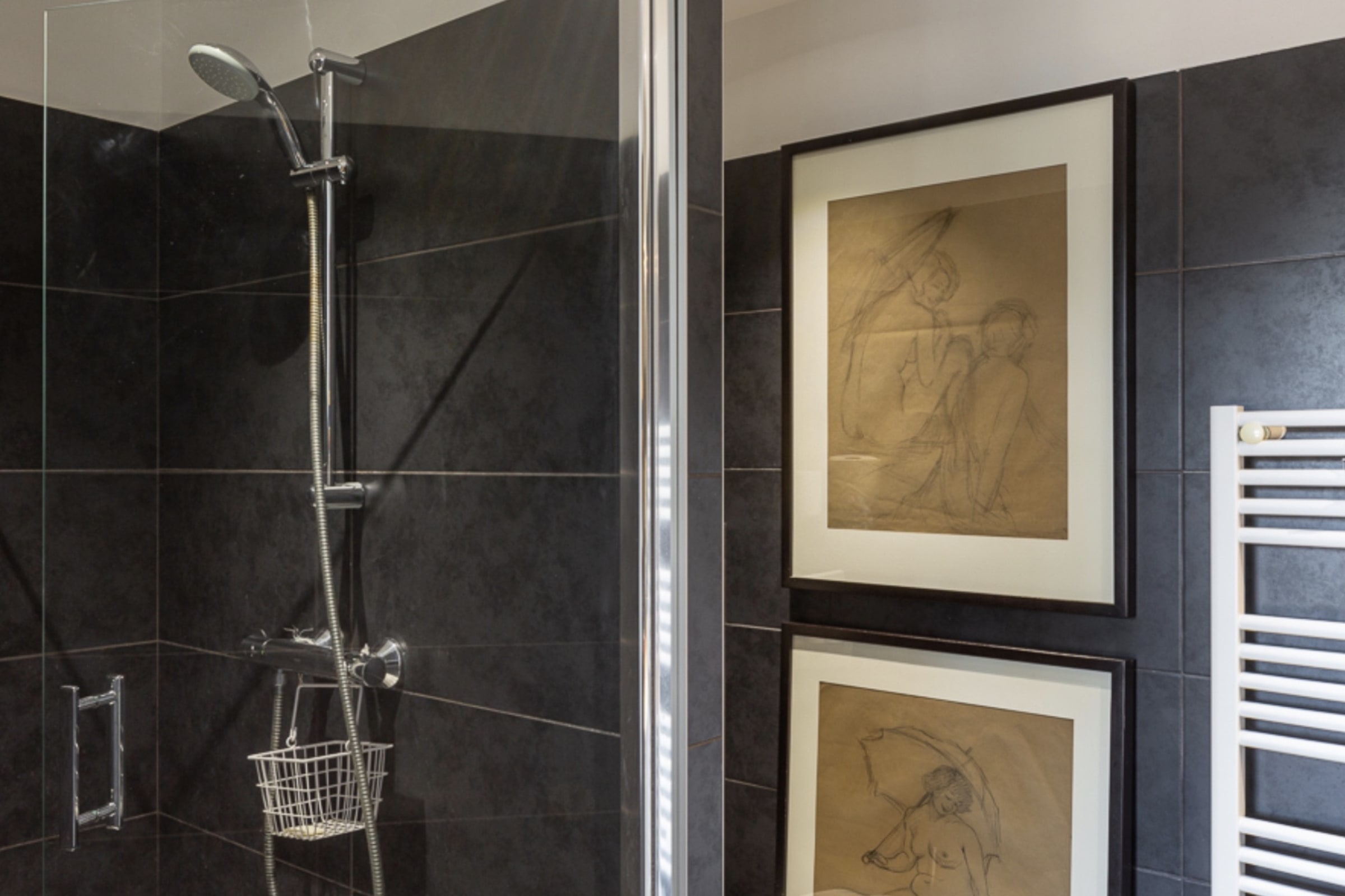 - one bedroom with queen-size bed and en-suite bathroom with shower and WC,