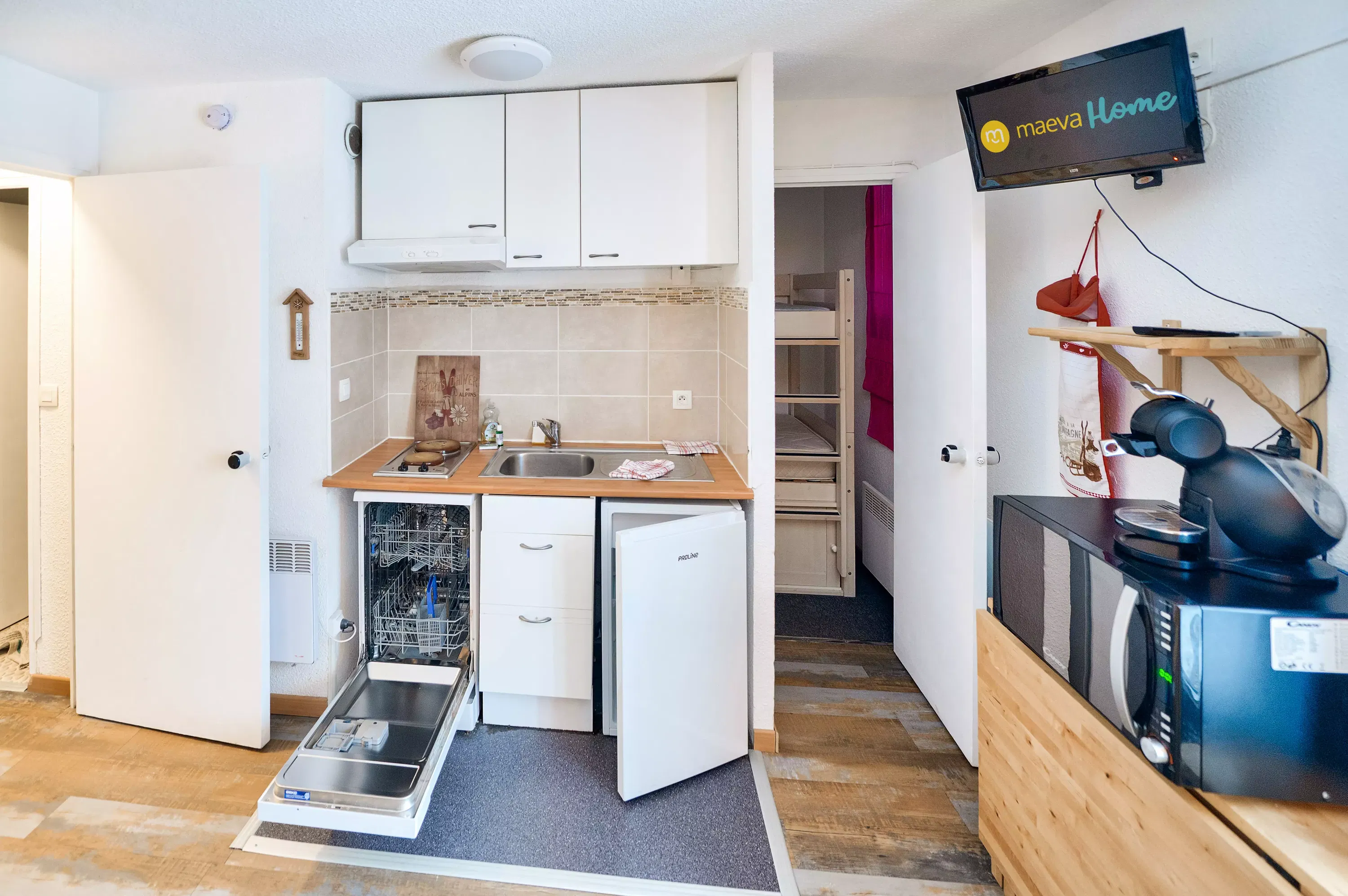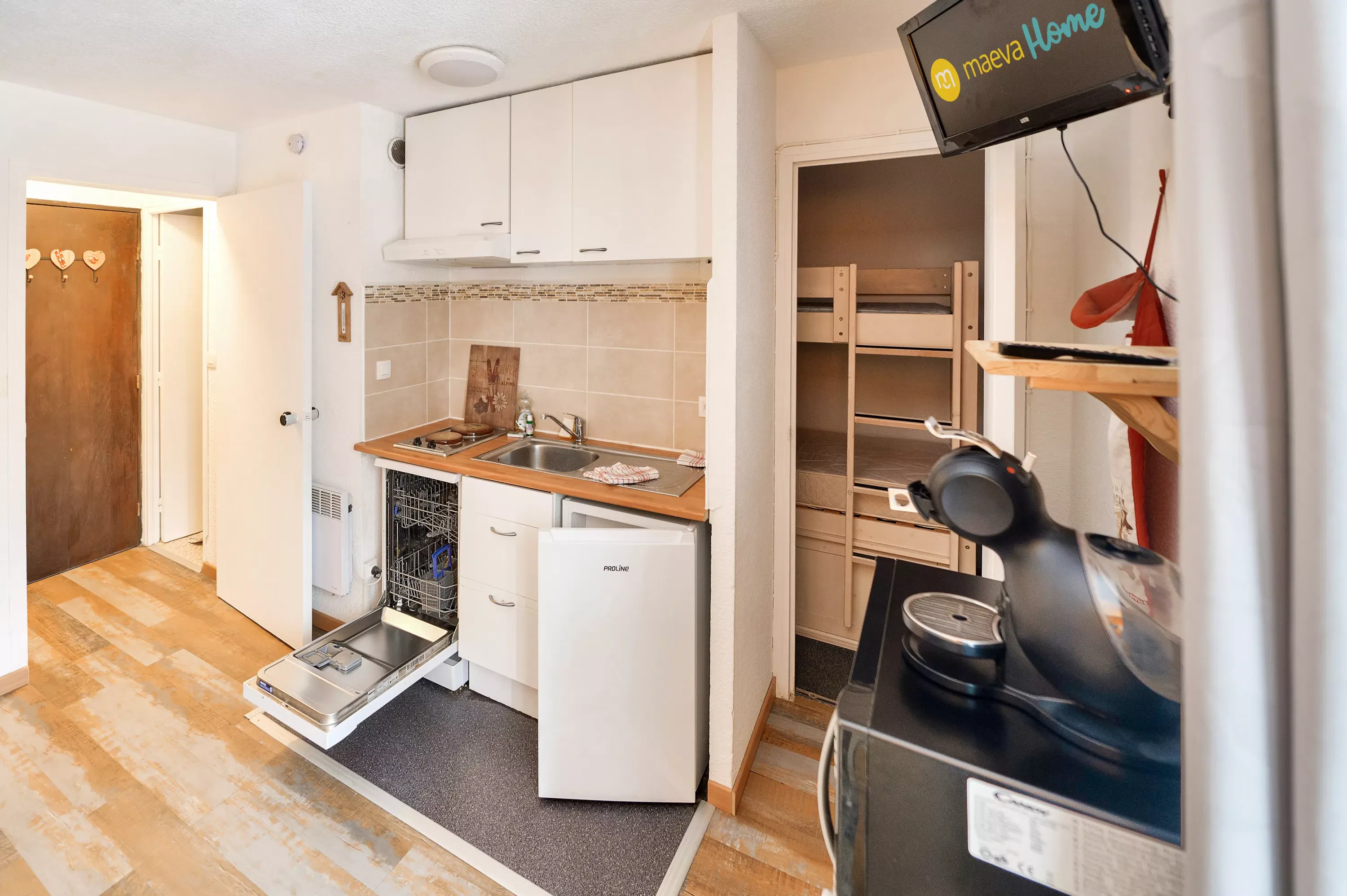The advantages of your rental: Ideally located at the foot of the slopes, in the heart of the village, this apartment is an excellent starting point for a hassle-free mountain holiday. Situated on the floor, it features a north-facing balcony and a functional layout with a living room equipped with a sofa bed and a separate sleeping alcove with bunk beds, maximizing sleeping space. Less than 100 meters from shops, activities, and ski lifts, this accommodation is perfect for a convenient and accessible ski-in/ski-out holiday.