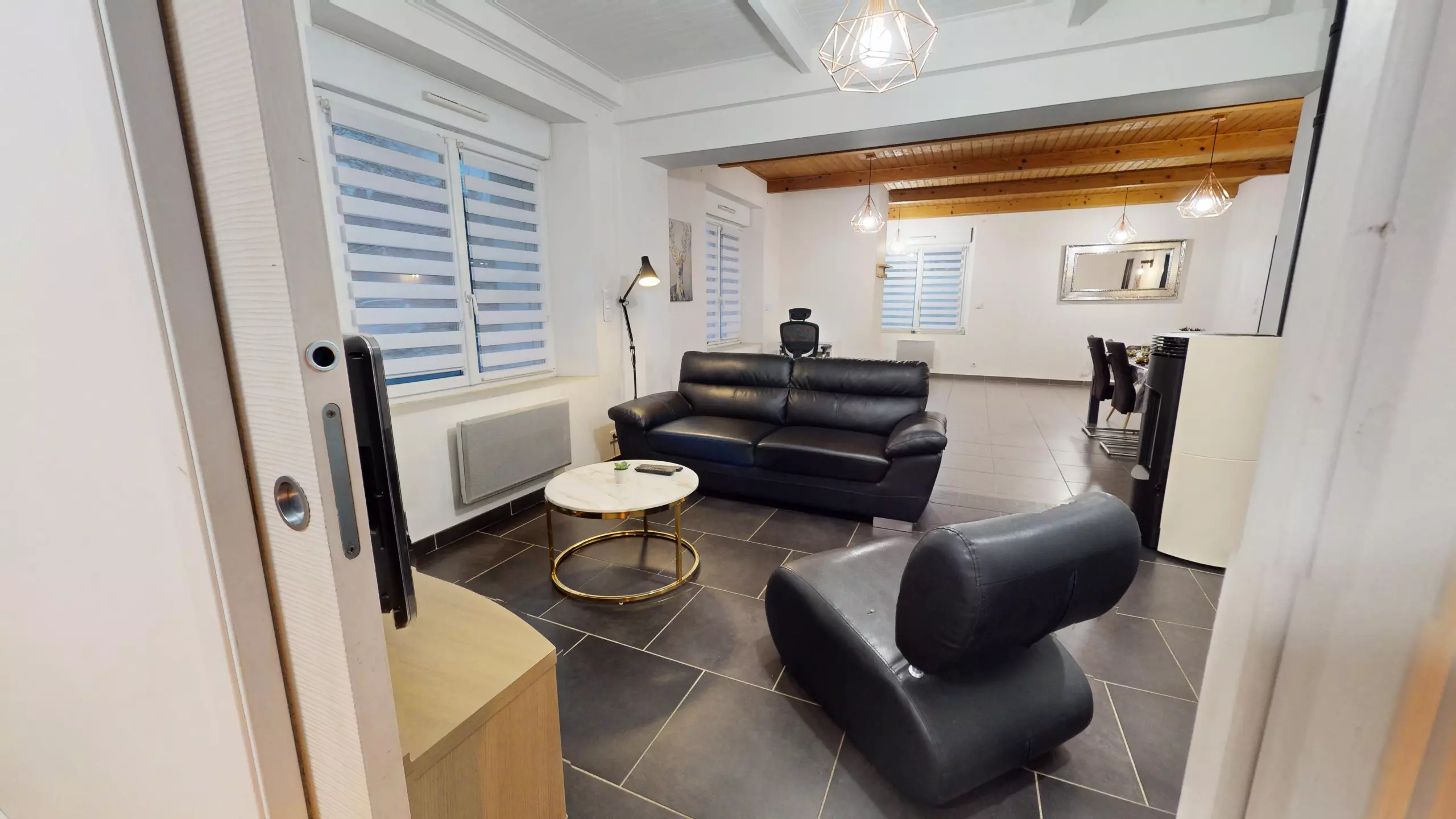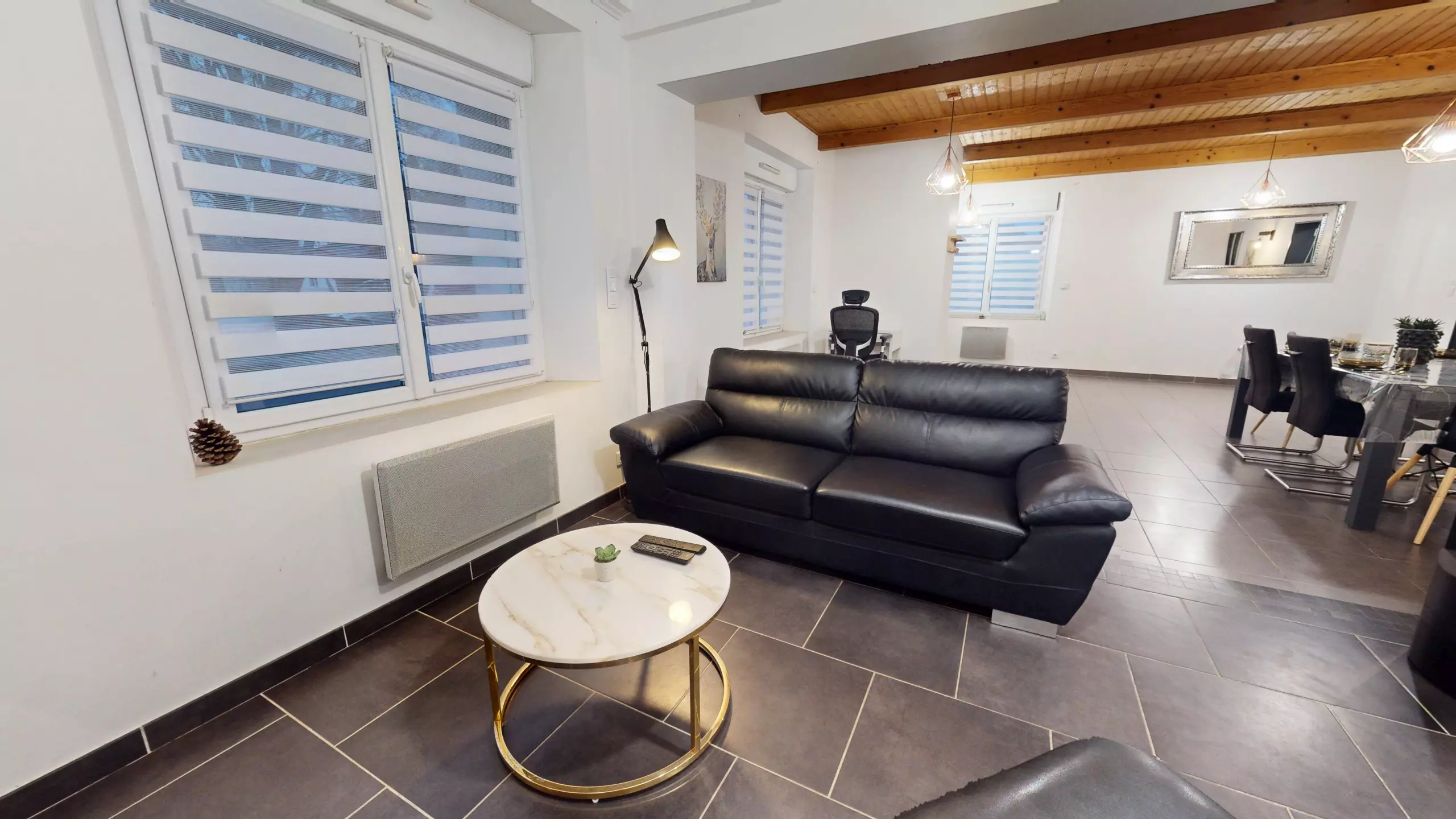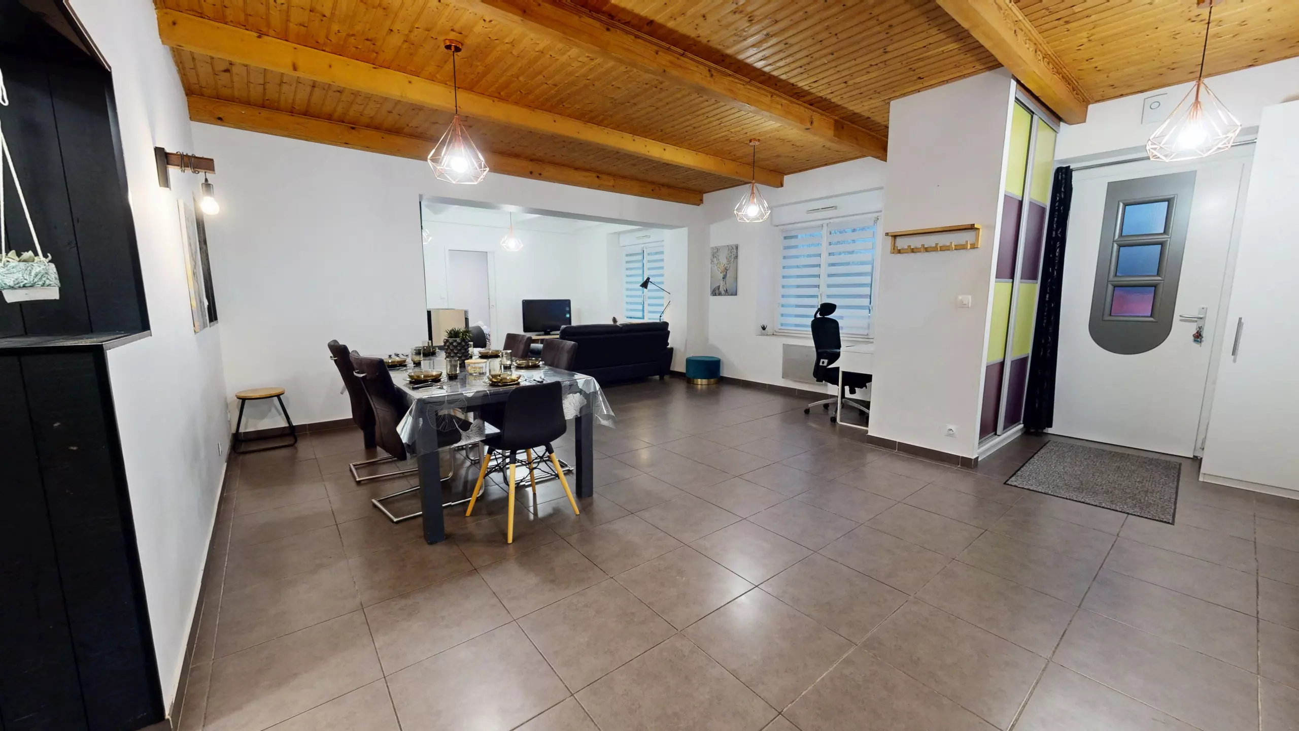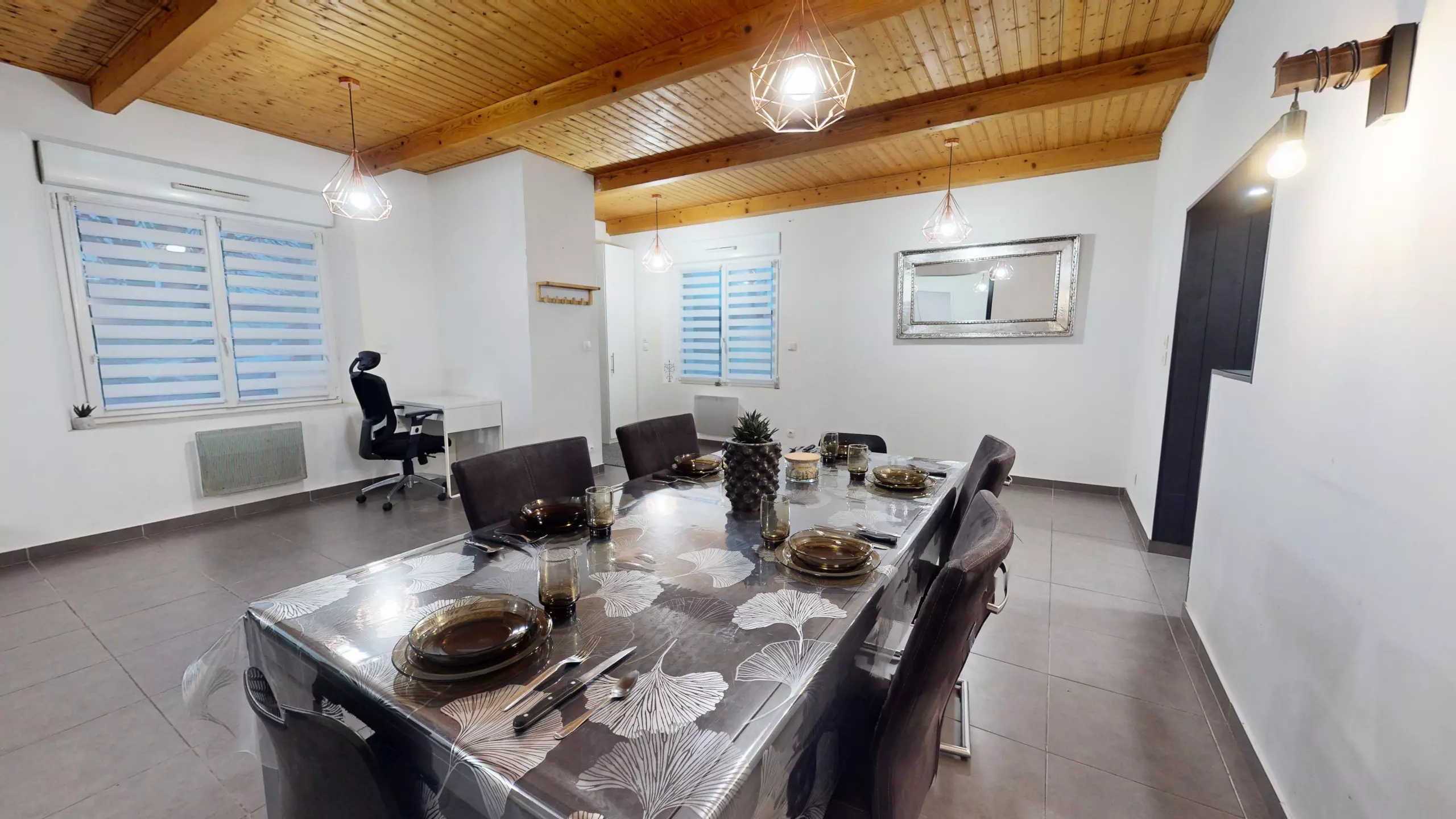 Upon entering, you will discover a large, modern dining room with a beautiful family table and an office area, perfect for sharing meals or working remotely.