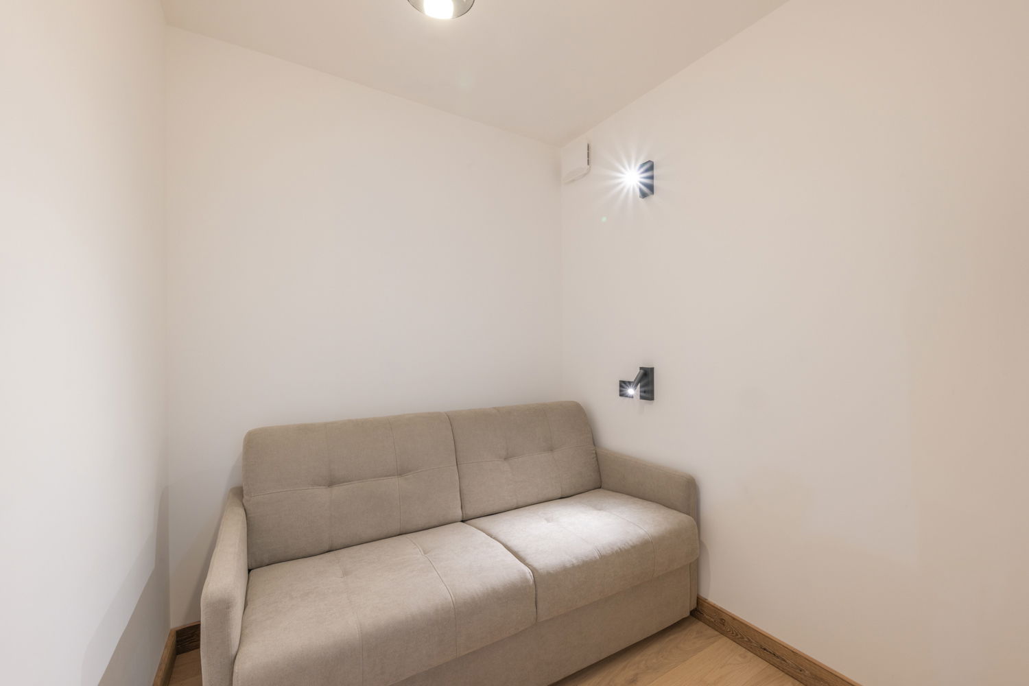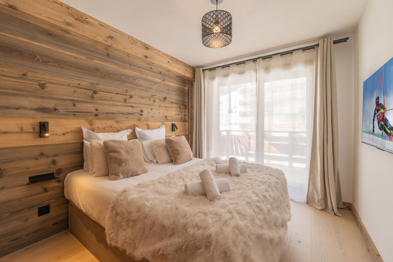 The elegant apartment La Belle Aurore A403, measuring 59 sqm and located on the 4th floor, can accommodate up to 6 guests. It features one double bedroom and two mountain alcoves (the suitable for 2 children with single beds, and the second with a convertible sofa bed for 2 adults). These two mountain alcoves are a rare asset, as they allow for flexible layouts. The apartment can accommodate either 2 adults and 4 children or 4 adults and 2 children. Access to a private north-facing balcony from the living room completes this property.