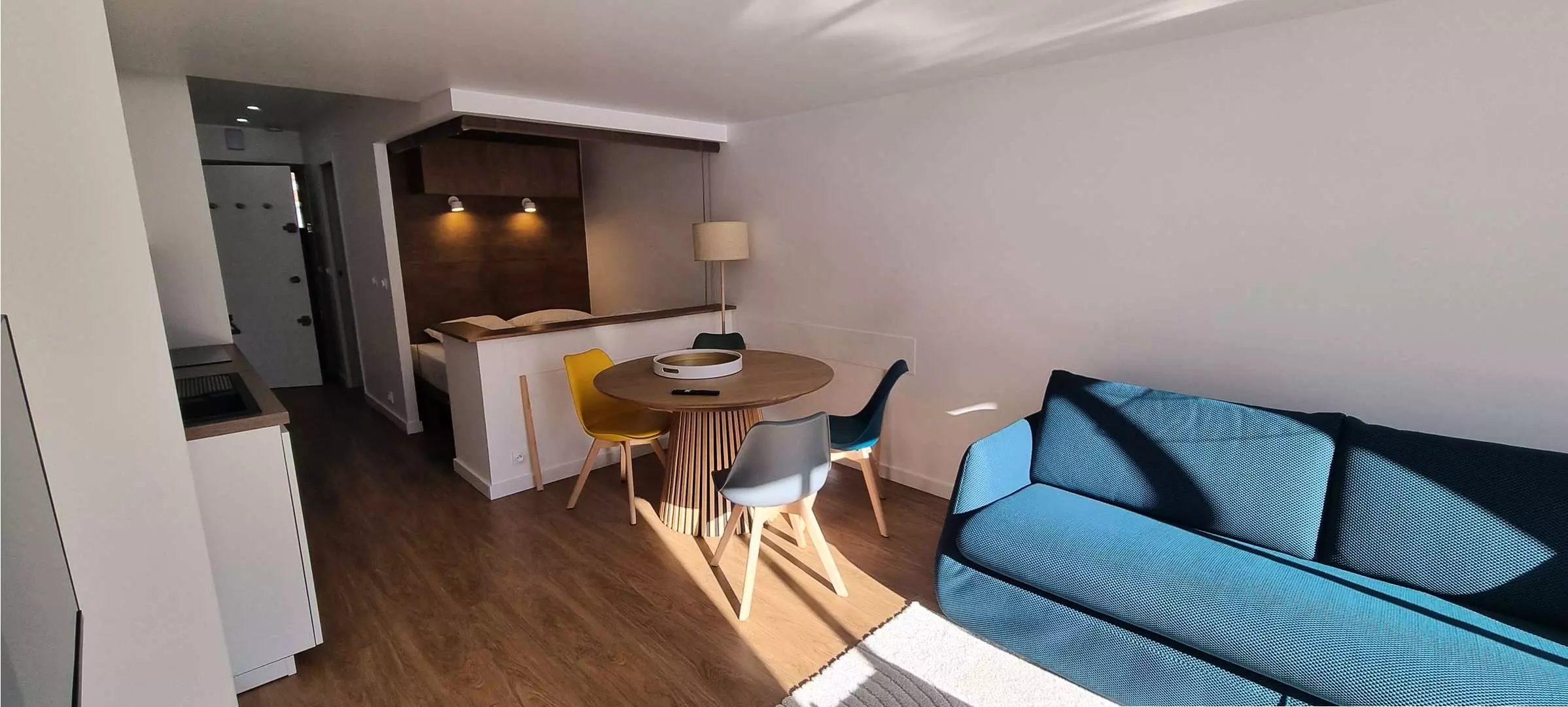 VRF8 renovated apartment, located on the 6th floor with a bay window, facing southwest. The building is situated in the "Front de Neige" complex, at the foot of the slopes, in close proximity to the shopping arcade and the resort's activities. The living room has a double sofa bed (140cm) and a double sleeping alcove in the lounge area. There is a shower room and toilet, and a fully equipped kitchen. Internet access is included.