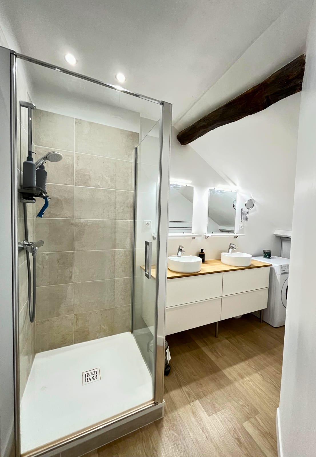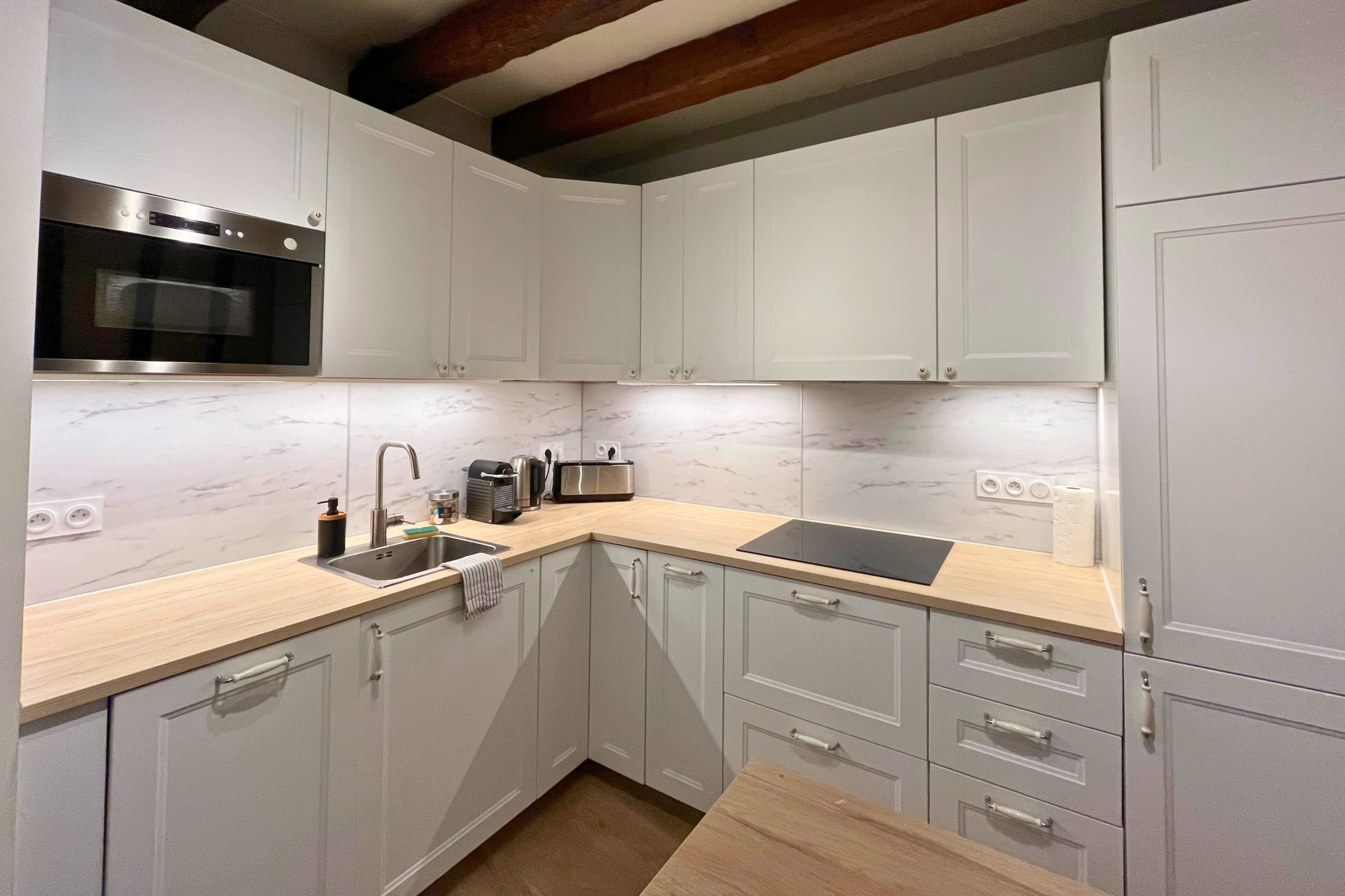 Upon arrival, you’ll find a modern, fully equipped kitchen with a refrigerator, freezer, dishwasher, microwave, kettle, Nespresso coffee machine, and toaster. A high table is perfect for a quick breakfast or morning coffee before exploring the city.