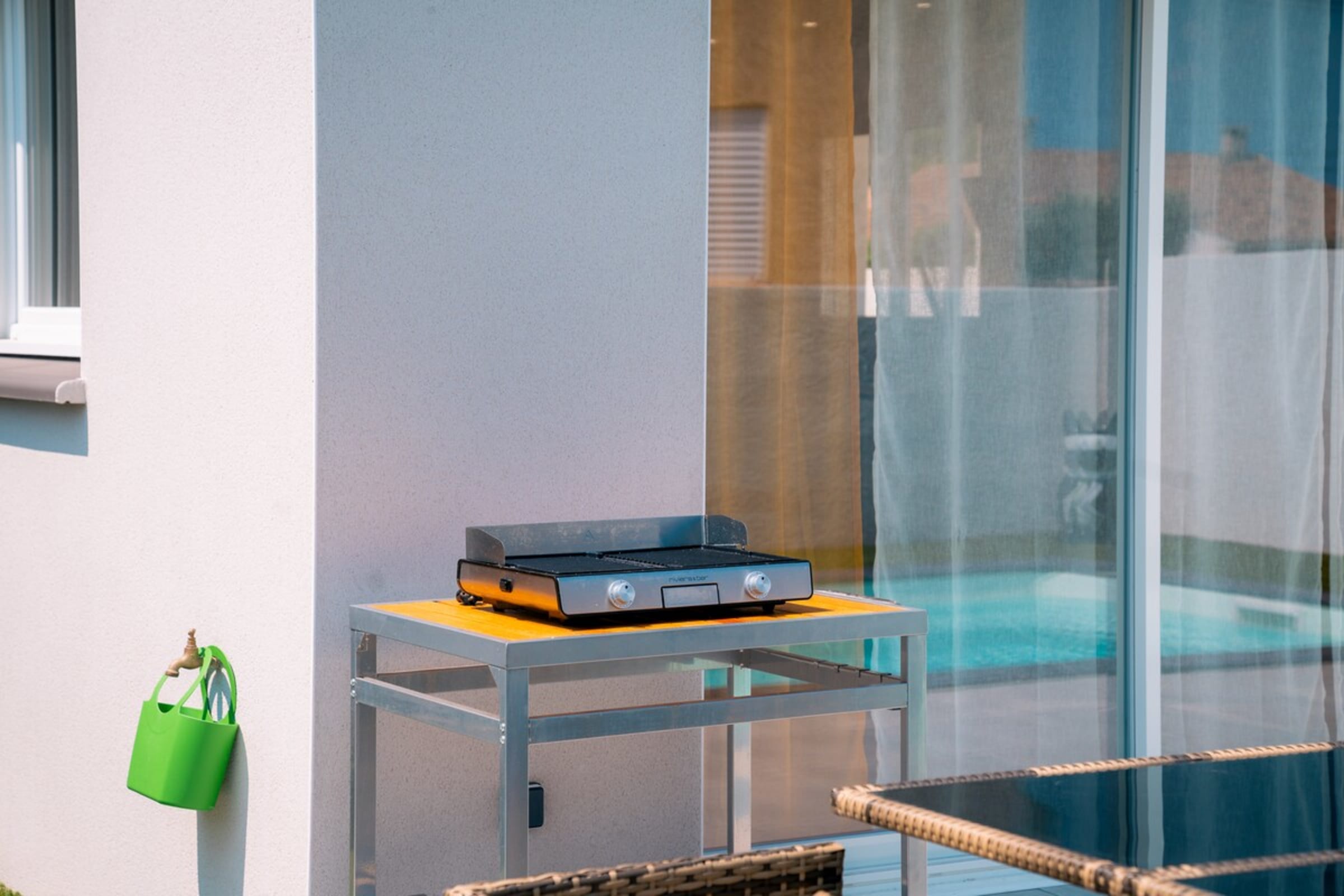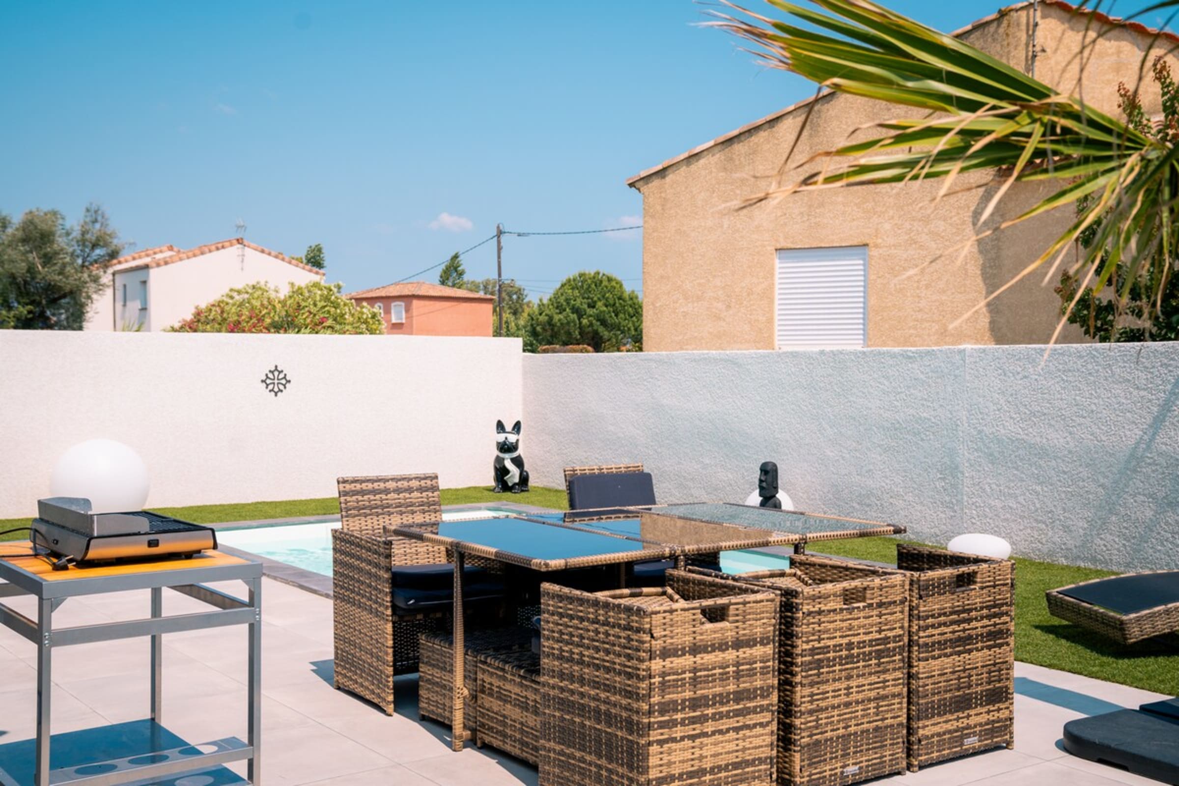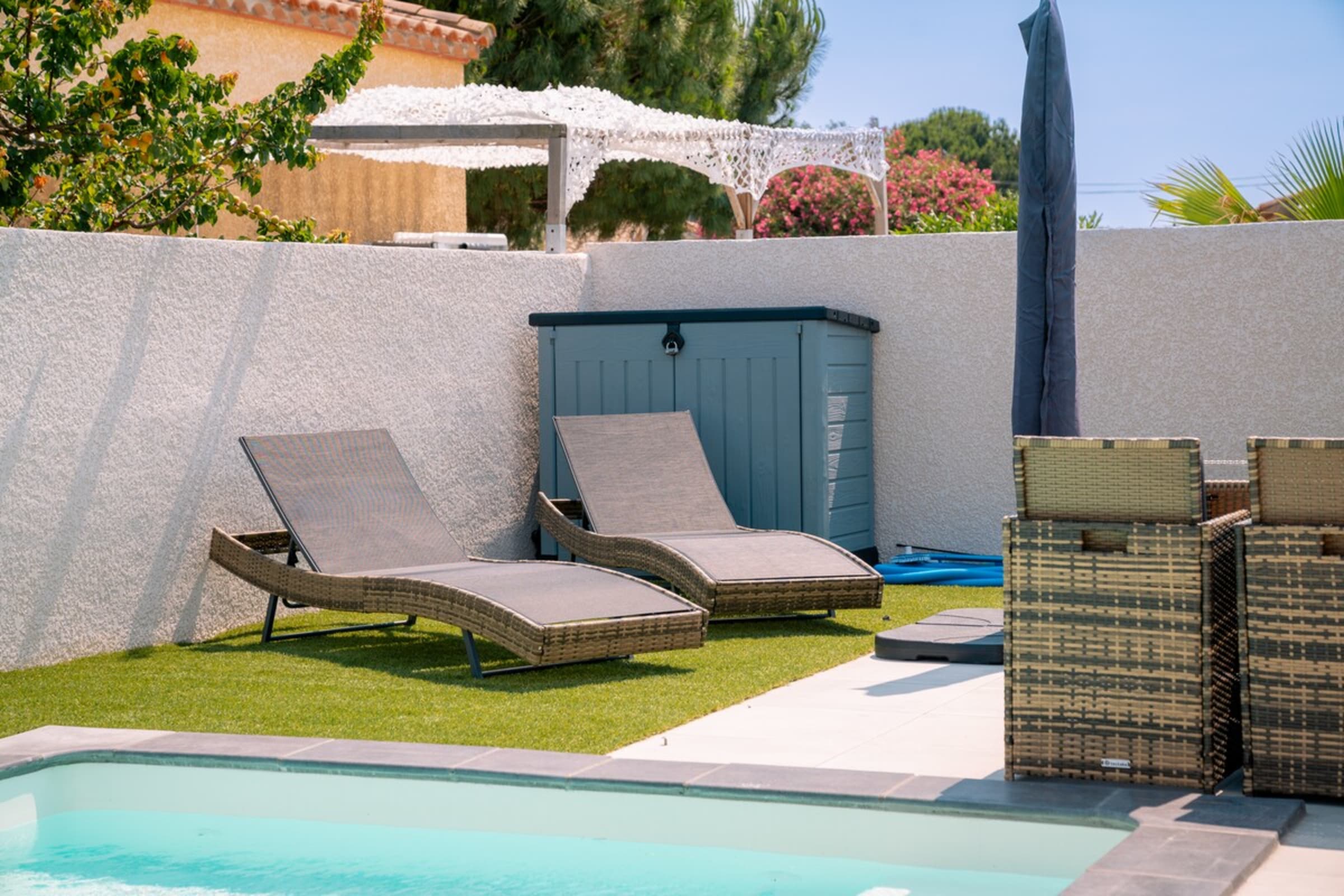 Outdoors, unwind in the private pool (5 m × 3 m, approx. 1.60 m deep, not heated). Linger on the terrace between swims, enjoy alfresco lunches and sunset apéritifs—the calm residential setting keeps you close to shops, the local market and the beach. Getting here is easy: Béziers TGV station, Béziers-Cap d’Agde or Montpellier airports, and the A9/A75 motorways nearby.