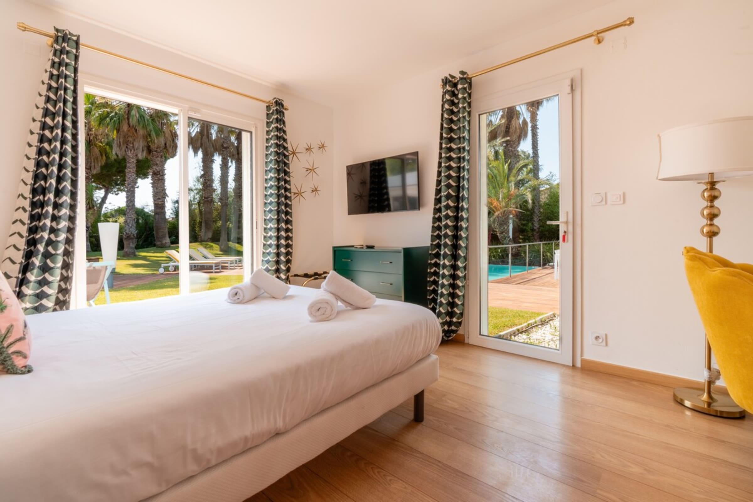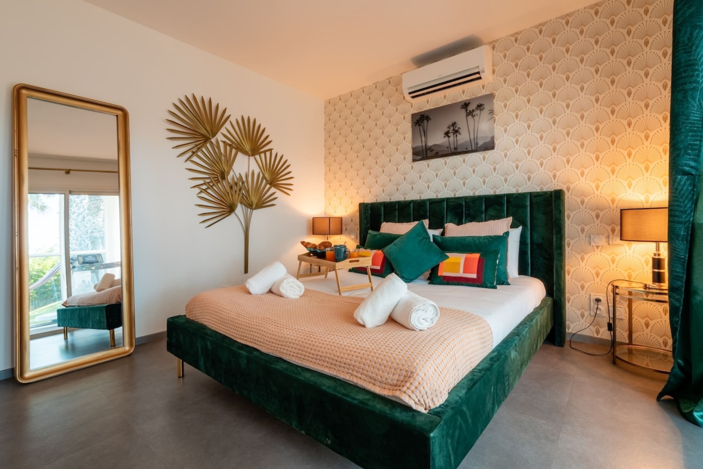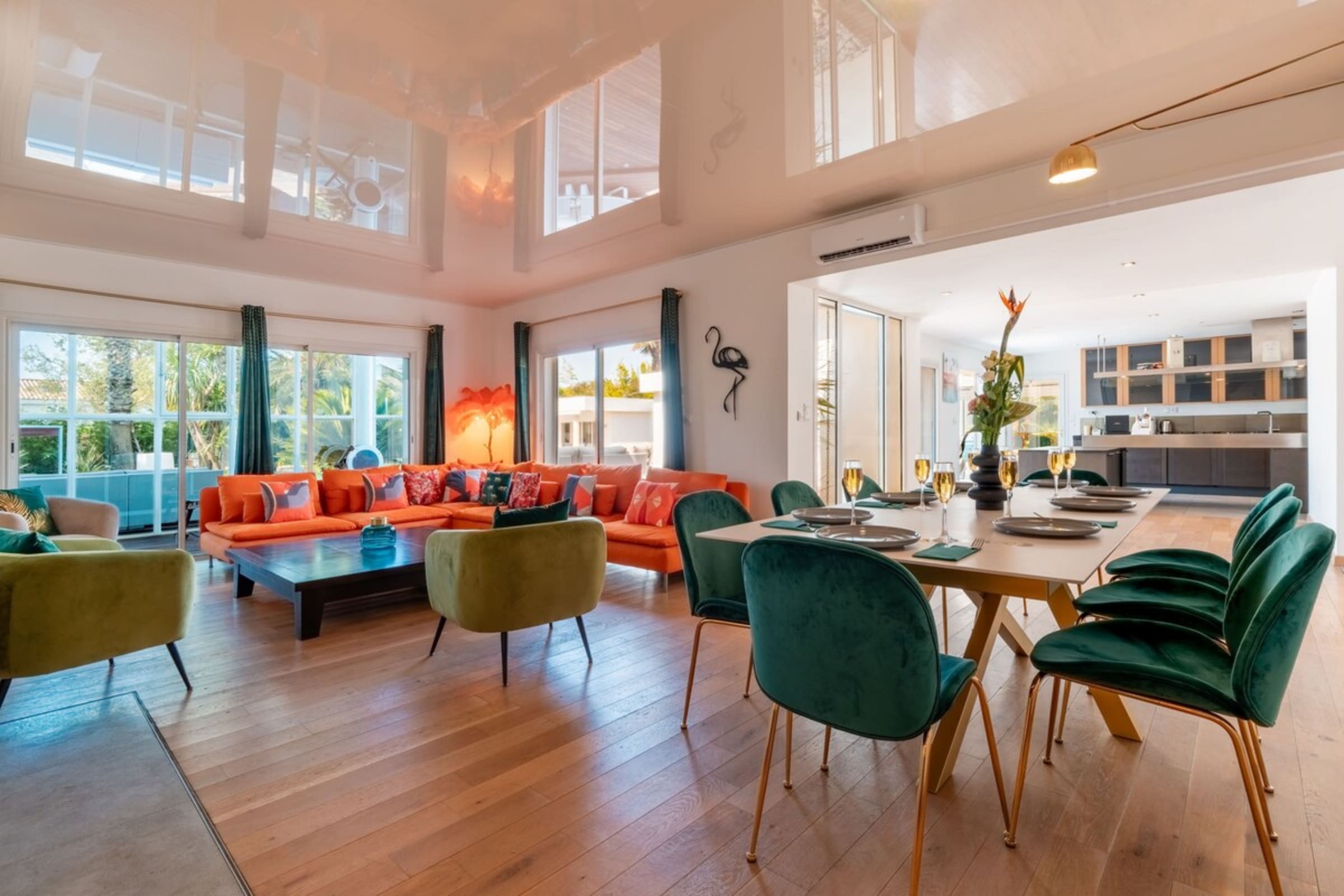With 8 sumptuously adorned bedrooms, "Summer Wind" is perfect for those seeking family moments and tranquility. The dynamic and colorful interiors of the villa reflect the charm of Mediterranean living. Stepping outside, the vast garden, adorned with numerous palm trees, surrounds a 12x5m pool with an island featuring two palm trees, a summer kitchen, and a jacuzzi – a true relaxation oasis.