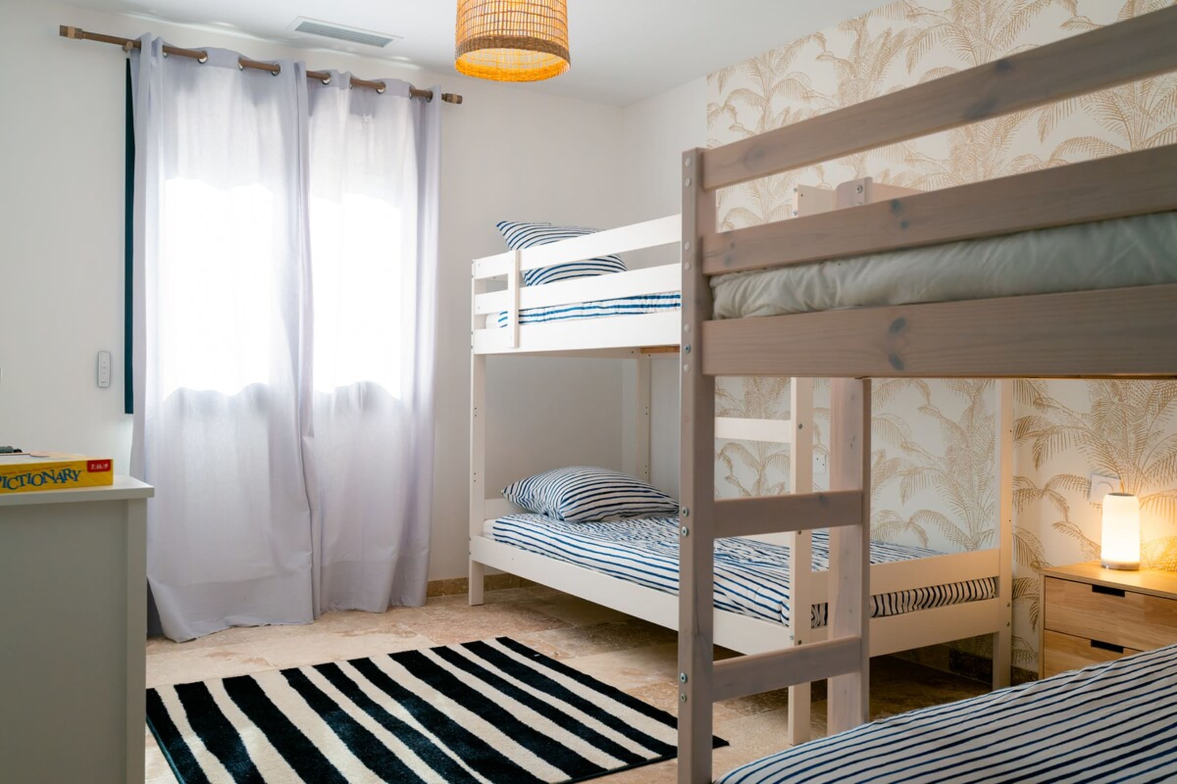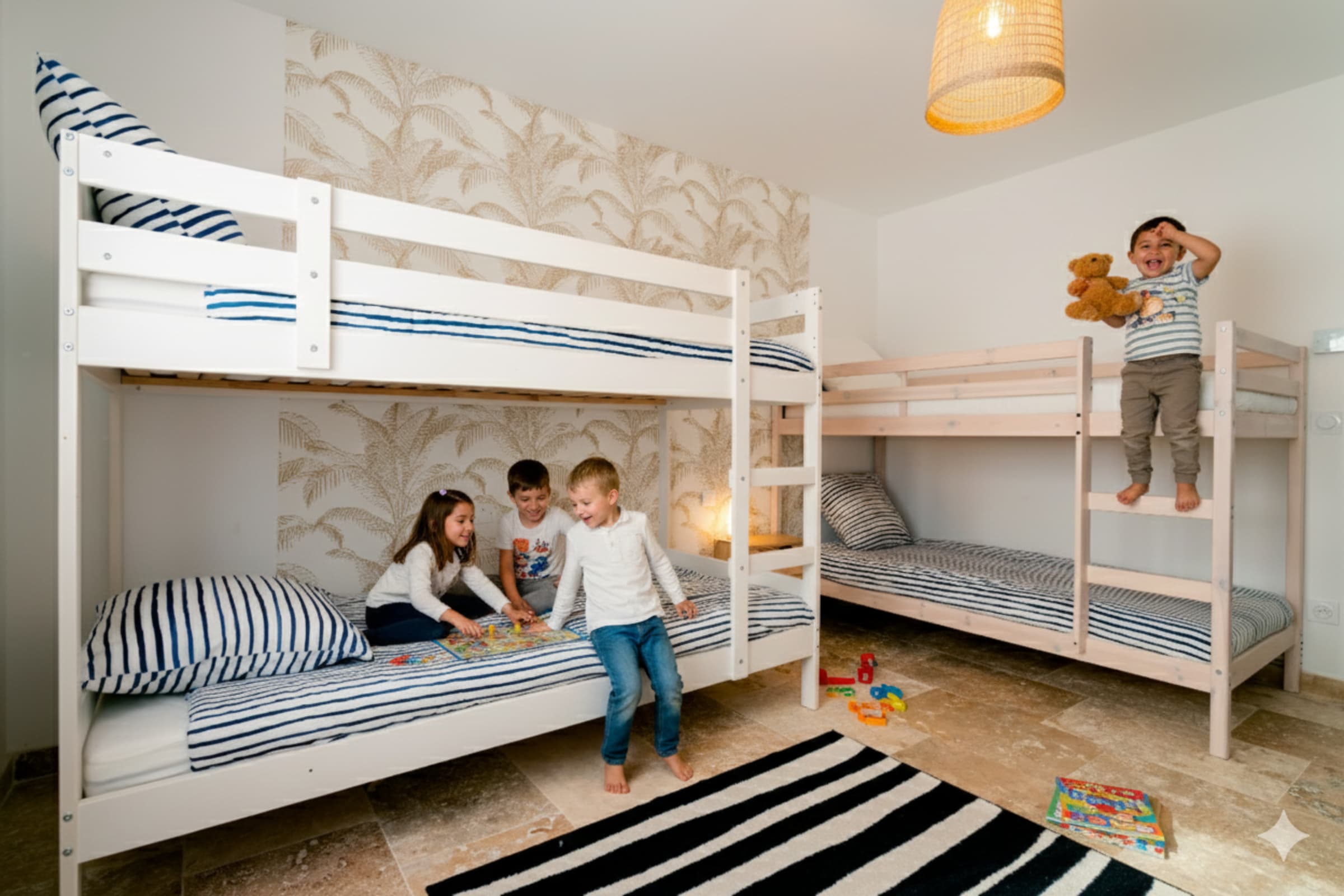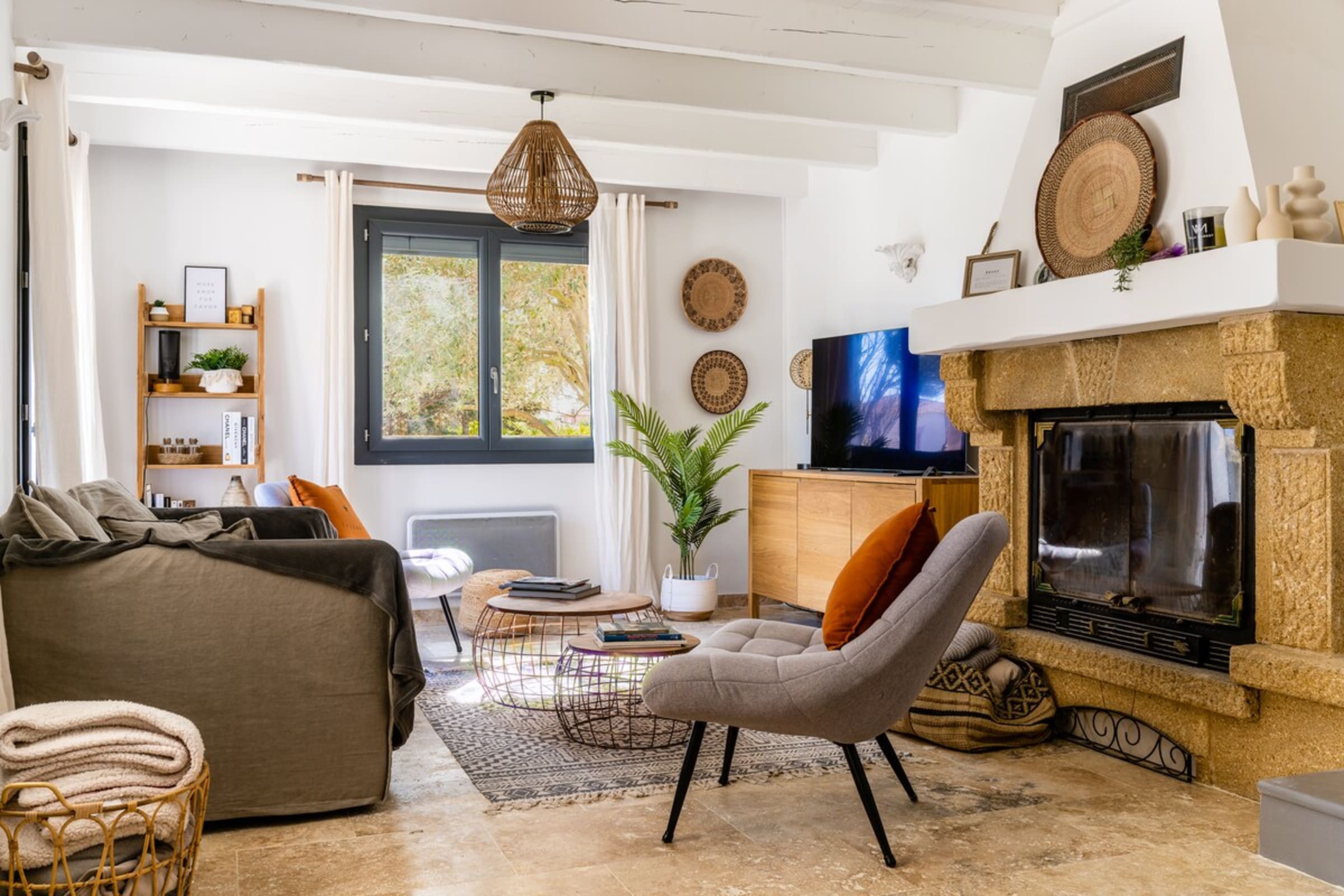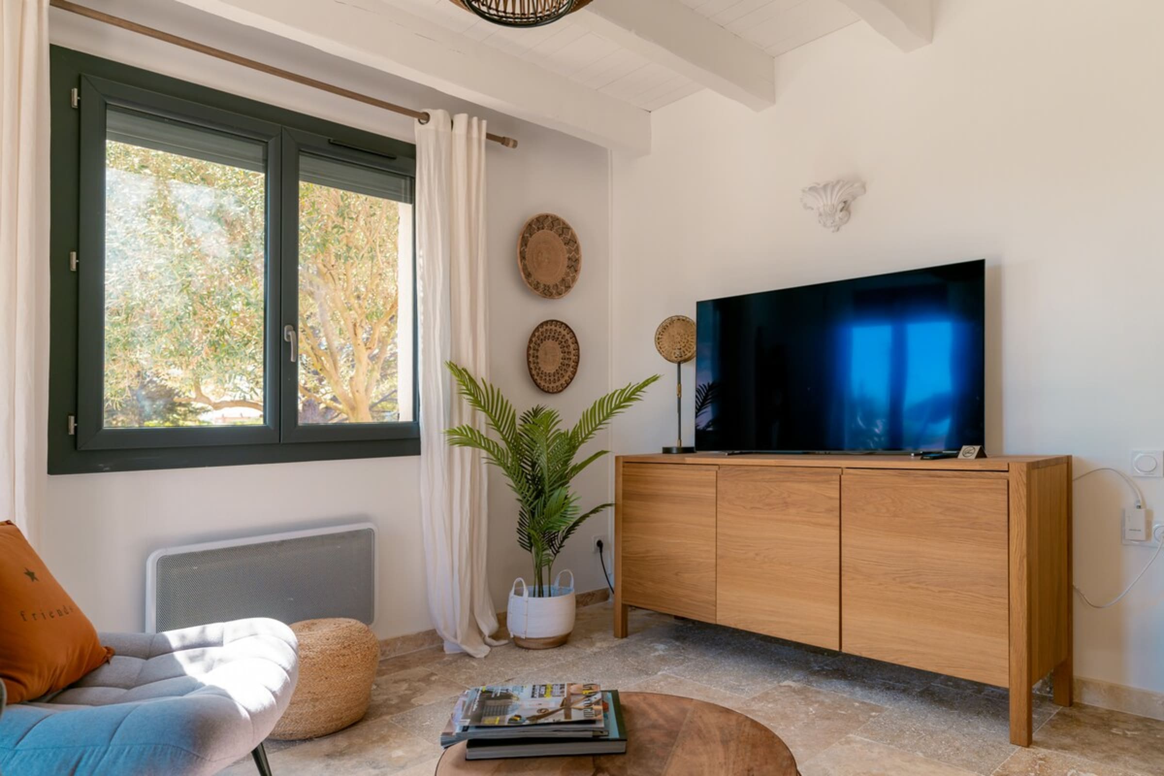 Made for families and friends, the villa adds playful moments: a boules (pétanque) lane for friendly matches, a ping-pong table for quick tournaments, and games for children both in their room and outdoors. The bright living area opens to the terrace and pool—the home’s social heart for long lunches and starlit evenings. The indoor fireplace is decorative only; for safety reasons it may not be used.