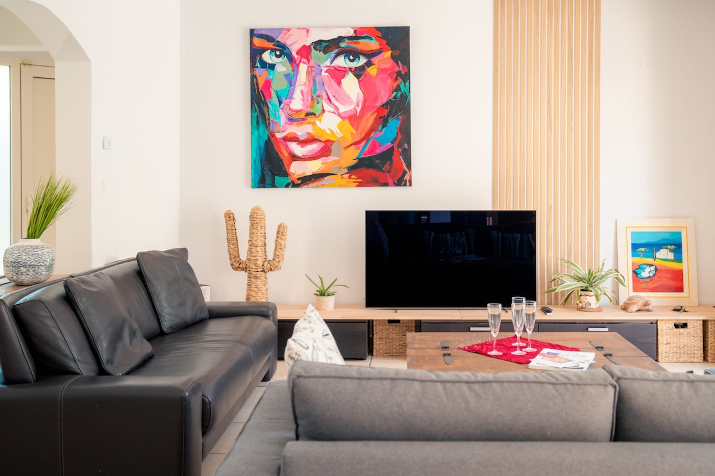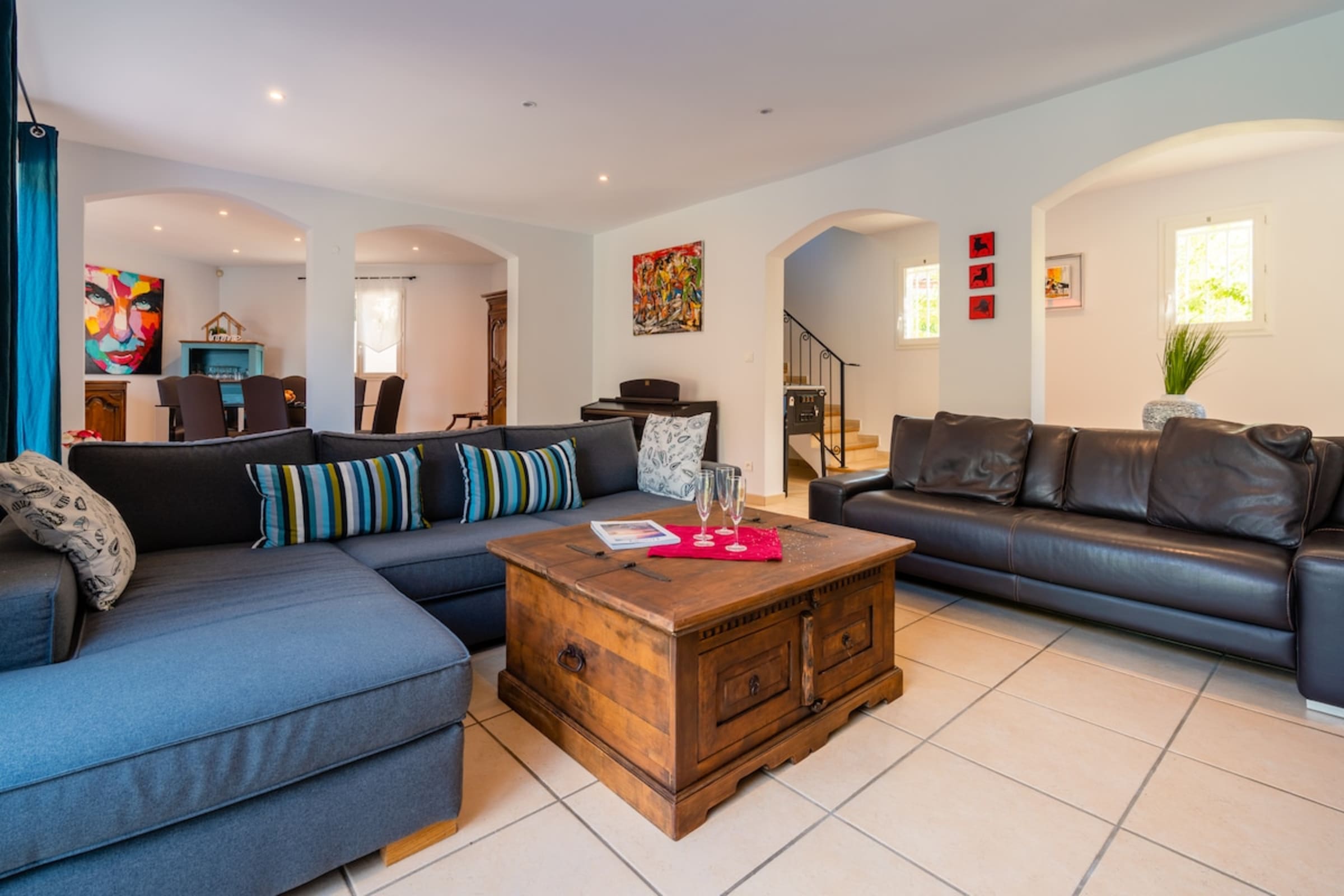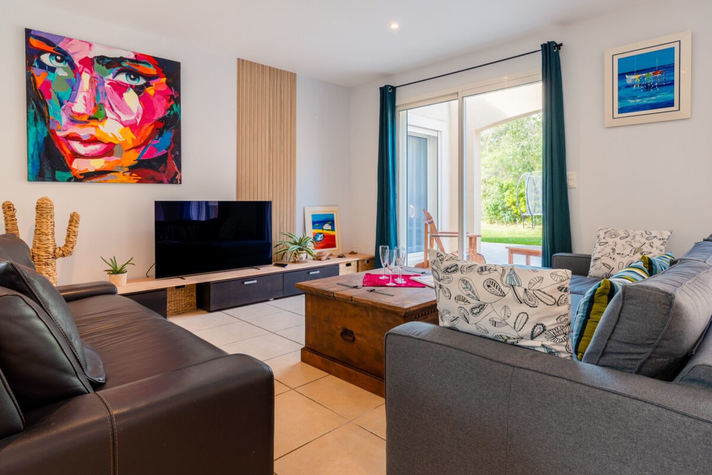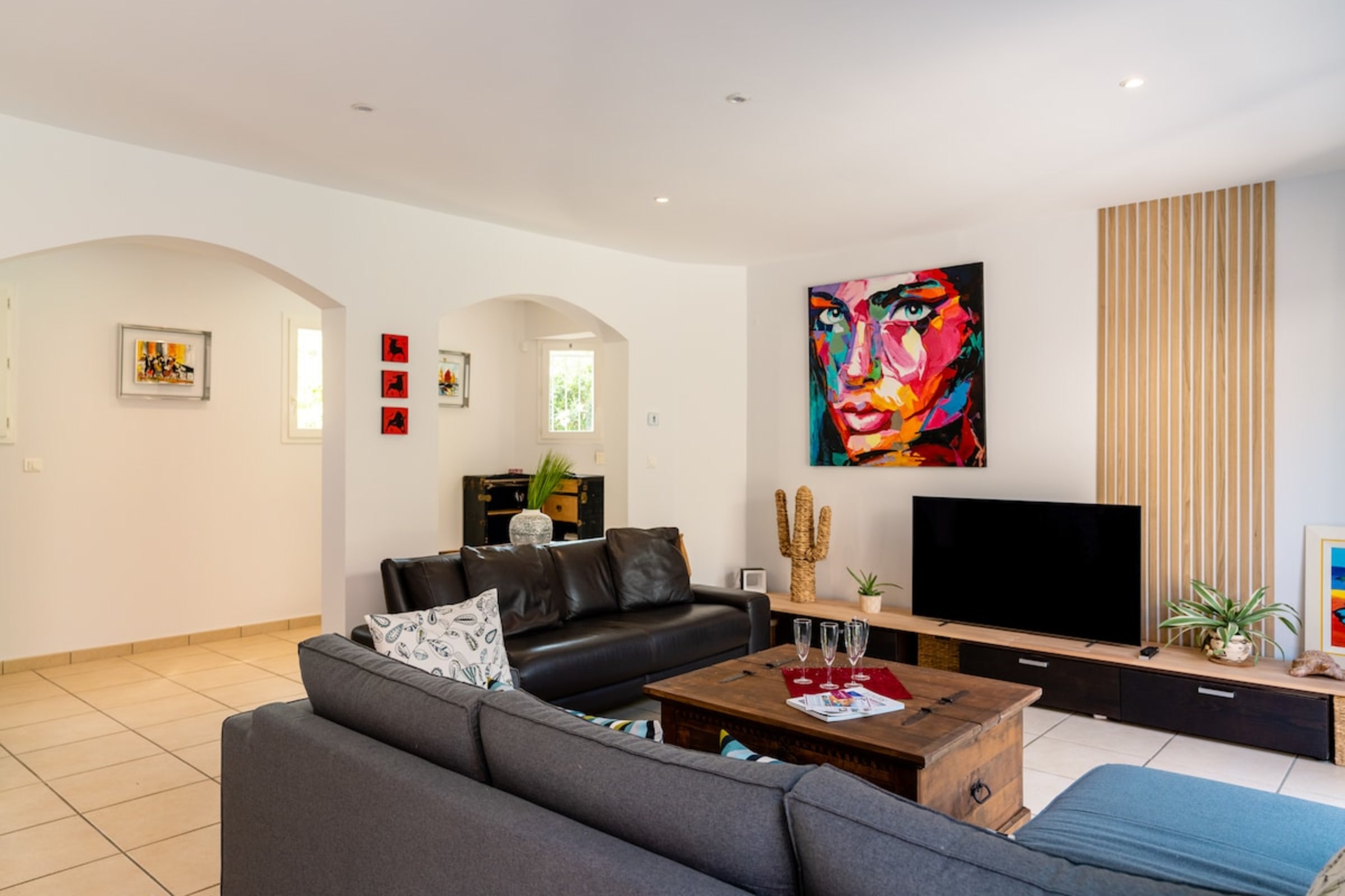 The bright living room is the heart of the house, opening to the terrace for an easy indoor–outdoor flow. Outside, the summer bar/outdoor kitchenette becomes the evening hotspot: clink glasses, nibble, chat—while the Weber barbecue steals the show. Groceries are easy: Intermarché (a French supermarket chain) is under 2 minutes by car.