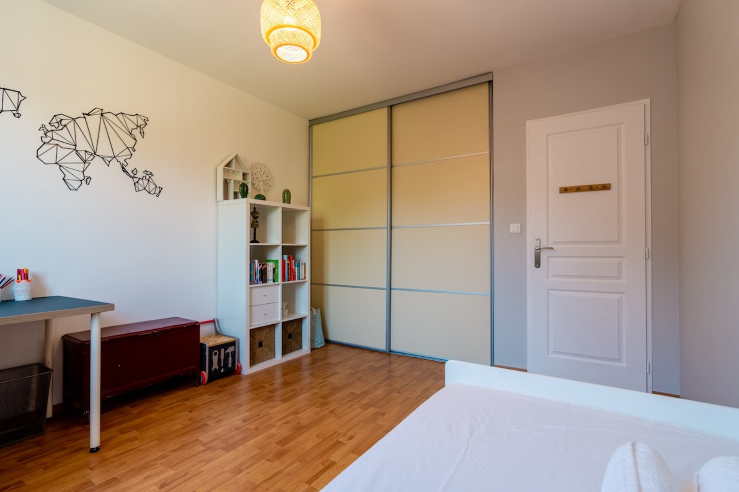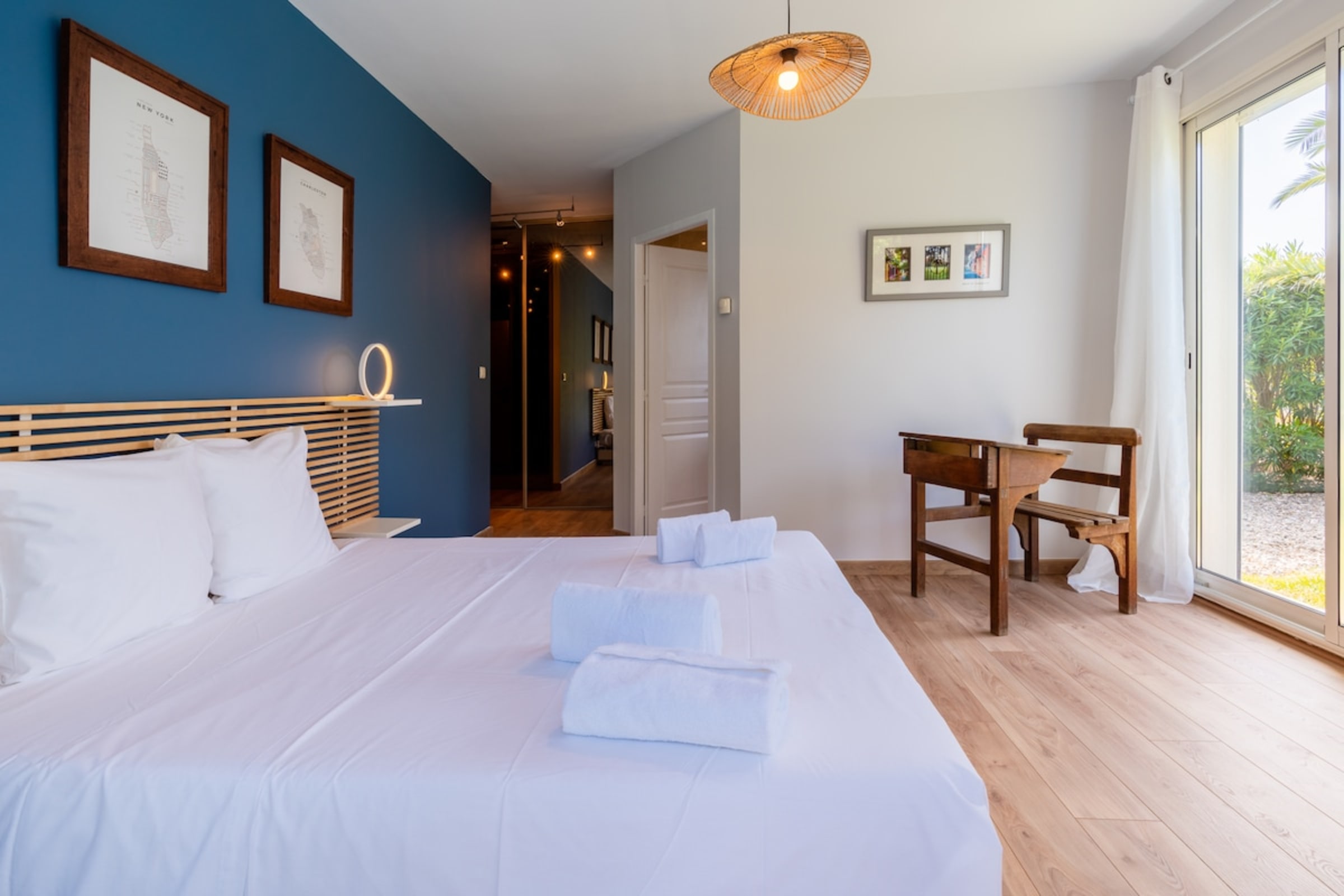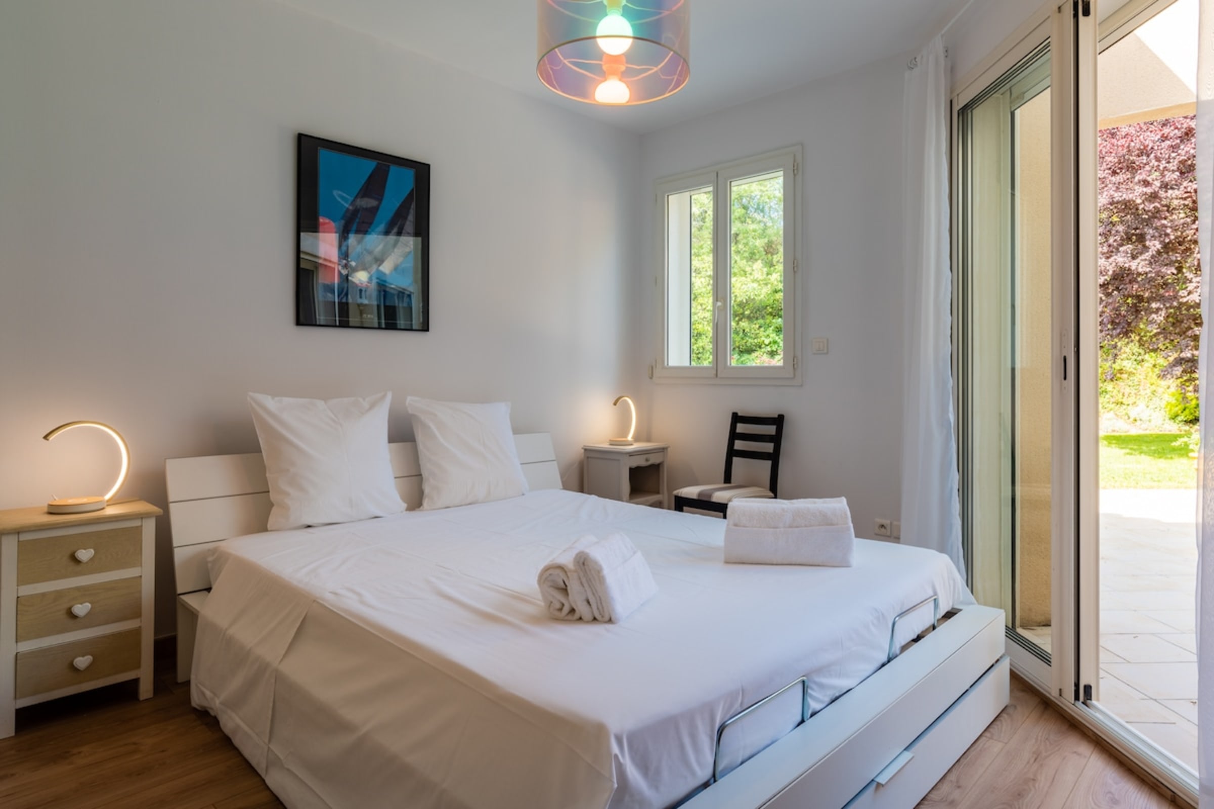 For nights, comfort leads the way: on the ground floor, a master bedroom with a near-panoramic view of garden and pool, plus a second bedroom. Upstairs, two further bedrooms, including one with a single bed + pull-out trundle (designed with children in mind but fully suitable for adults). Quality bedding, storage, and natural light create calm, restorative spaces.
