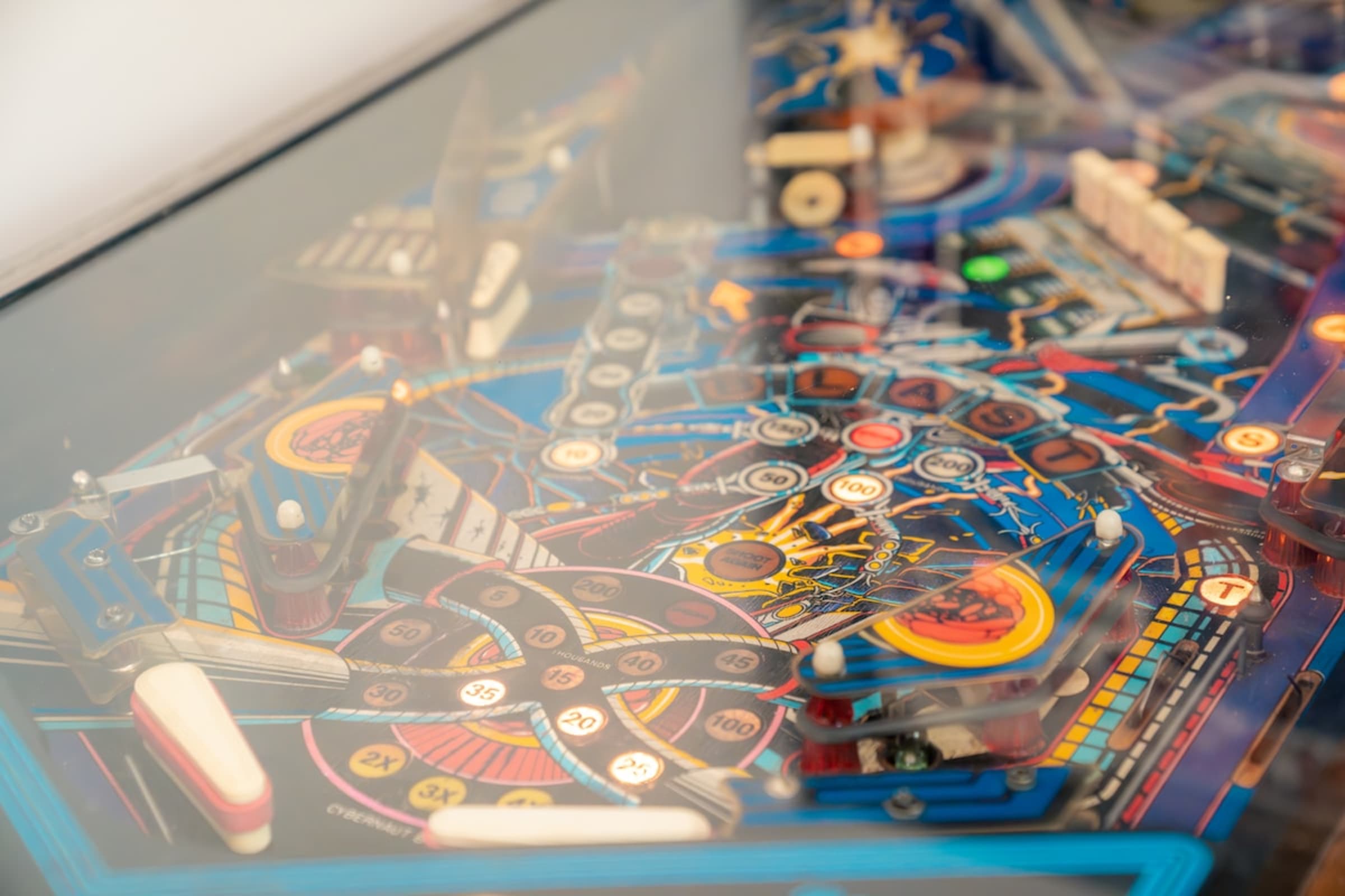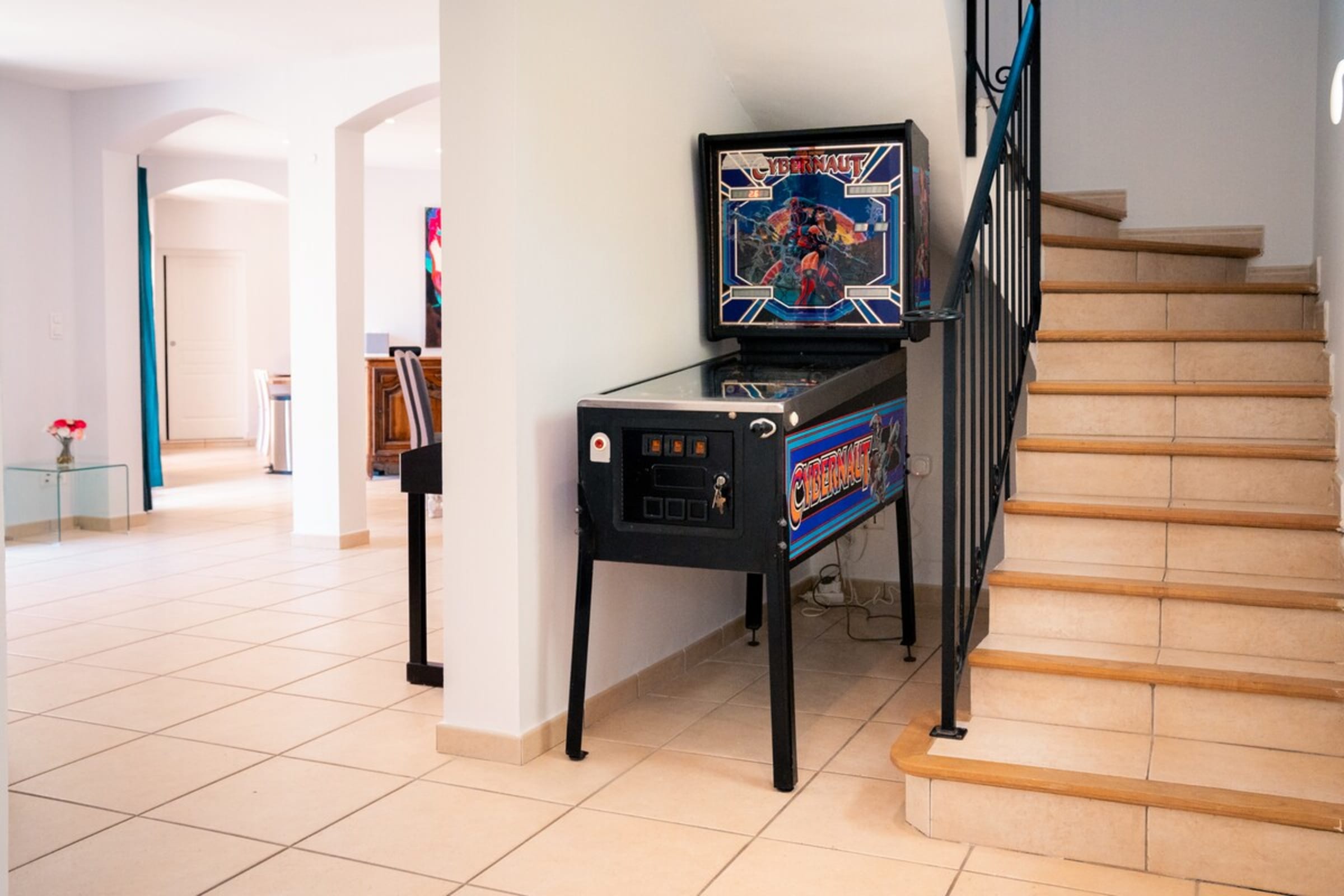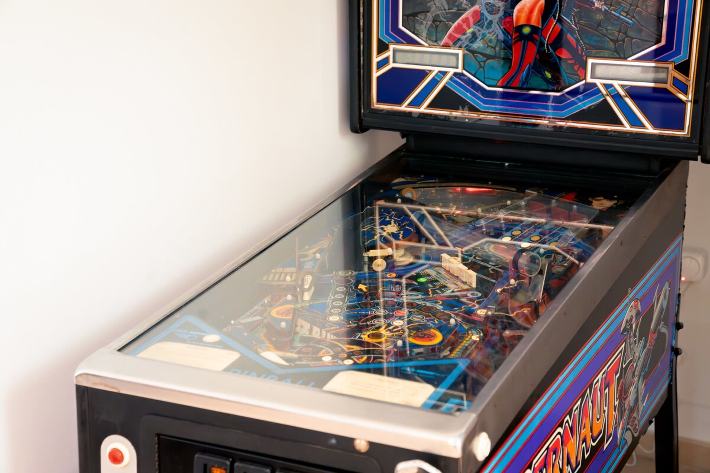 Fun is built-in: a trampoline, games, and an irresistible vintage pinball machine. Next to it, a scoreboard keeps past guests’ best scores—your turn to beat the record!