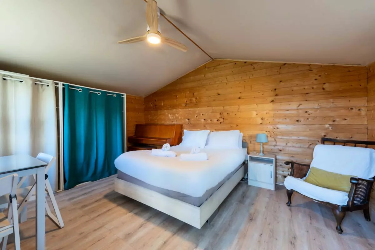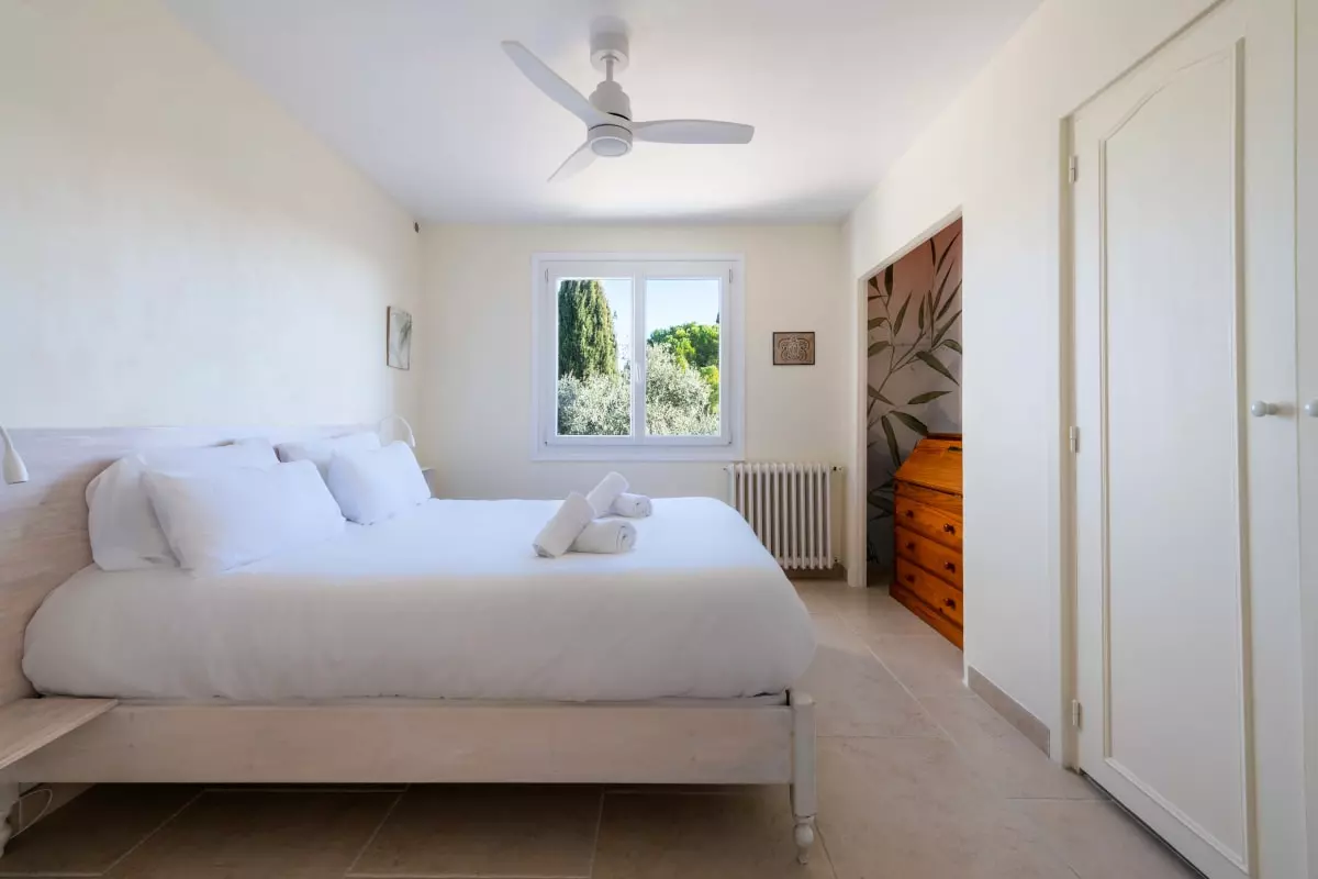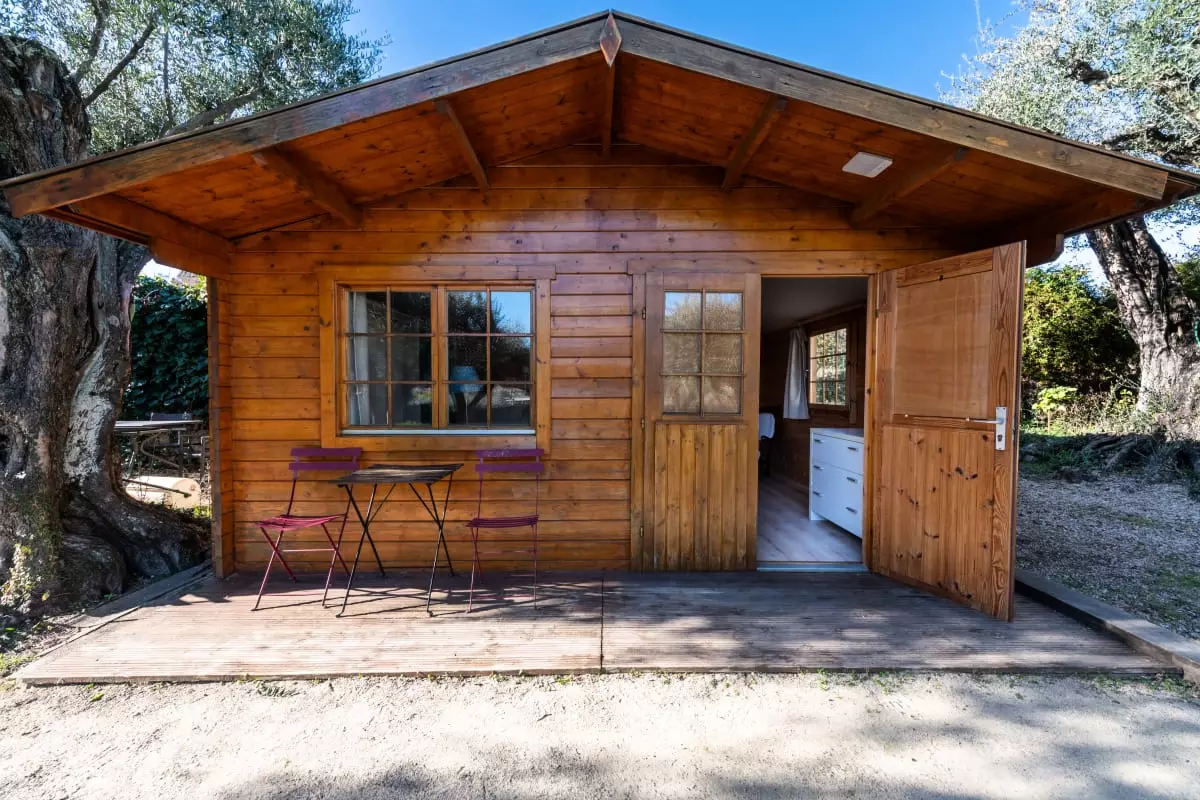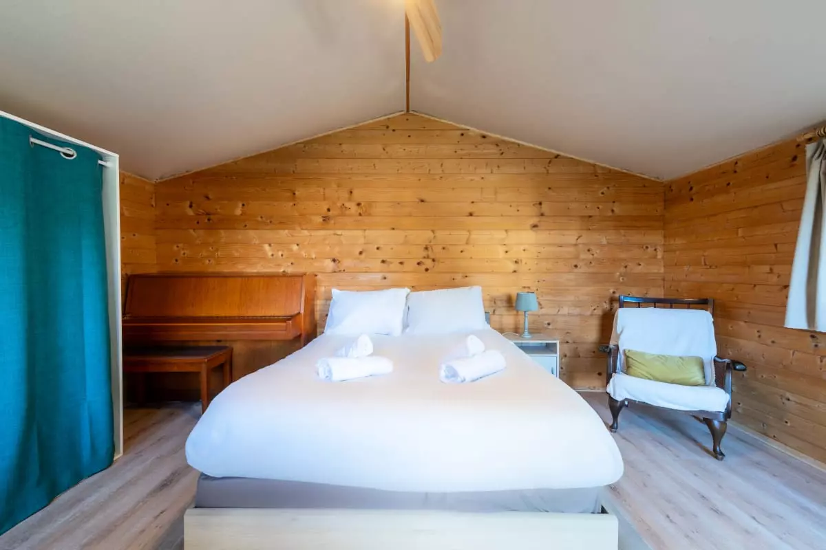 In the garden, a 17m² wooden chalet offers an additional bedroom with a double bed (140x200 cm) and ceiling fan, for more privacy.