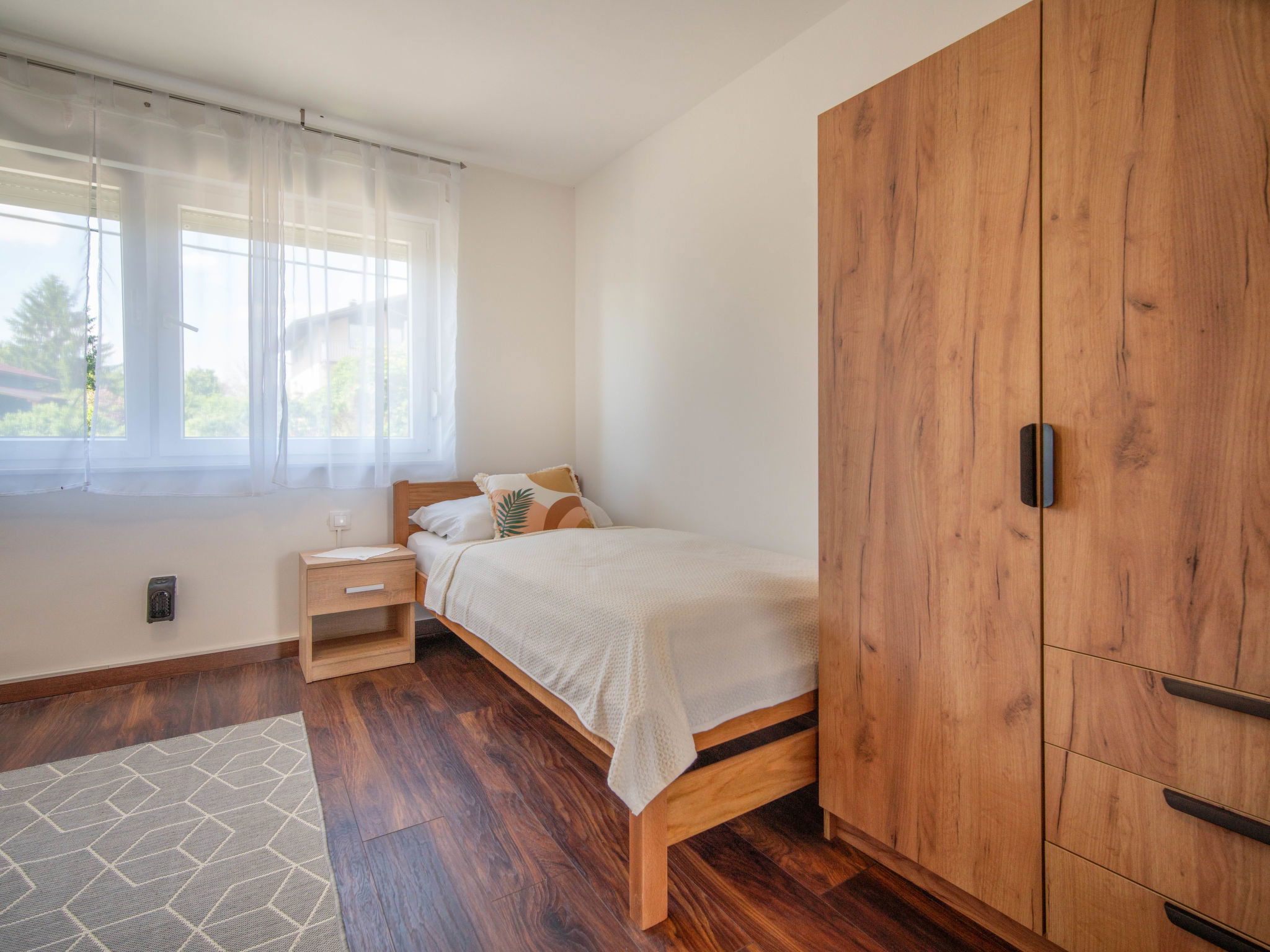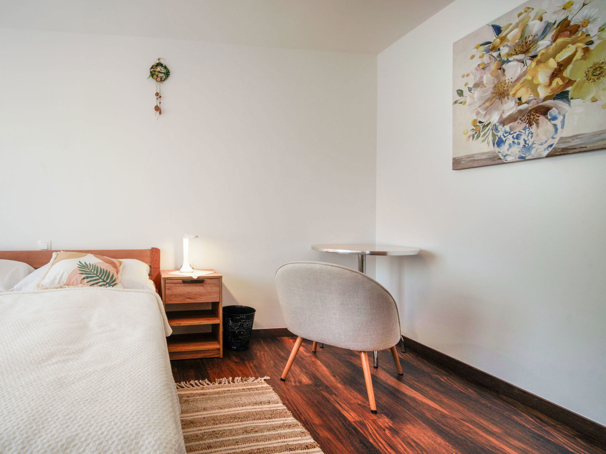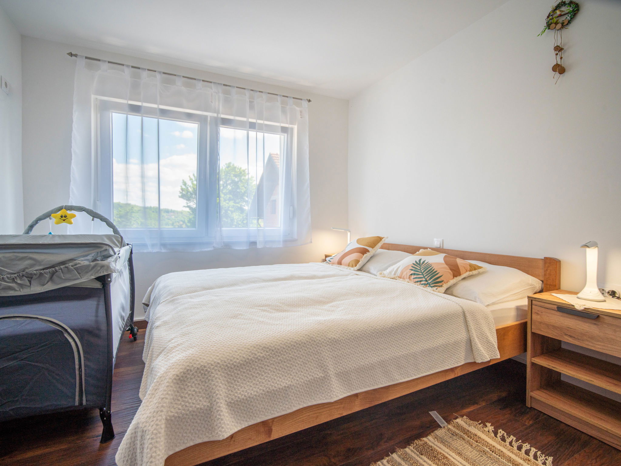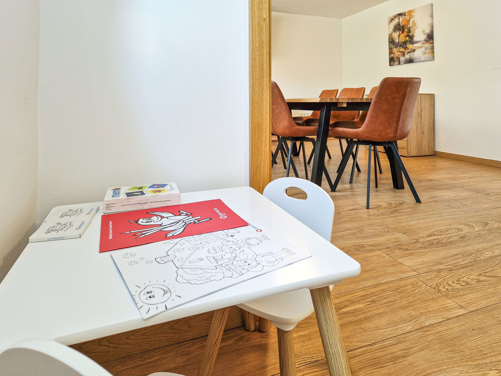 4-room house 140 m2 on 2 levels. Living/dining room with cable TV (flat screen), wood-burning stove. Open kitchen (oven, dishwasher, 4 ceramic glass hob hotplates, toaster, kettle, freezer, electric coffee machine). Shower/WC. Upper floor: 1 room with 1 double bed (2 x 80 cm, length 200 cm). 1 room with 1 bed (90 cm, length 200 cm), 1 double bed (2 x 80 cm, length 200 cm). 1 room with 1 double bed (2 x 80 cm, length 200 cm), shower/WC. Exit to the balcony. Shower/WC. Wood heating, forced-air heating. Small balcony 2 m2, balcony 4 m2. Balcony furniture. View of the countryside. Facilities: baby cot, hair dryer, logs (free). Internet (WiFi, free). Please note: non-smoking house. Maximum 1 pet/ dog allowed. Fire extinguisher.