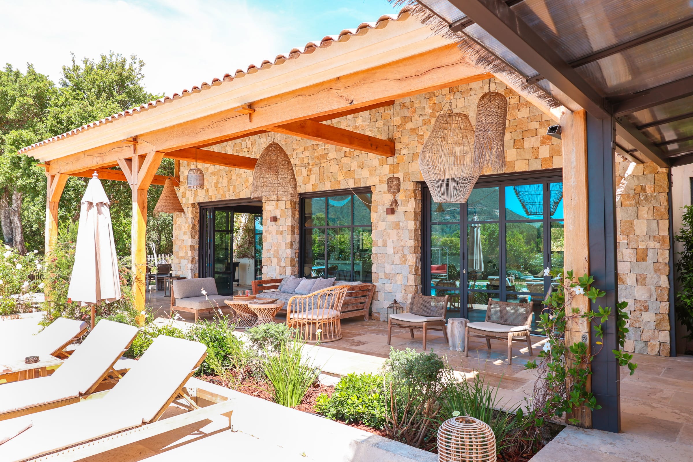 A petanque court is located at the back of the villa. The space is illuminated with a relaxation seating area and speakers are integrated to enjoy music while playing.