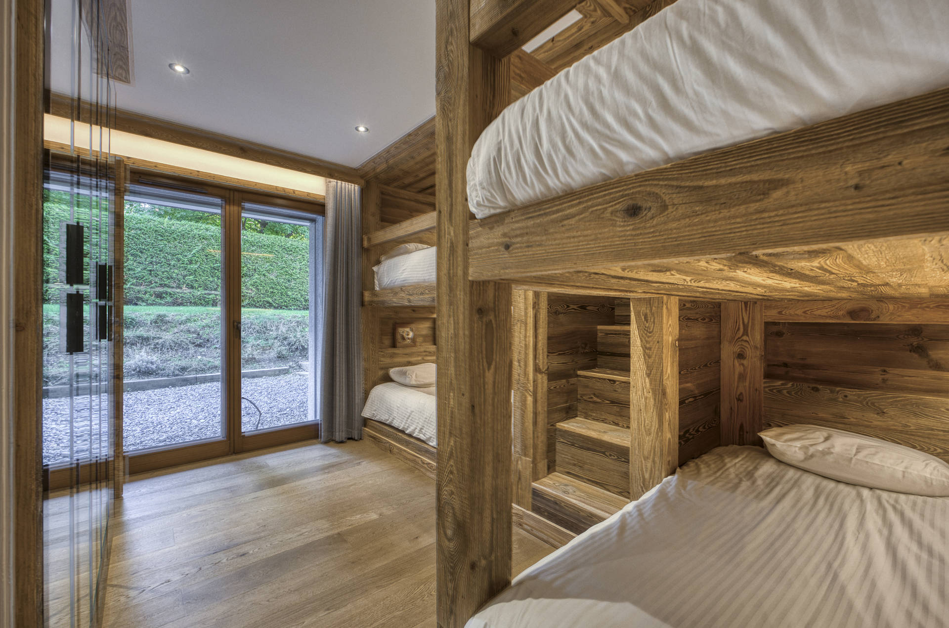 - A dormitory-style bedroom with double bunk beds, built-in wardrobes, a bathroom with toilet and garden access,