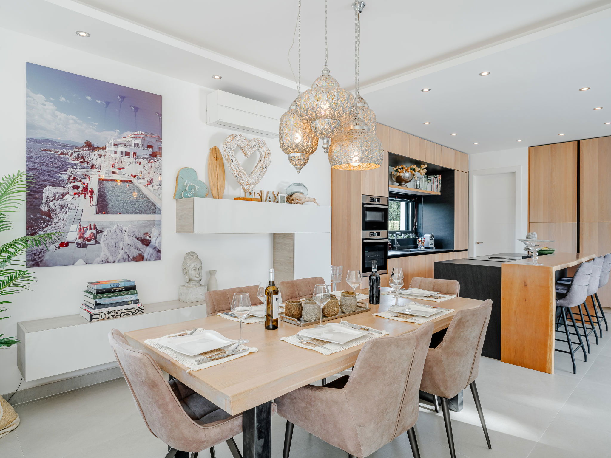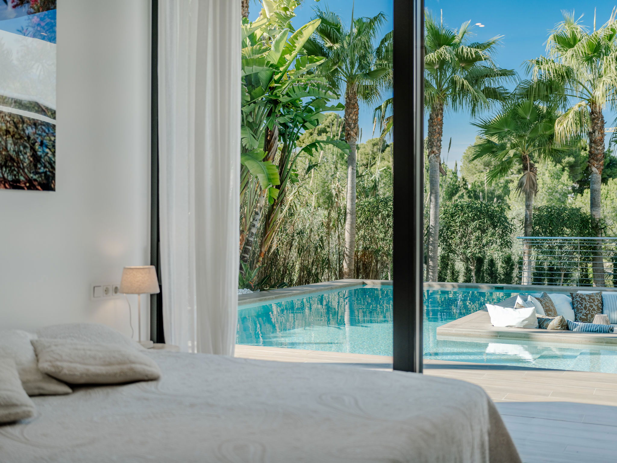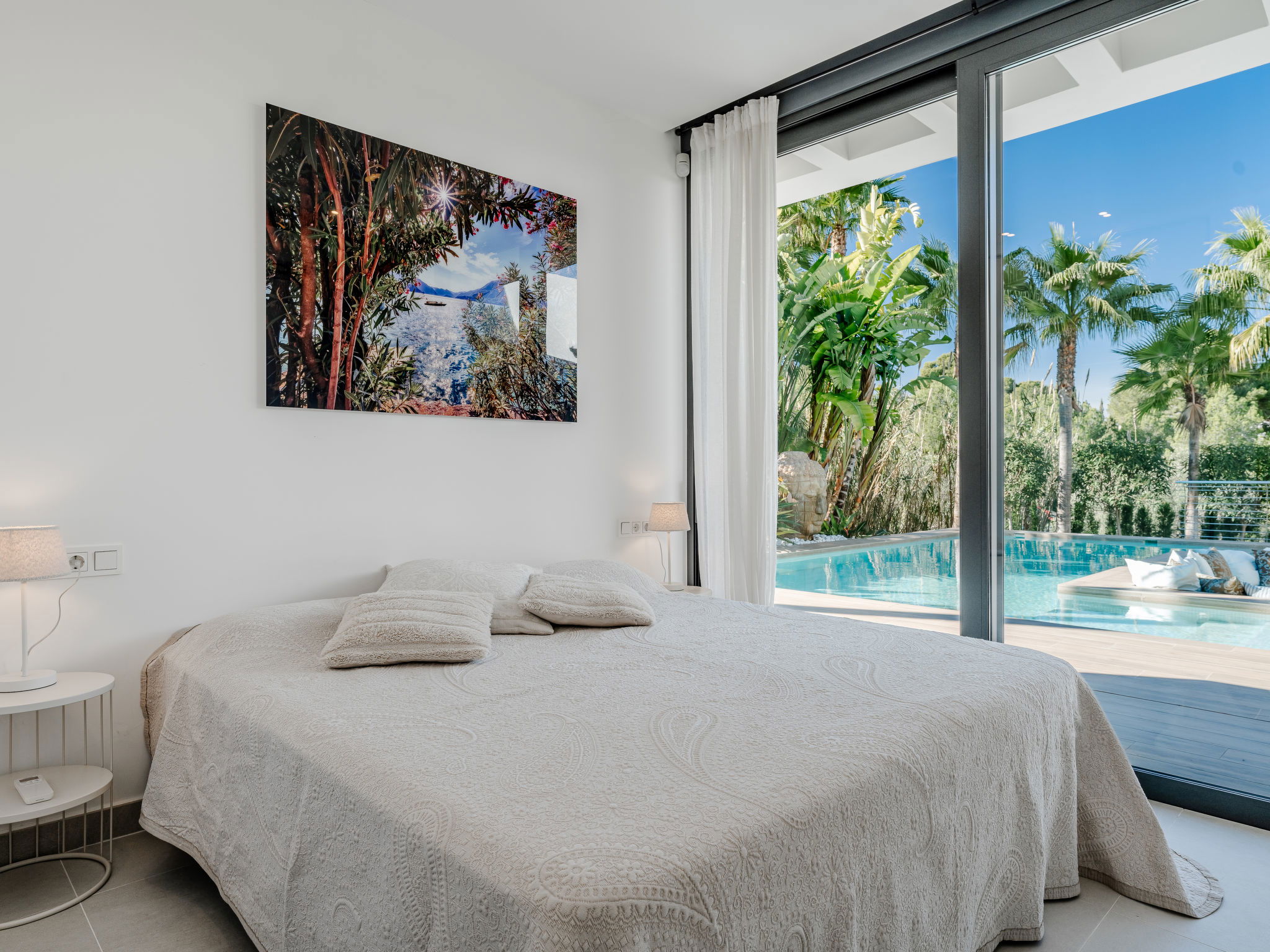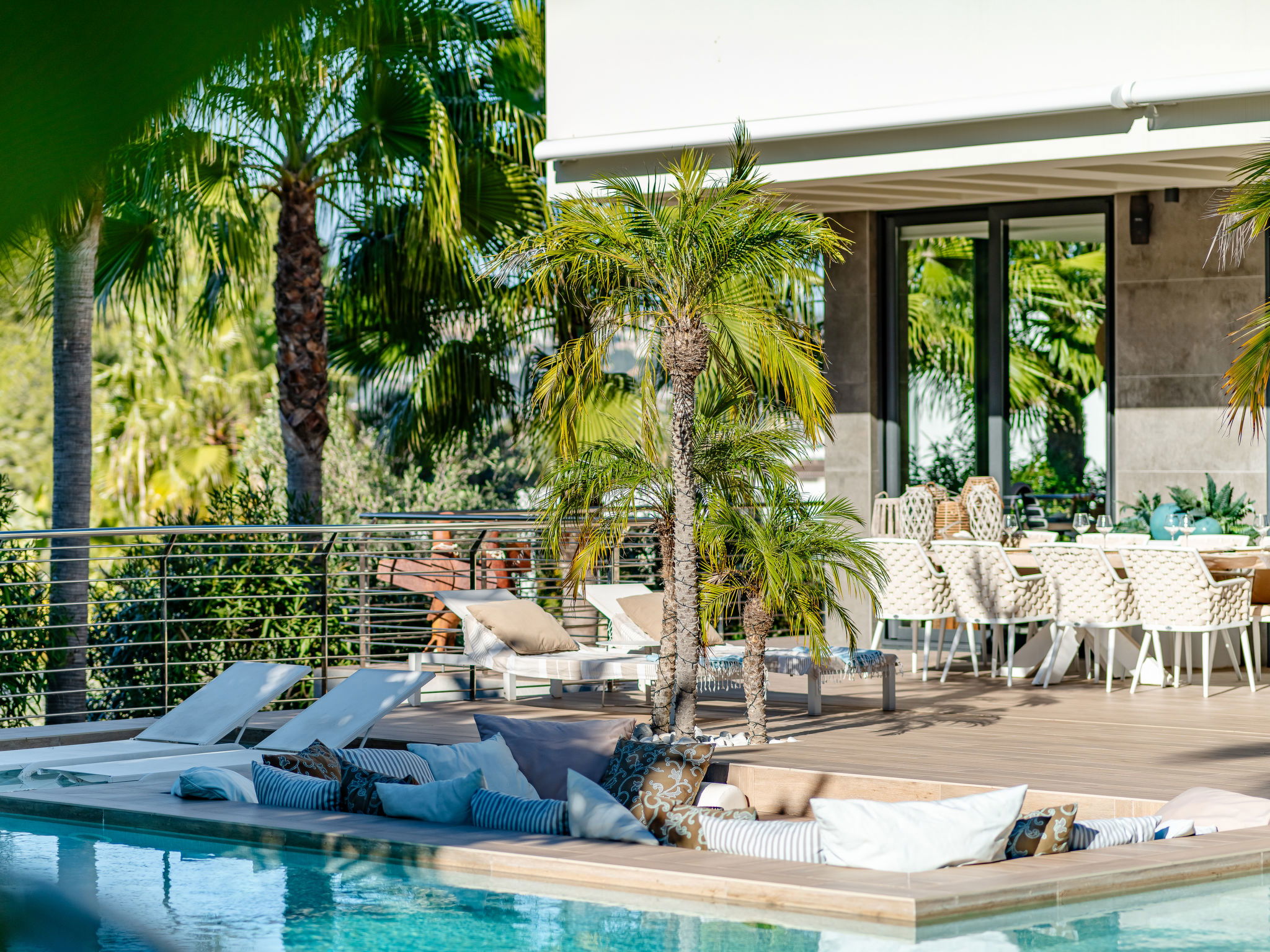 "Villa Essence", 4-room villa 220 m2 on 2 levels. Spacious and bright, very modern and stylish furnishings: living/dining room with satellite TV, air conditioning and forced-air heating. Exit to the terrace, to the swimming pool. 1 room with 1 french bed (2 x 90 cm, length 200 cm), shower/WC, air conditioning, fan and forced-air heating. Exit to the terrace, to the swimming pool. 1 room with 1 double bed (2 x 90 cm, length 200 cm), bath/shower/WC, air conditioning, fan and forced-air heating. Exit to the terrace, to the swimming pool. Large, open kitchen (oven, dishwasher, 5 induction hot plates, toaster, kettle, microwave, freezer, electric coffee machine, cooking island) with air conditioning and forced-air heating. Exit to the patio, to the swimming pool. Upper floor: 1 room 100 m2 with Dressing room with 1 french bed (180 cm, length 200 cm), separate WC, shower, air conditioning, fan and forced-air heating. Exit to the terrace. Large terrace, large garden. Terrace furniture, barbecue, deck chairs, sitting area. Very beautiful view of the mountains, the swimming pool and the garden. Facilities: washing machine, dryer, iron, children's high chair, baby cot, hair dryer. Internet (WiFi, free). Parking. VT-498490-A // Reg. Nr.: ESFCTU00000307100093229200000000000000000VT-498490-A1