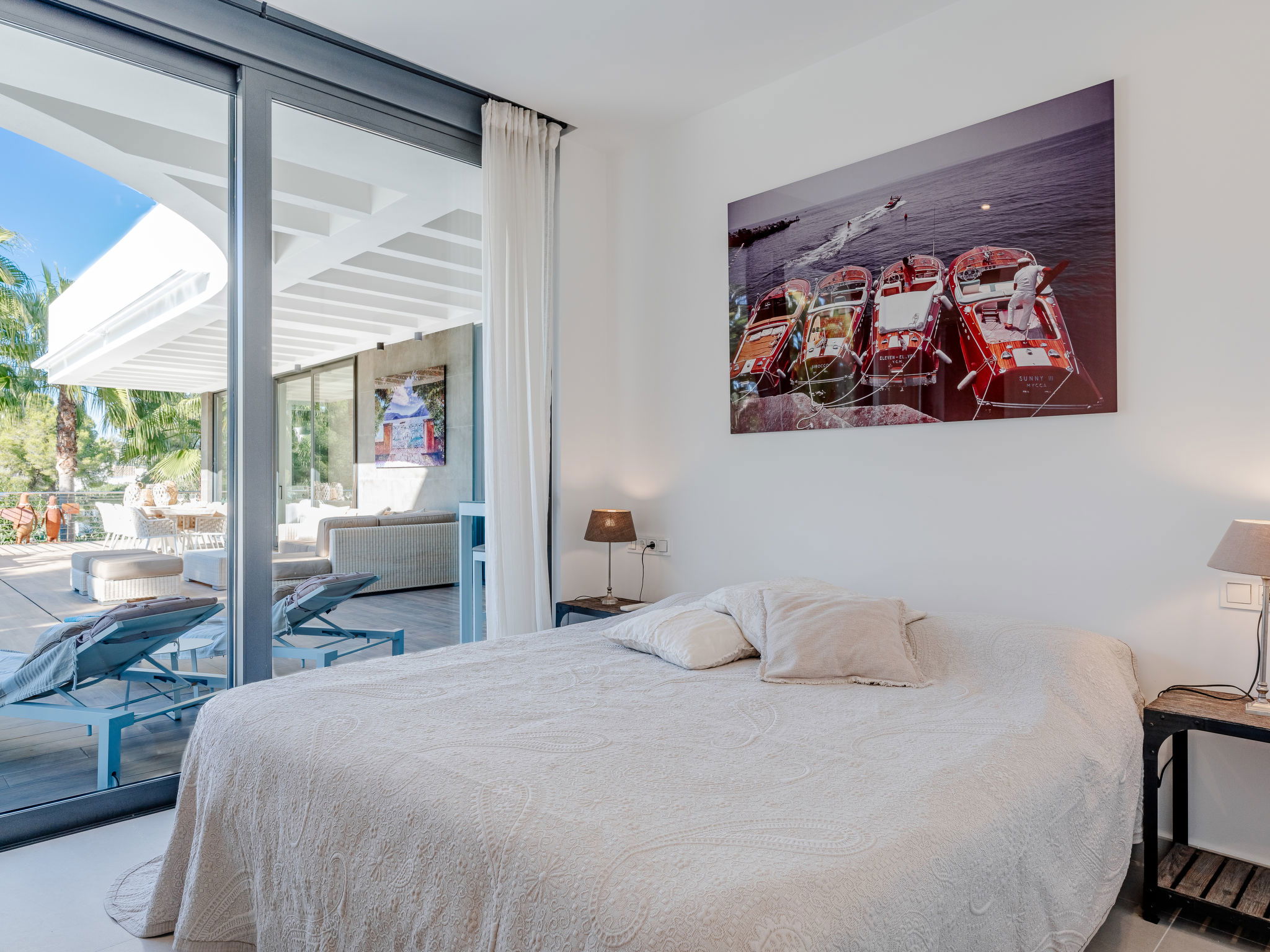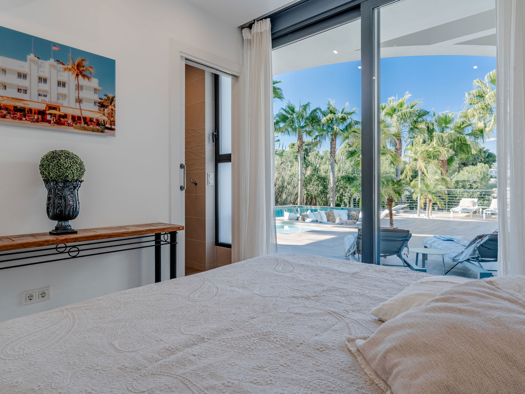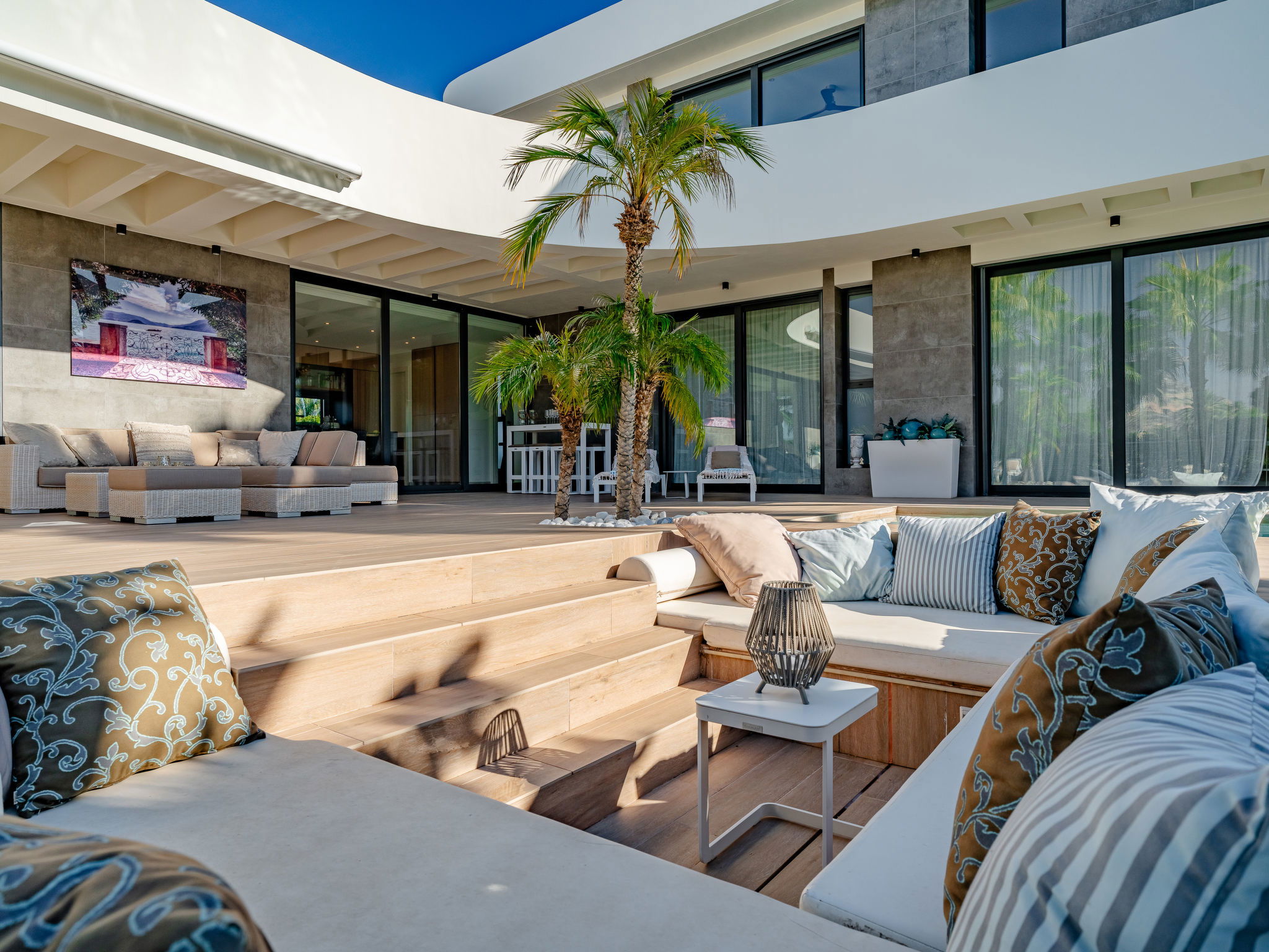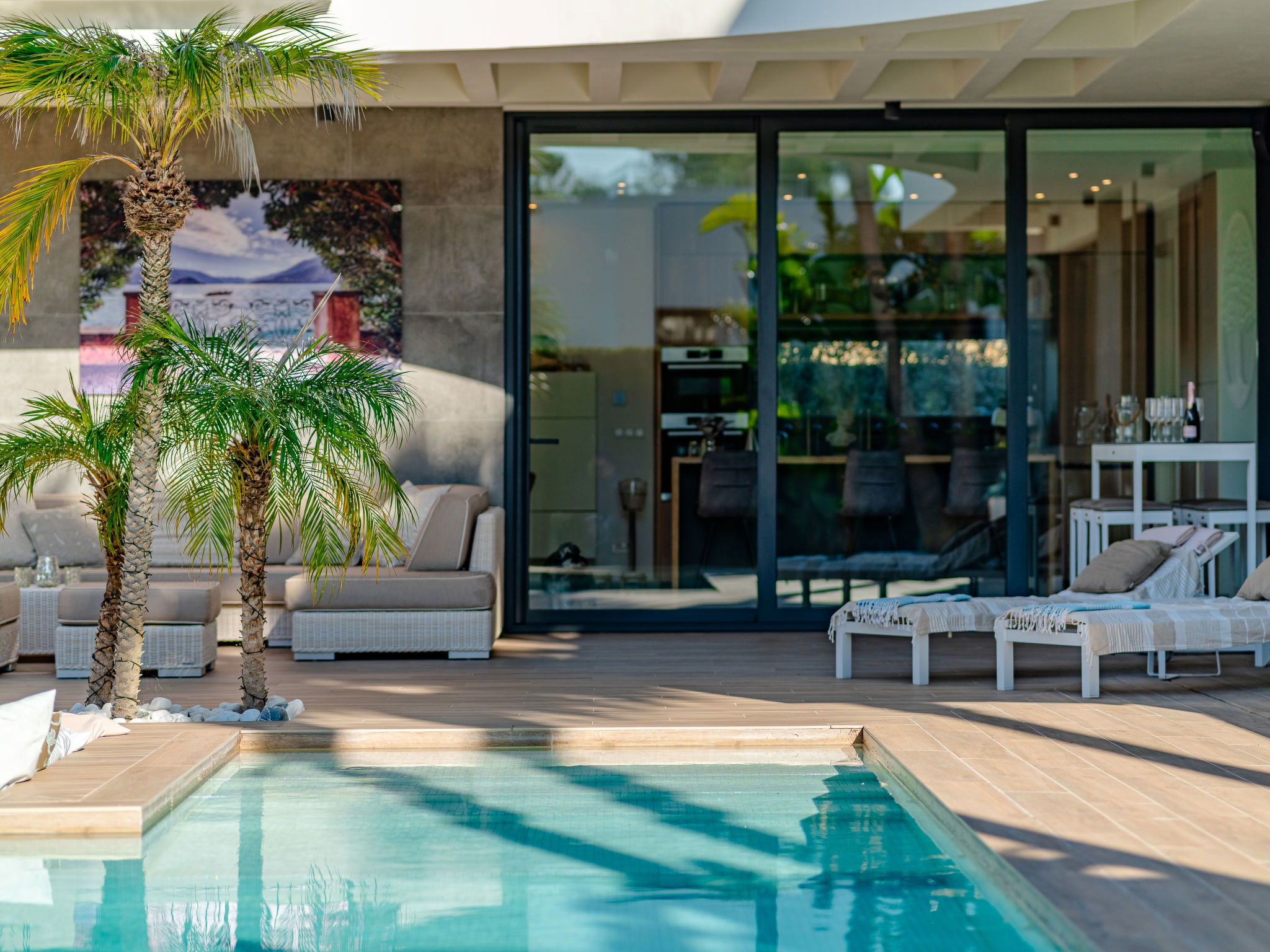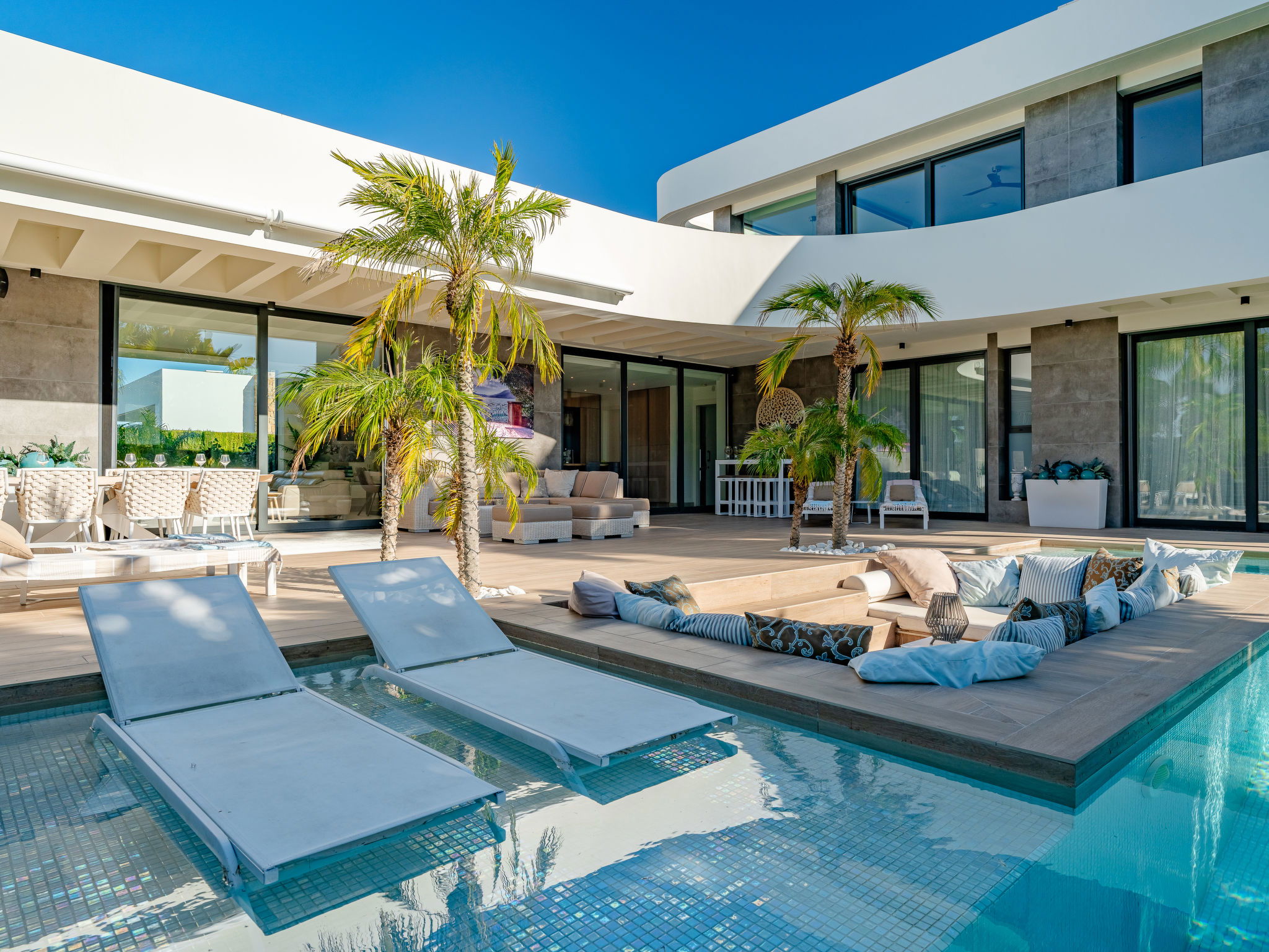 "Villa Essence", 4-room villa 220 m2 on 2 levels. Spacious and bright, very modern and stylish furnishings: living/dining room with satellite TV, air conditioning and forced-air heating. Exit to the terrace, to the swimming pool. 1 room with 1 french bed (2 x 90 cm, length 200 cm), shower/WC, air conditioning, fan and forced-air heating. Exit to the terrace, to the swimming pool. 1 room with 1 double bed (2 x 90 cm, length 200 cm), bath/shower/WC, air conditioning, fan and forced-air heating. Exit to the terrace, to the swimming pool. Large, open kitchen (oven, dishwasher, 5 induction hot plates, toaster, kettle, microwave, freezer, electric coffee machine, cooking island) with air conditioning and forced-air heating. Exit to the patio, to the swimming pool. Upper floor: 1 room 100 m2 with Dressing room with 1 french bed (180 cm, length 200 cm), separate WC, shower, air conditioning, fan and forced-air heating. Exit to the terrace. Large terrace, large garden. Terrace furniture, barbecue, deck chairs, sitting area. Very beautiful view of the mountains, the swimming pool and the garden. Facilities: washing machine, dryer, iron, children's high chair, baby cot, hair dryer. Internet (WiFi, free). Parking. VT-498490-A // Reg. Nr.: ESFCTU00000307100093229200000000000000000VT-498490-A1