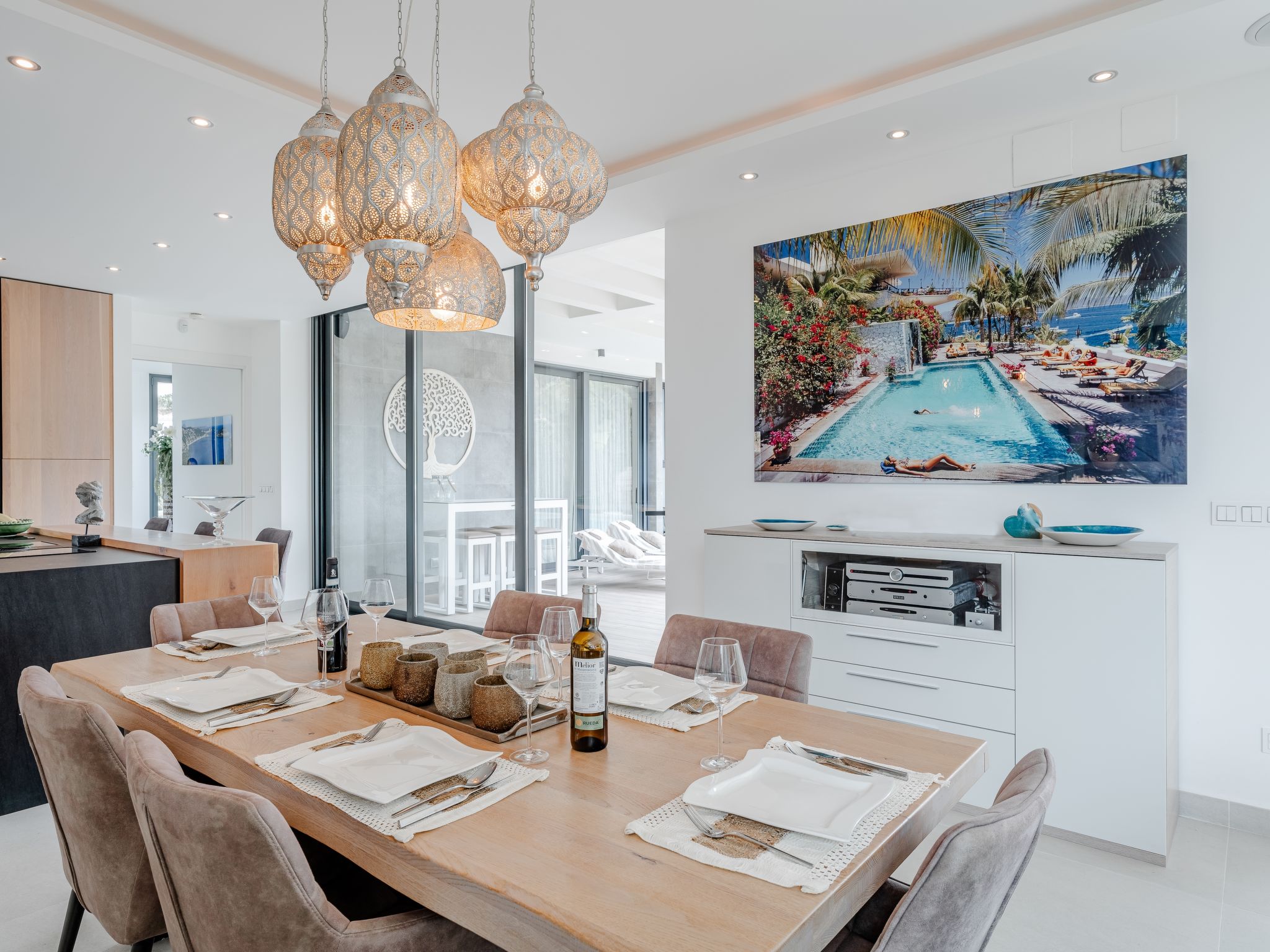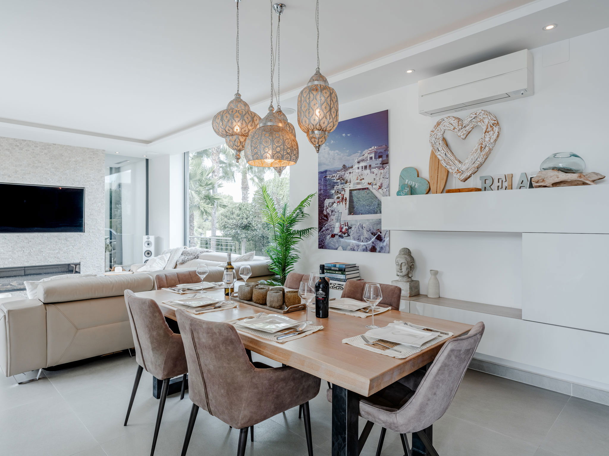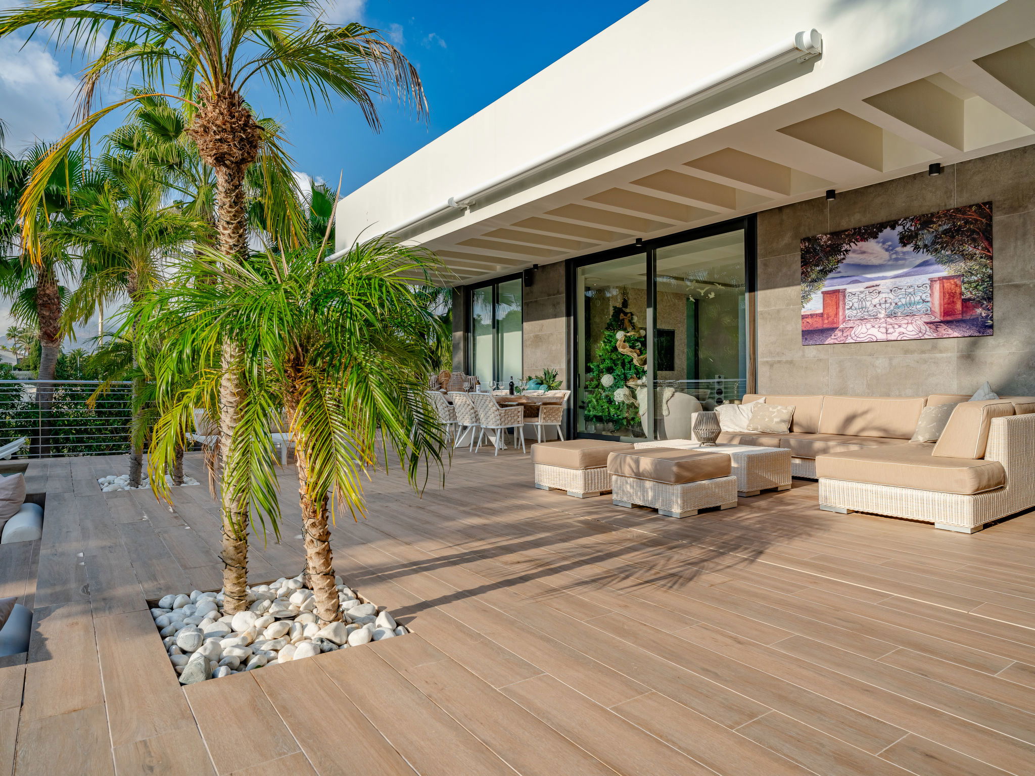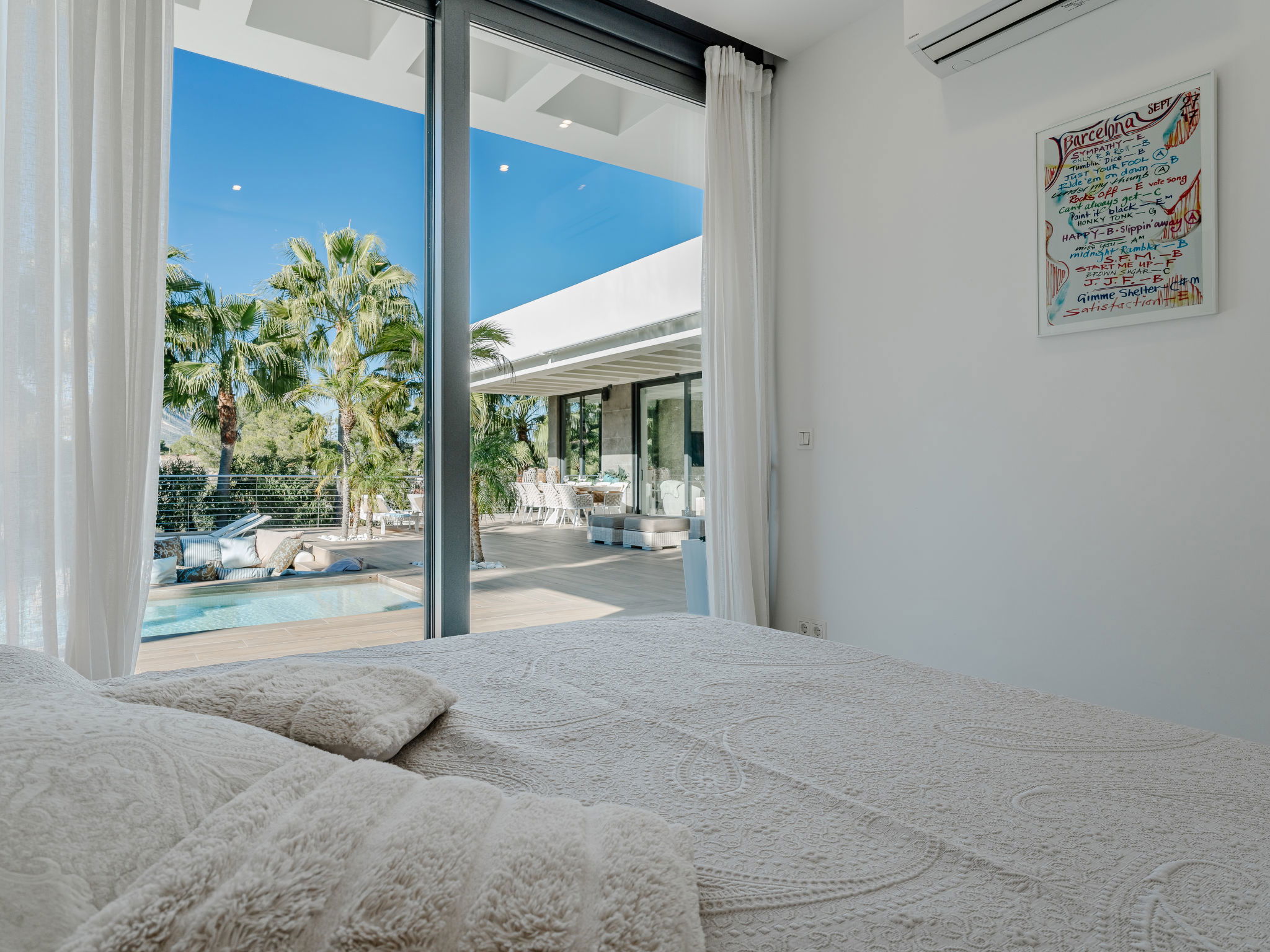 "Villa Essence", 4-room villa 220 m2 on 2 levels. Spacious and bright, very modern and stylish furnishings: living/dining room with satellite TV, air conditioning and forced-air heating. Exit to the terrace, to the swimming pool. 1 room with 1 french bed (2 x 90 cm, length 200 cm), shower/WC, air conditioning, fan and forced-air heating. Exit to the terrace, to the swimming pool. 1 room with 1 double bed (2 x 90 cm, length 200 cm), bath/shower/WC, air conditioning, fan and forced-air heating. Exit to the terrace, to the swimming pool. Large, open kitchen (oven, dishwasher, 5 induction hot plates, toaster, kettle, microwave, freezer, electric coffee machine, cooking island) with air conditioning and forced-air heating. Exit to the patio, to the swimming pool. Upper floor: 1 room 100 m2 with Dressing room with 1 french bed (180 cm, length 200 cm), separate WC, shower, air conditioning, fan and forced-air heating. Exit to the terrace. Large terrace, large garden. Terrace furniture, barbecue, deck chairs, sitting area. Very beautiful view of the mountains, the swimming pool and the garden. Facilities: washing machine, dryer, iron, children's high chair, baby cot, hair dryer. Internet (WiFi, free). Parking. VT-498490-A // Reg. Nr.: ESFCTU00000307100093229200000000000000000VT-498490-A1