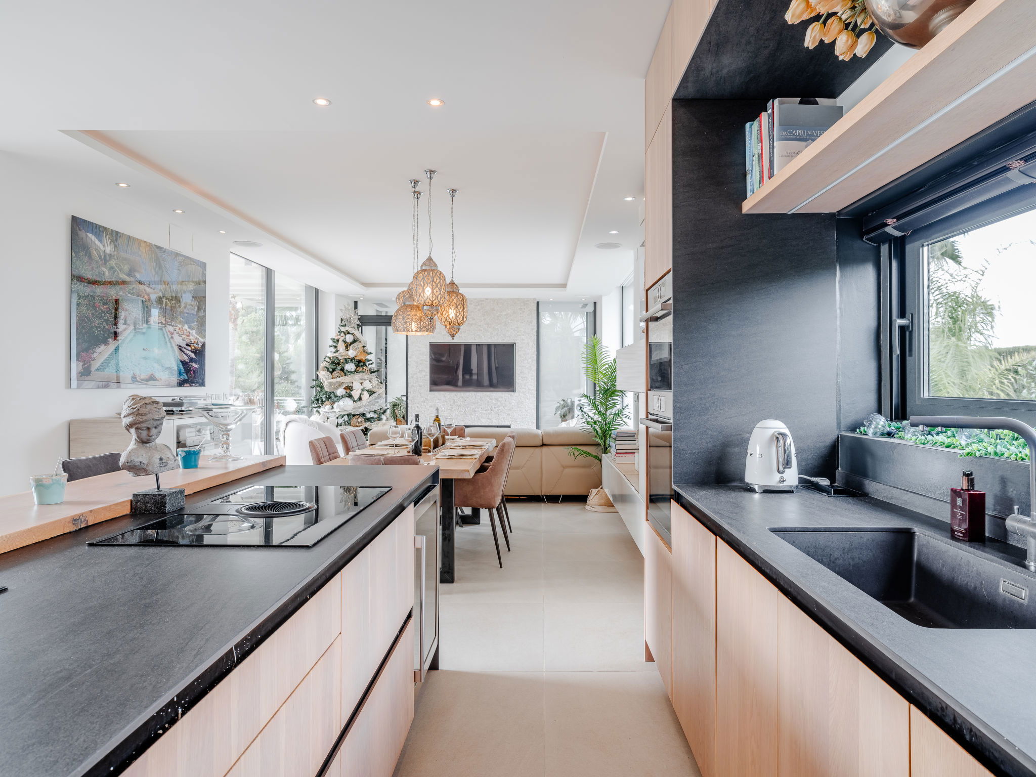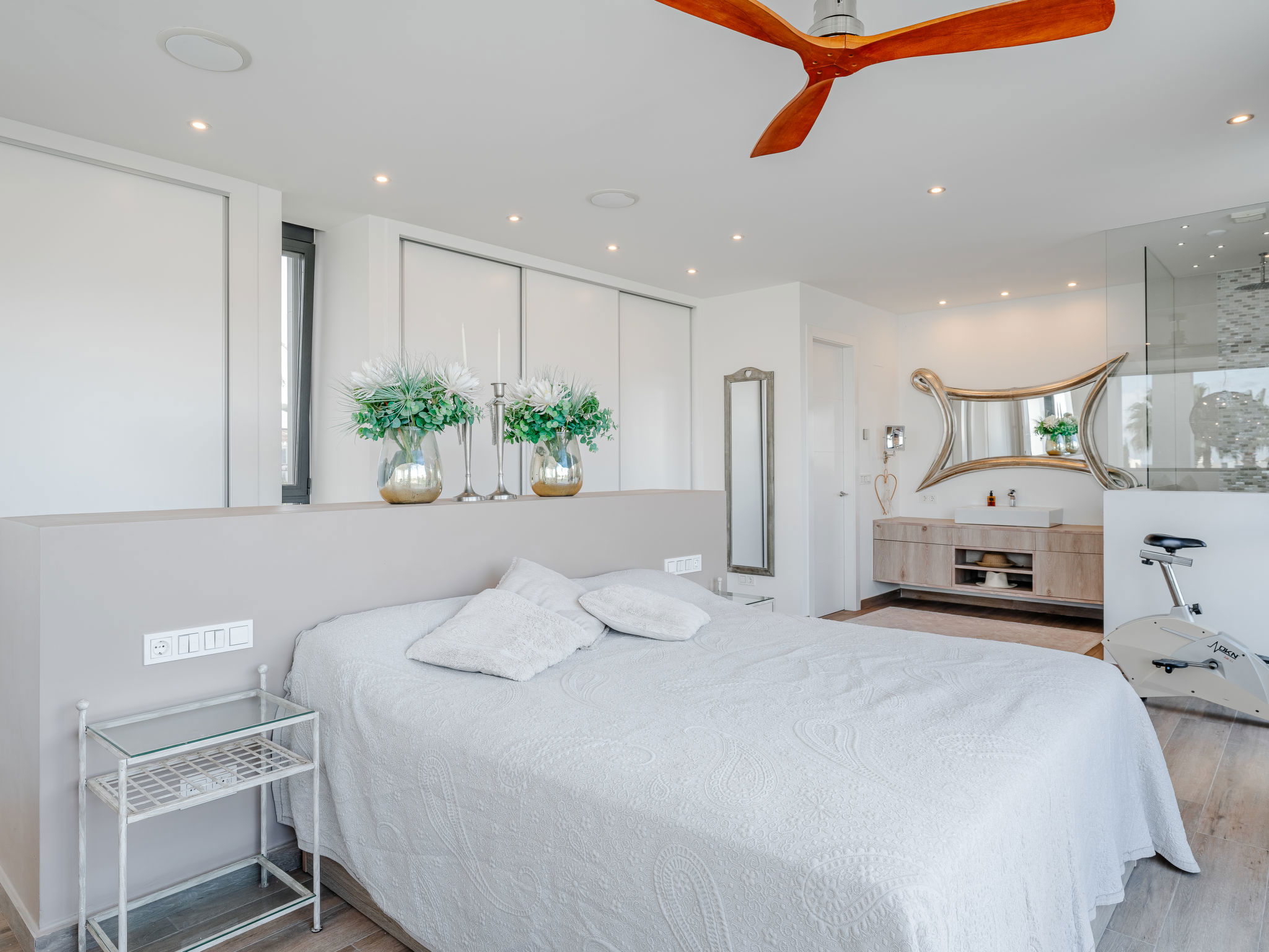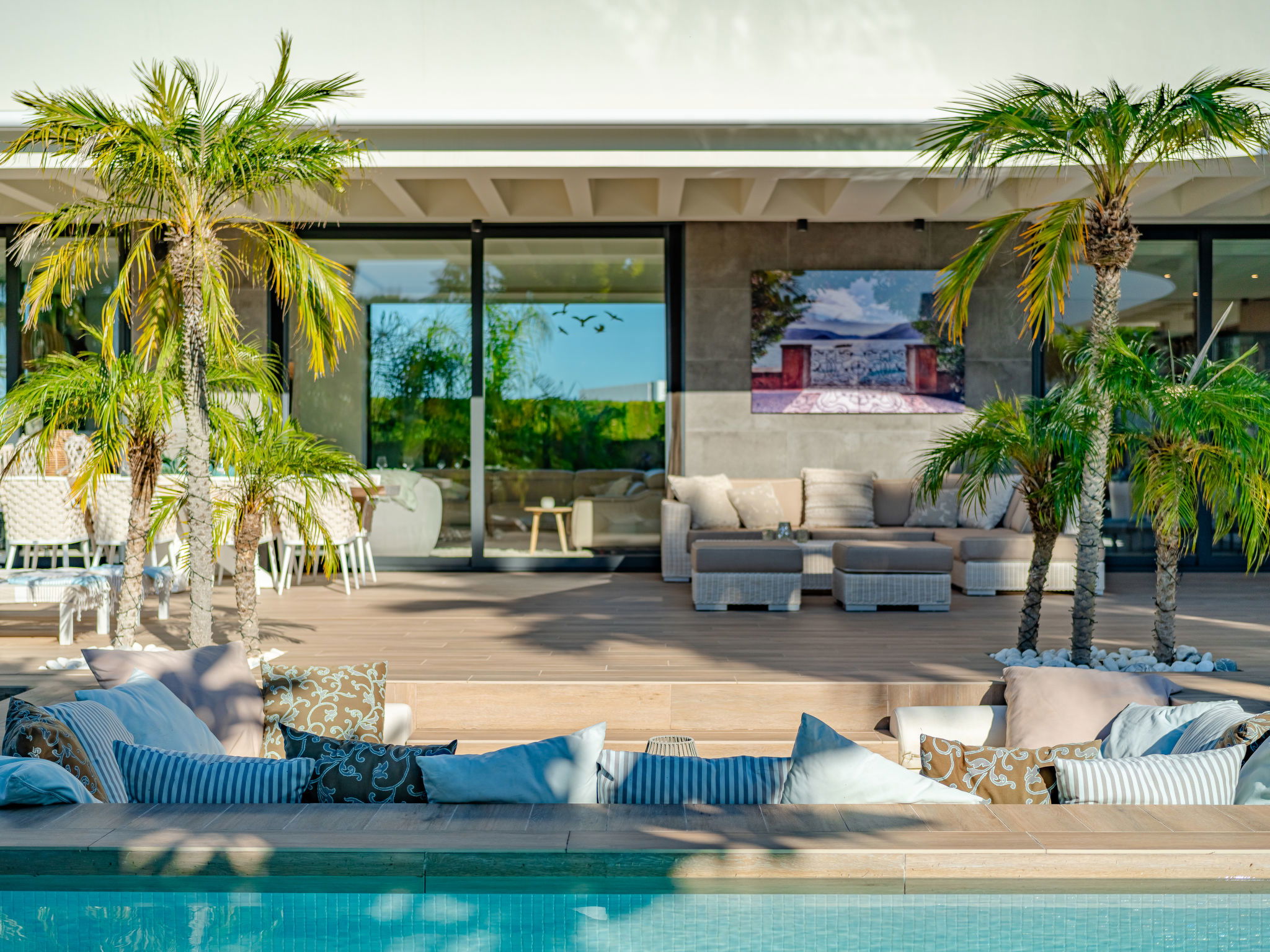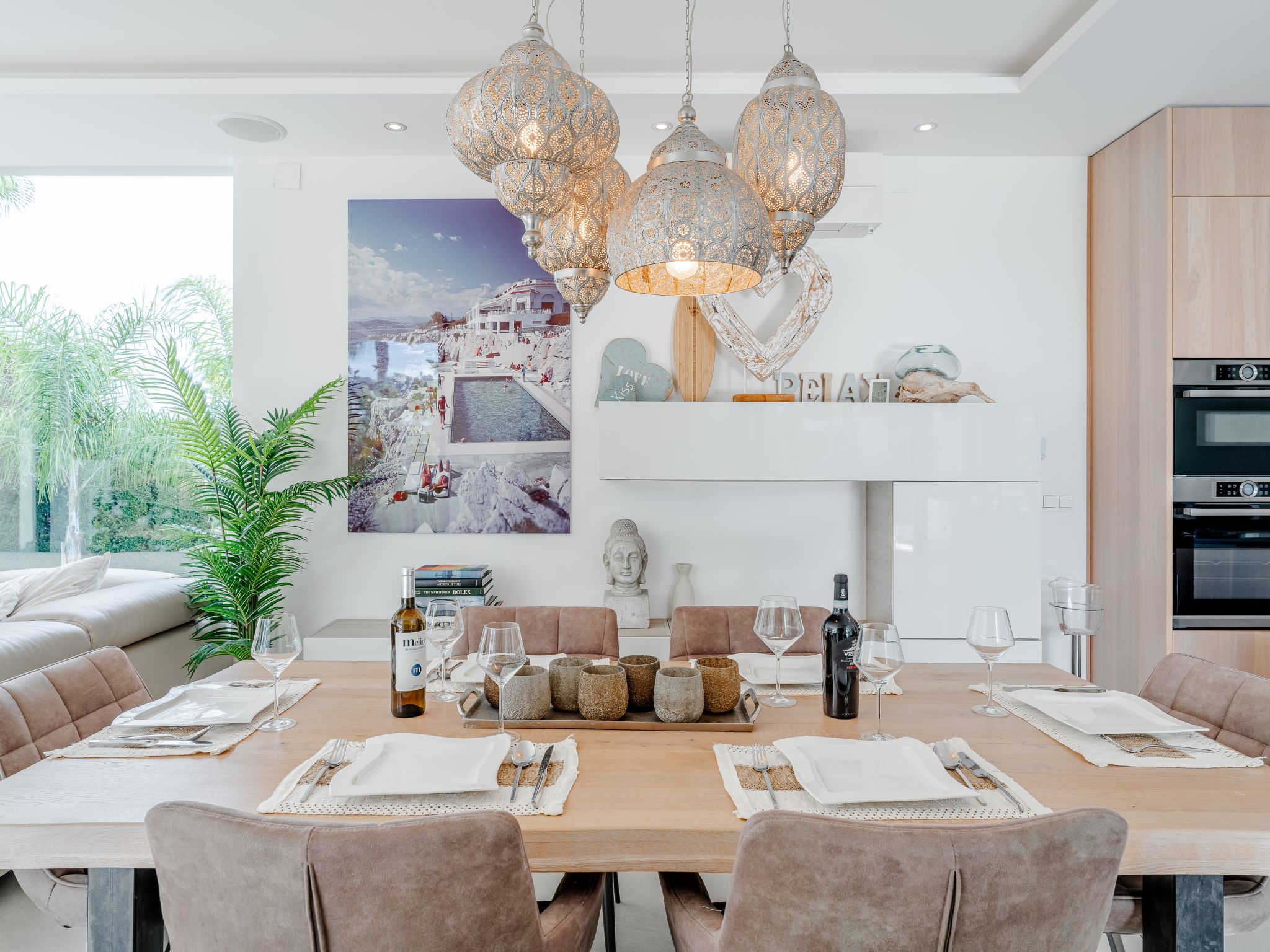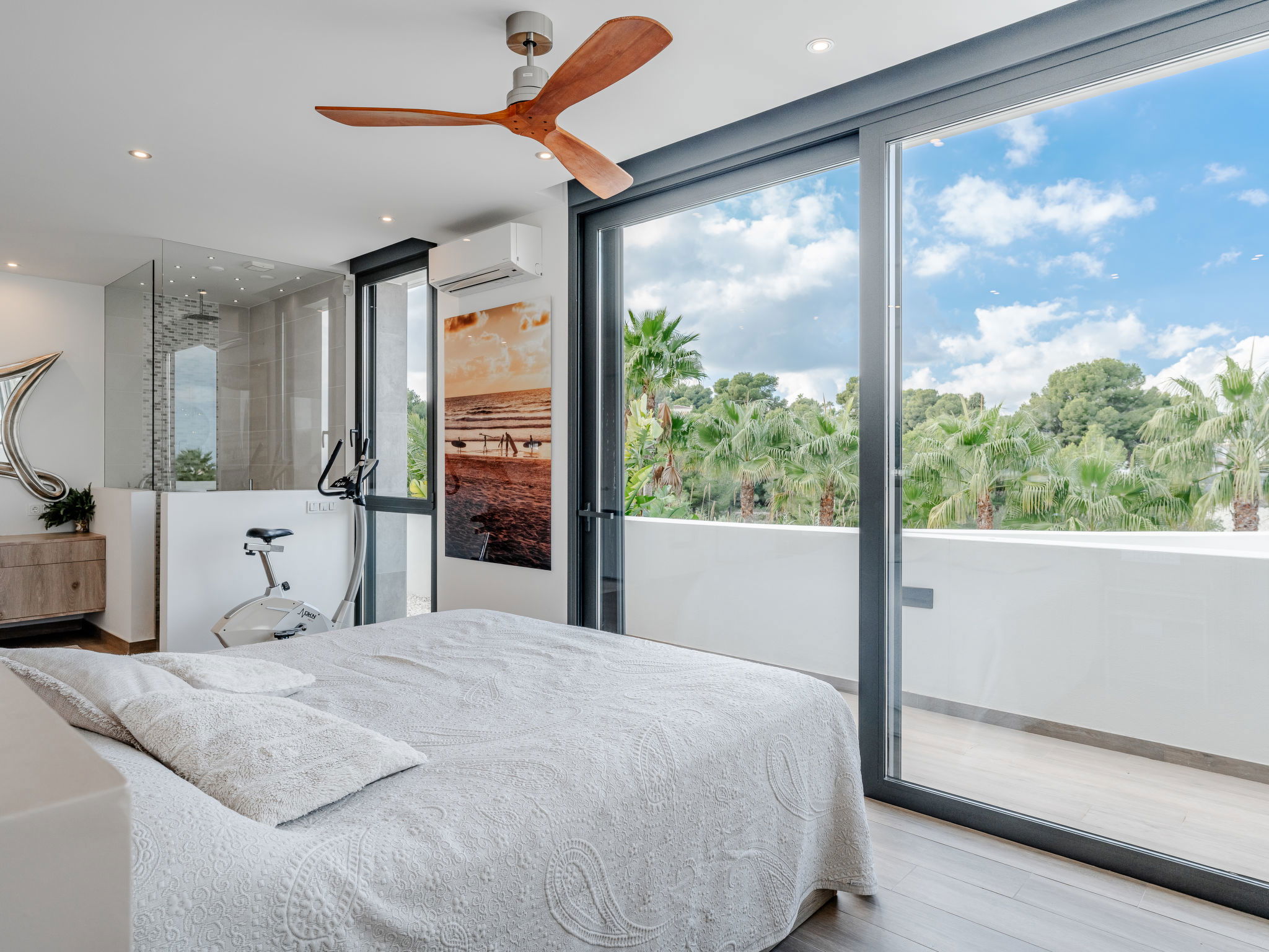 "Villa Essence", 4-room villa 220 m2 on 2 levels. Spacious and bright, very modern and stylish furnishings: living/dining room with satellite TV, air conditioning and forced-air heating. Exit to the terrace, to the swimming pool. 1 room with 1 french bed (2 x 90 cm, length 200 cm), shower/WC, air conditioning, fan and forced-air heating. Exit to the terrace, to the swimming pool. 1 room with 1 double bed (2 x 90 cm, length 200 cm), bath/shower/WC, air conditioning, fan and forced-air heating. Exit to the terrace, to the swimming pool. Large, open kitchen (oven, dishwasher, 5 induction hot plates, toaster, kettle, microwave, freezer, electric coffee machine, cooking island) with air conditioning and forced-air heating. Exit to the patio, to the swimming pool. Upper floor: 1 room 100 m2 with Dressing room with 1 french bed (180 cm, length 200 cm), separate WC, shower, air conditioning, fan and forced-air heating. Exit to the terrace. Large terrace, large garden. Terrace furniture, barbecue, deck chairs, sitting area. Very beautiful view of the mountains, the swimming pool and the garden. Facilities: washing machine, dryer, iron, children's high chair, baby cot, hair dryer. Internet (WiFi, free). Parking. VT-498490-A // Reg. Nr.: ESFCTU00000307100093229200000000000000000VT-498490-A1