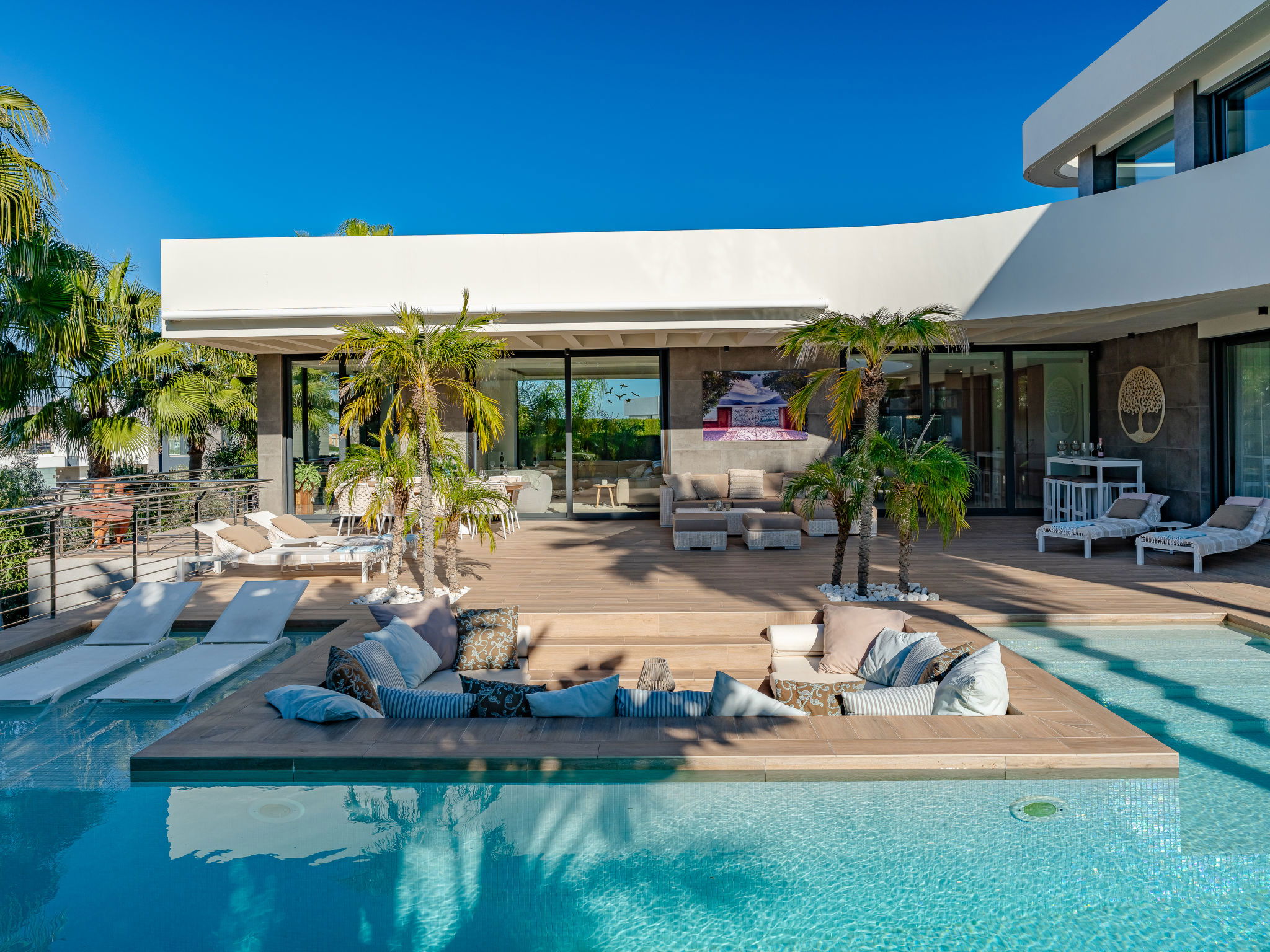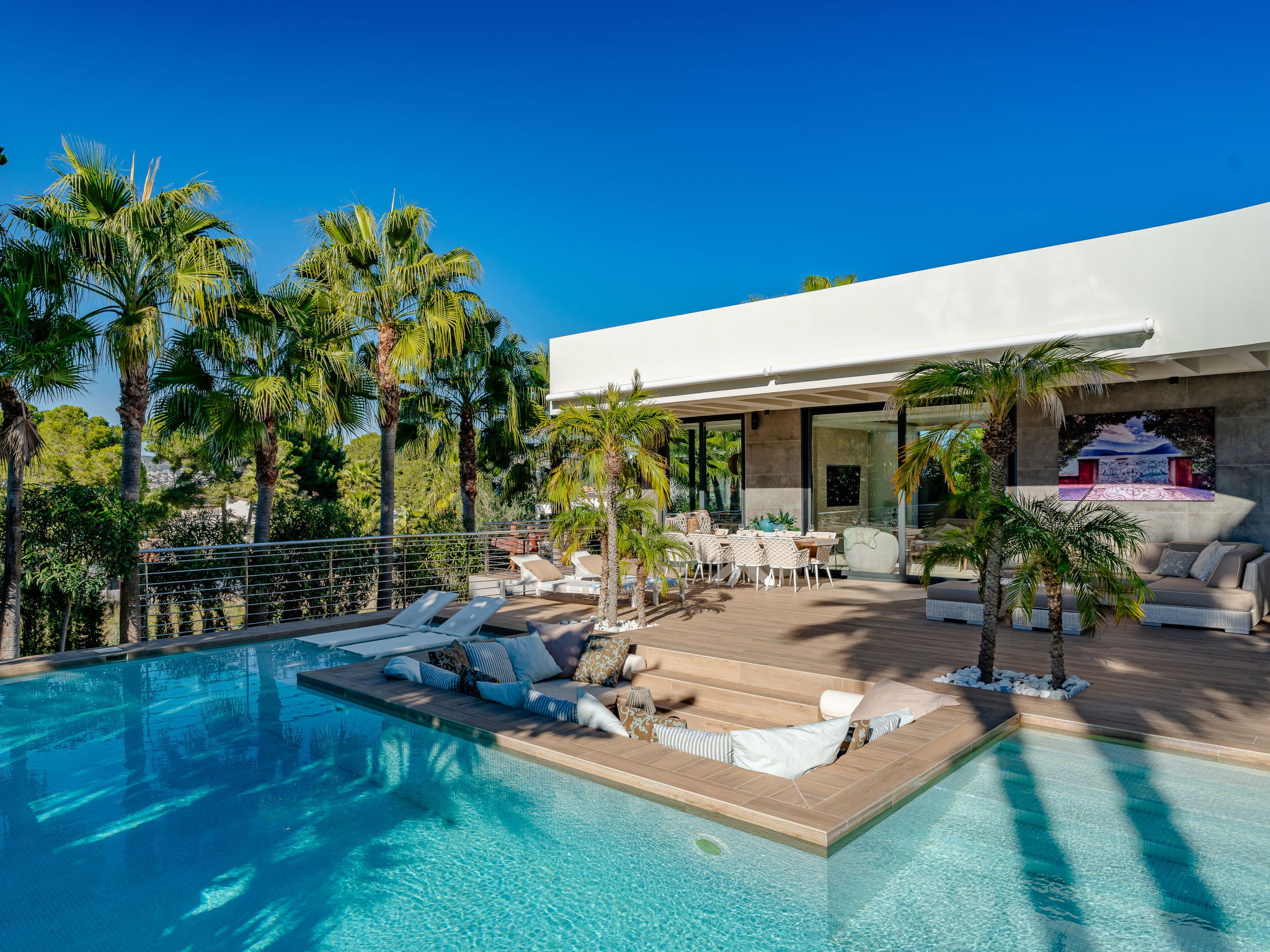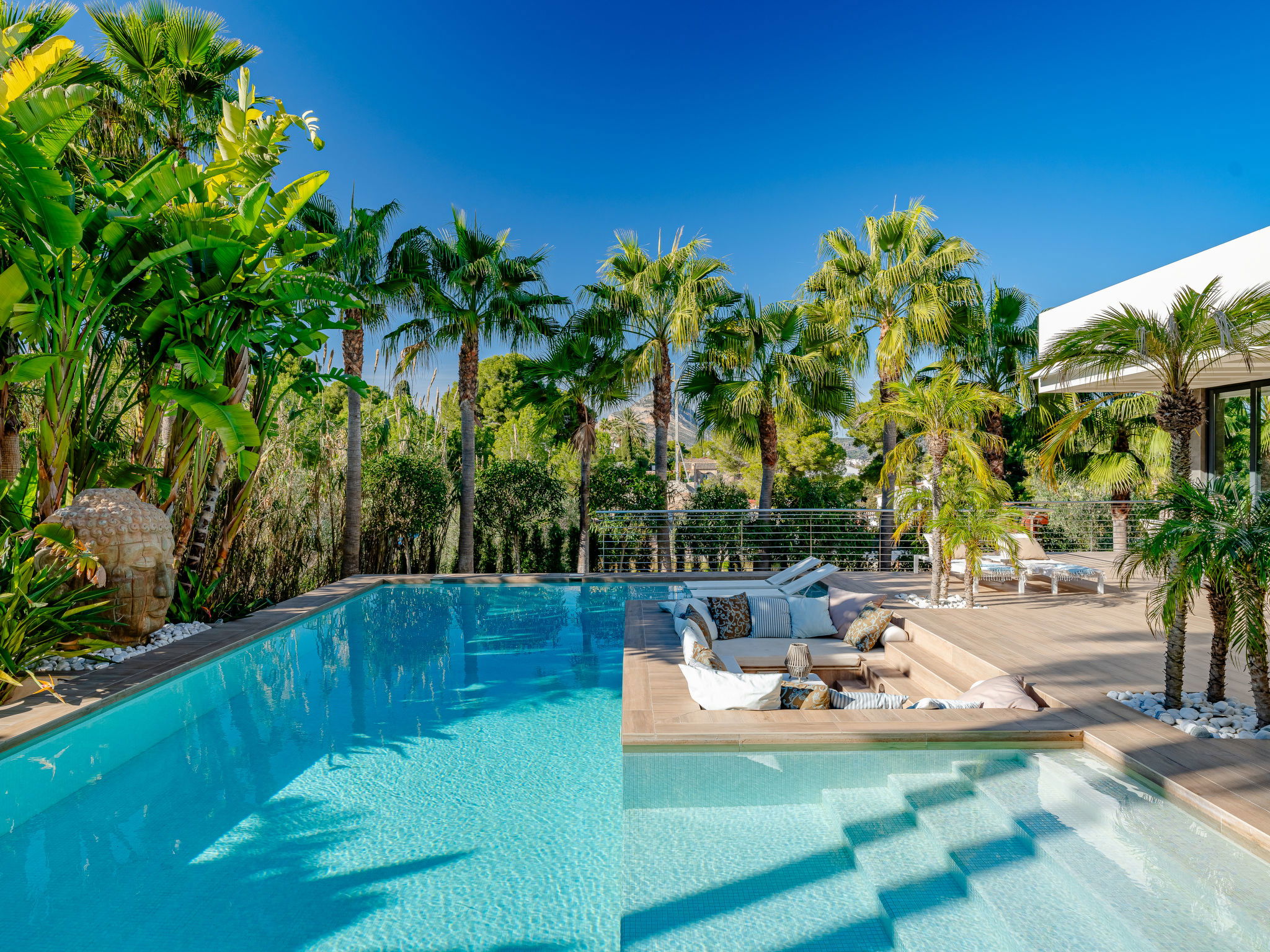 Very large, very modern, luxurious villa "Essence", 2 storeys. In the district of Adsubia, in the resort 1.3 km from the centre of Playa del Arenal Javea, in a quiet, sunny position, 1.3 km from the sea. Private: large, beautiful, well-kept terraced garden, swimming pool angular (9 x 4 m, depth 40 - 250 cm, seasonal availability: 01.Jan. - 31.Dec.) with internal staircase. Outdoor shower, garden furniture, barbecue, parking on the premises. Shop 1.3 km, supermarket 210 m, restaurant 300 m, café 600 m, bus stop 950 m, sandy beach "Arenal" 1.3 km, rocky beach "Cala Blanca" 1.7 km. Sports harbour 1.5 km, golf course (18 hole) 5 km, surf school 1.5 km, tennis 1.6 km. The owner does not accept any youth groups.