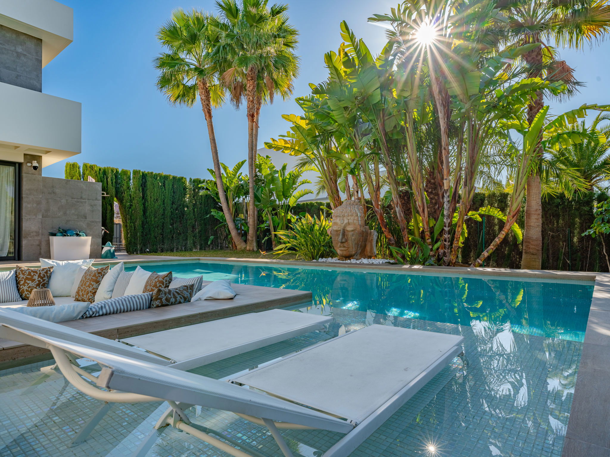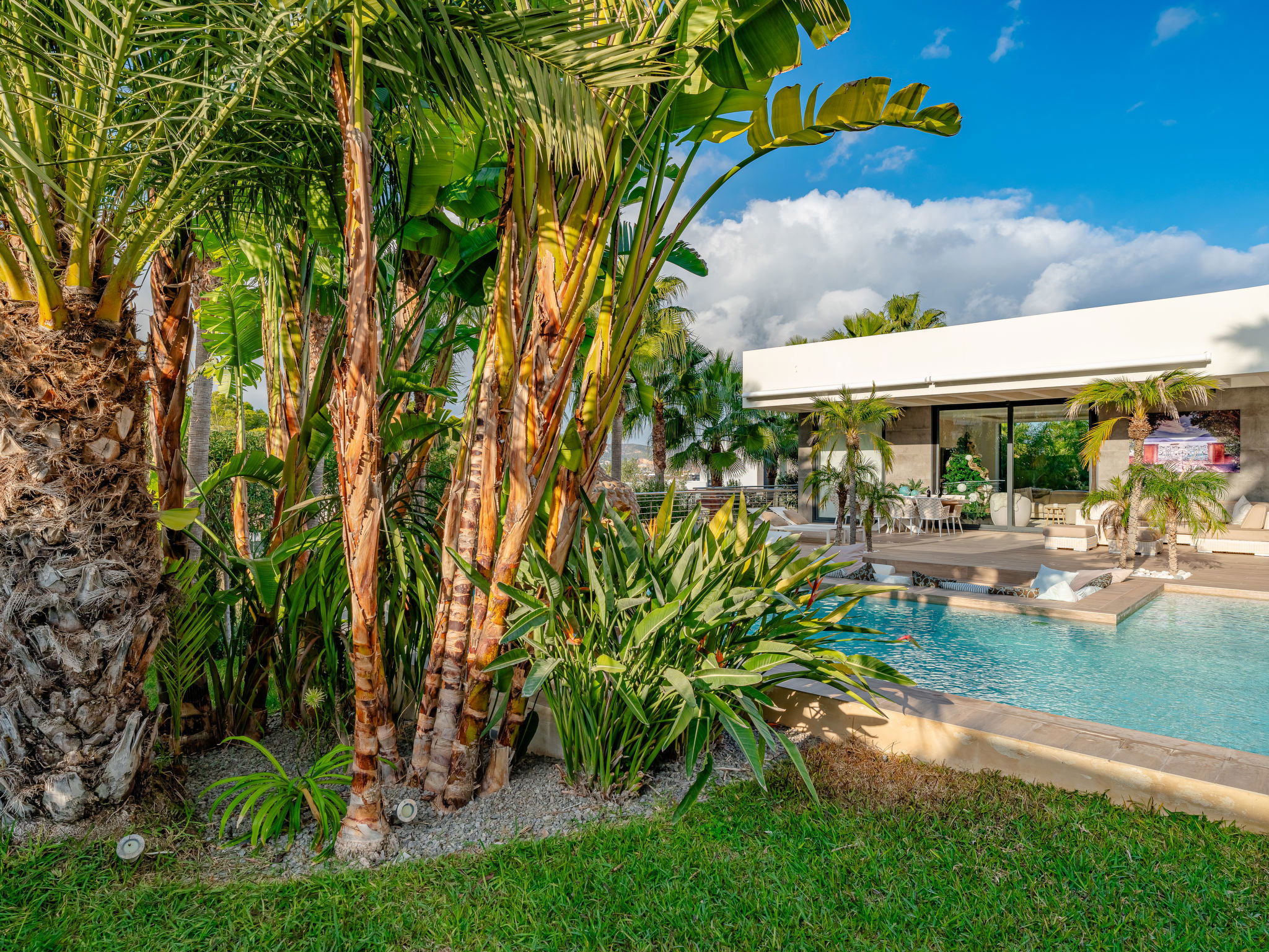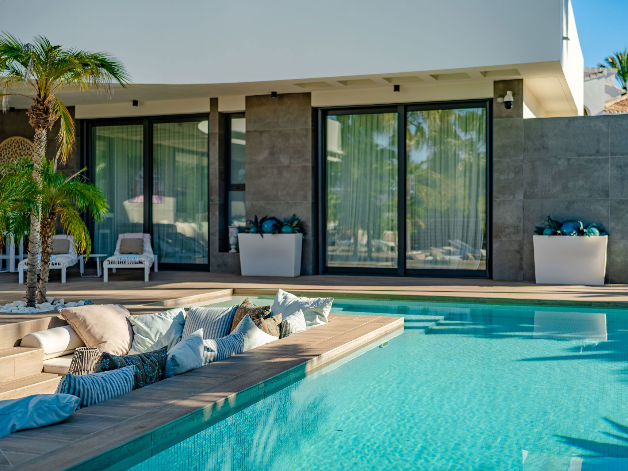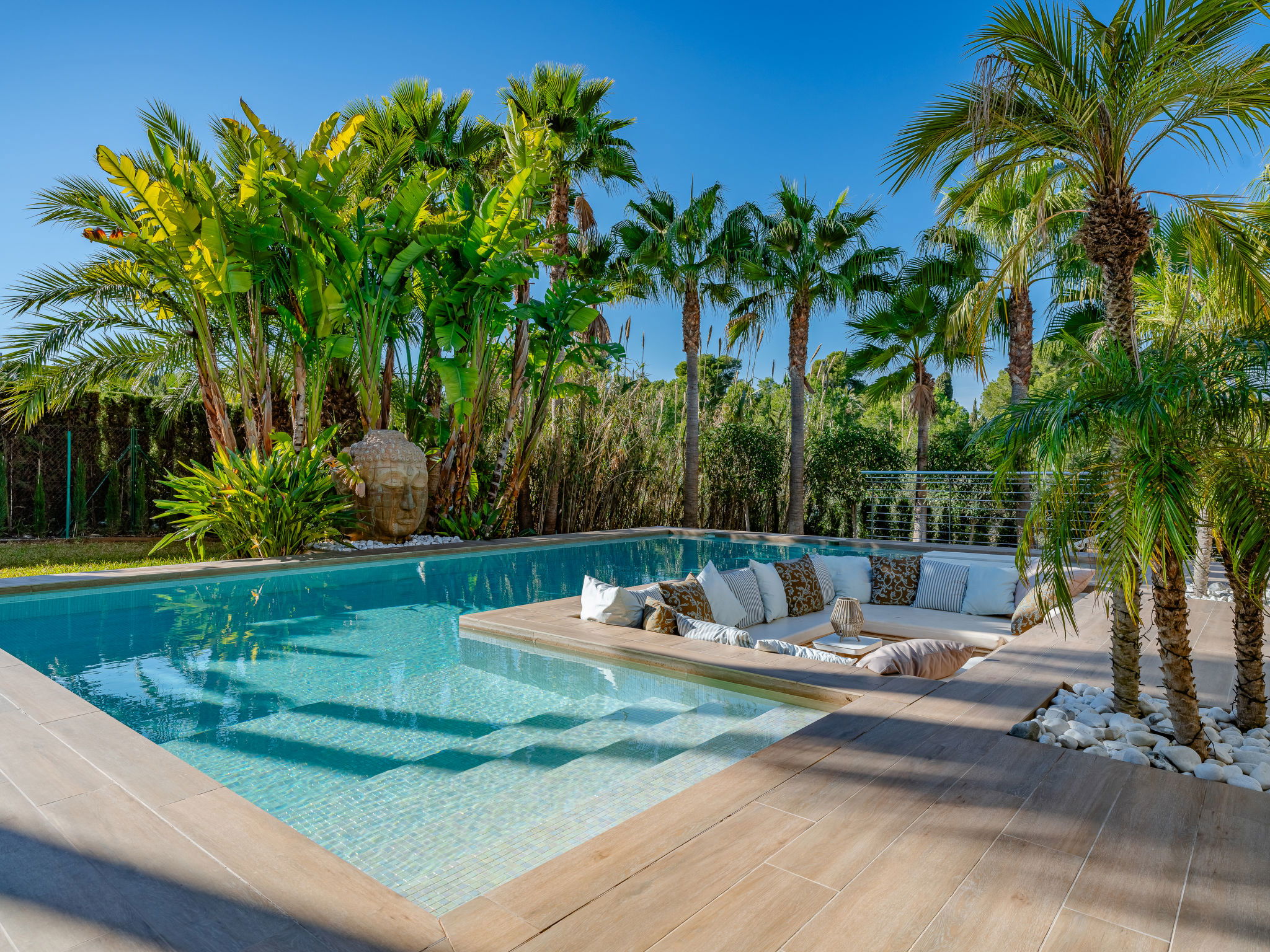 Very large, very modern, luxurious villa "Essence", 2 storeys. In the district of Adsubia, in the resort 1.3 km from the centre of Playa del Arenal Javea, in a quiet, sunny position, 1.3 km from the sea. Private: large, beautiful, well-kept terraced garden, swimming pool angular (9 x 4 m, depth 40 - 250 cm, seasonal availability: 01.Jan. - 31.Dec.) with internal staircase. Outdoor shower, garden furniture, barbecue, parking on the premises. Shop 1.3 km, supermarket 210 m, restaurant 300 m, café 600 m, bus stop 950 m, sandy beach "Arenal" 1.3 km, rocky beach "Cala Blanca" 1.7 km. Sports harbour 1.5 km, golf course (18 hole) 5 km, surf school 1.5 km, tennis 1.6 km. The owner does not accept any youth groups.