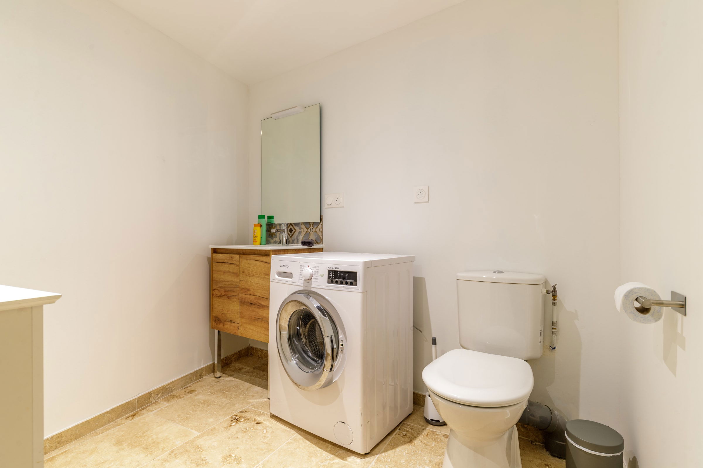 The bathroom is equipped with a shower, sink, hairdryer, and a washing machine for your convenience.