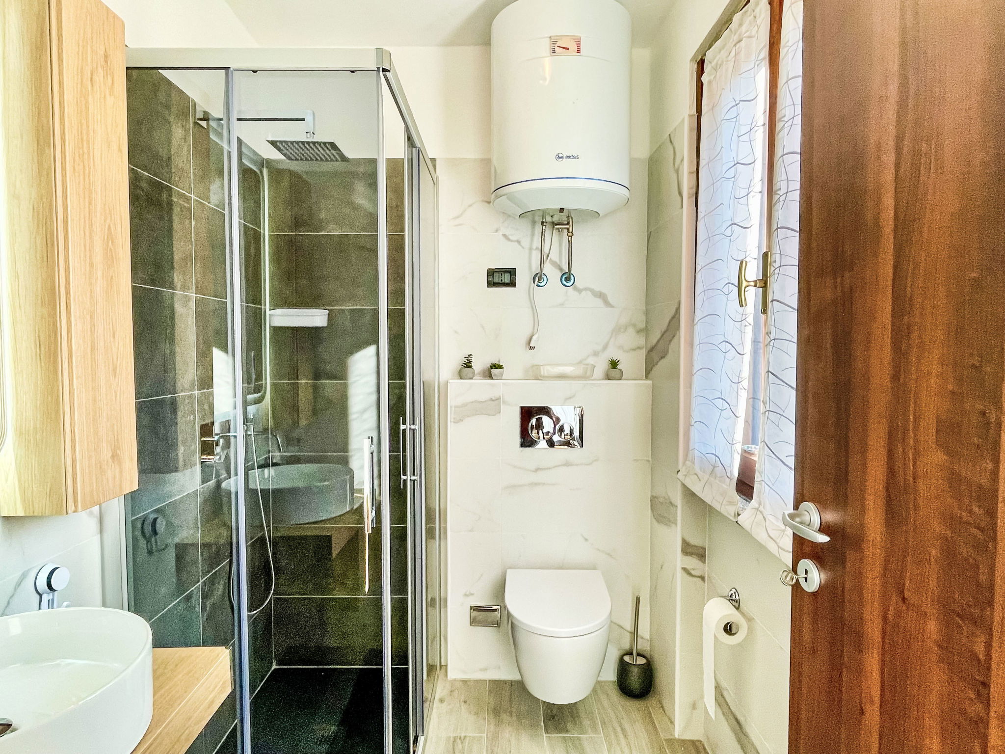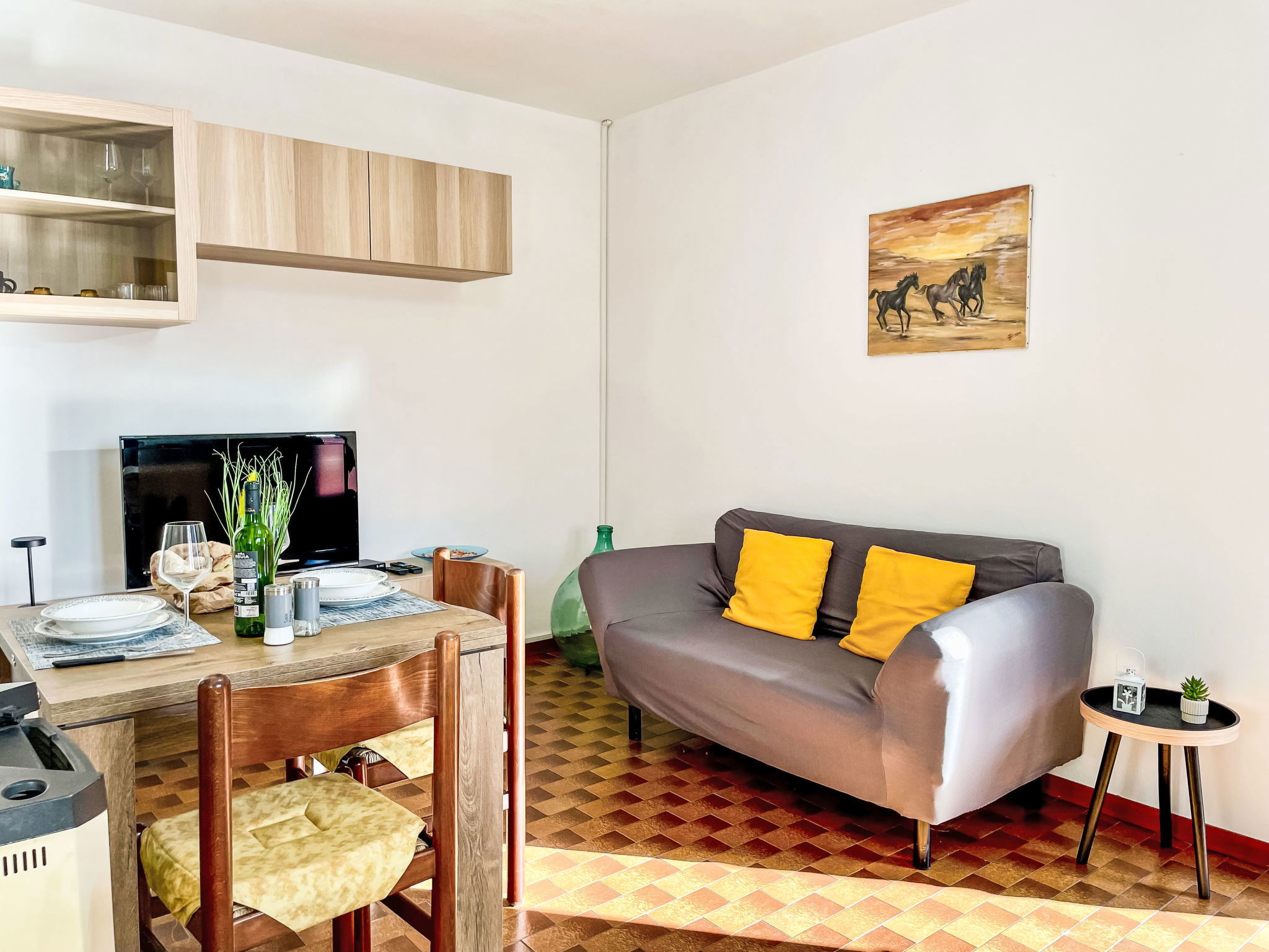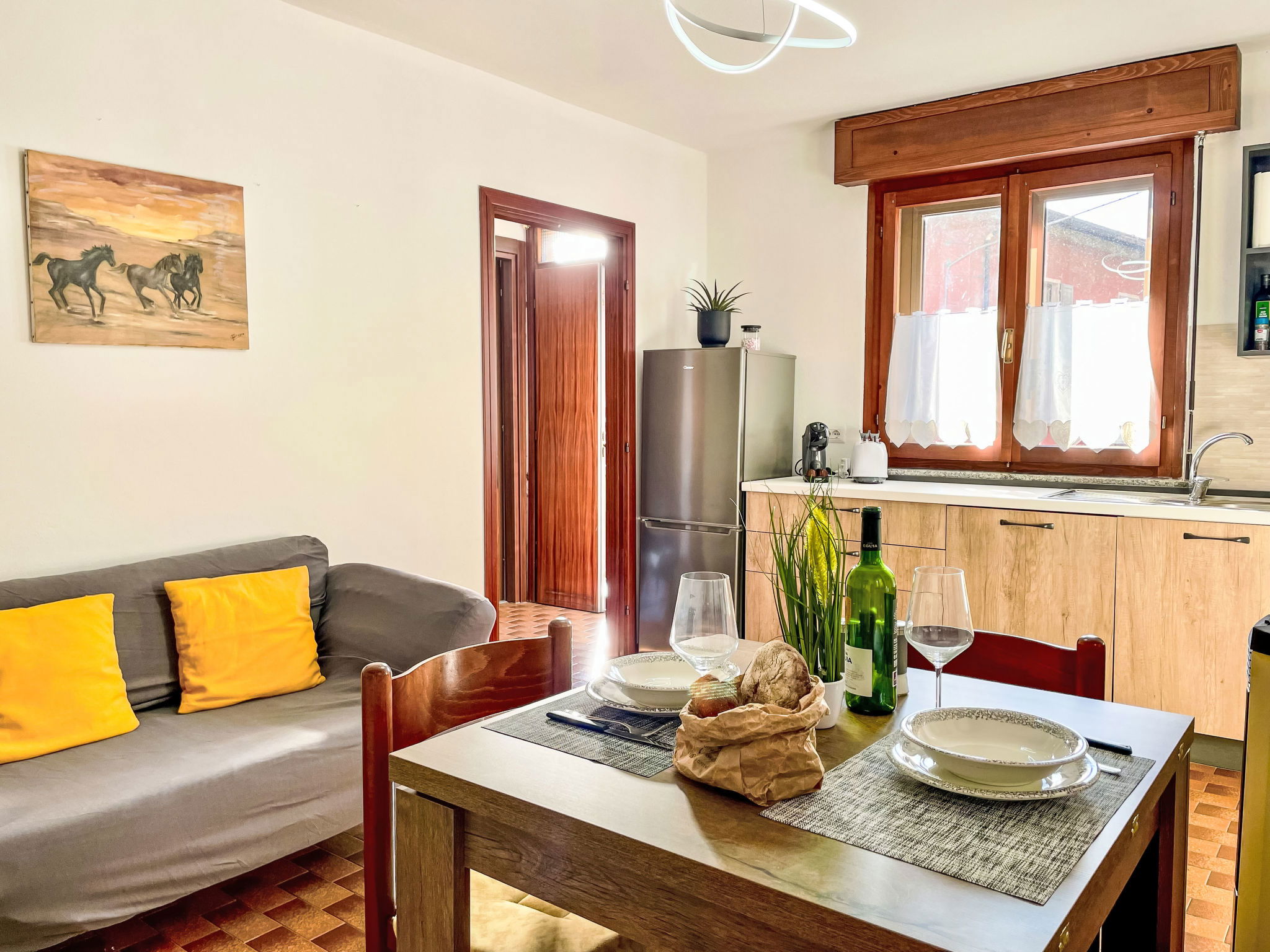 2-room apartment 50 m2 on 1st floor. Comfortable furnishings: living/dining room with TV. 1 room with 1 double bed. Open kitchen (oven, dishwasher, 4 induction hot plates, toaster, electric coffee machine). Exit to the garden, to the balcony. Shower/bidet/WC. Heating. Heating not available in all rooms. Small balcony, patio. Balcony furniture, deck chairs (2). Beautiful view of the countryside. Facilities: children's high chair, baby cot for up to 2 year olds, hair dryer. Internet (WiFi, free). Parking (1 car). Please note: non-smokers only. Maximum 1 pet/ dog allowed. Private entrance, fire extinguisher. IT013216C213WQDUU4