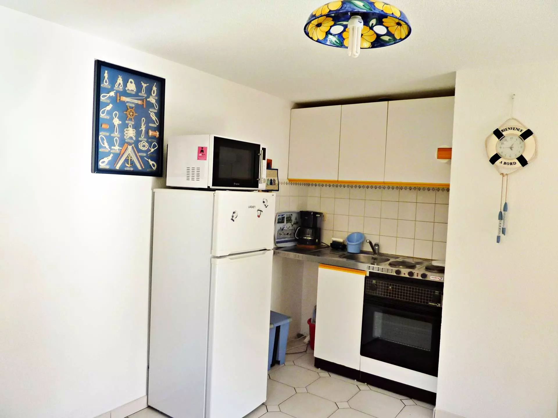 Fully equipped open kitchen: Electric hobs, refrigerator, freezer, oven, microwave, coffee maker and everything you need to cook.