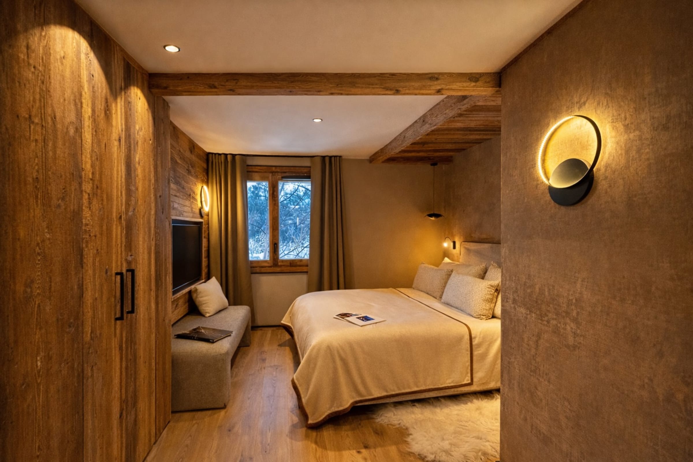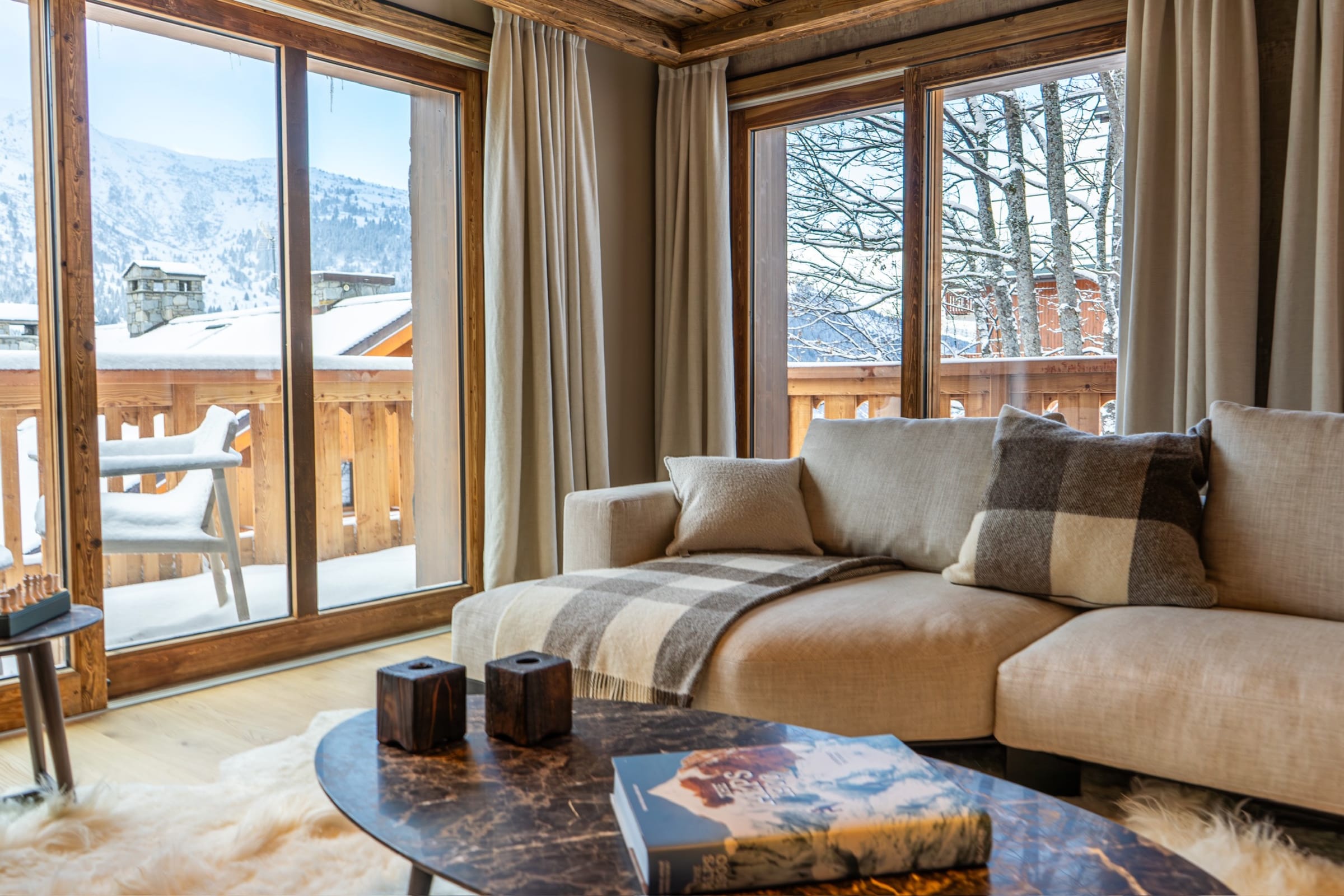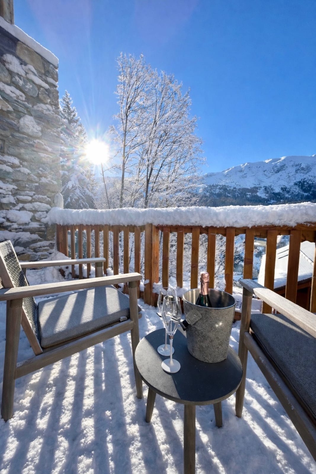 In Méribel (Morel area), Alpenglow is a stylish 125 m² apartment on the floor of a high-end residence, close to shops and around 100 m from the Morel chairlift. It features a warm alpine atmosphere with aged wood finishes, a bright living room with an ethanol fireplace, a fully equipped kitchen, a dining area, and a terrace with stunning mountain views.