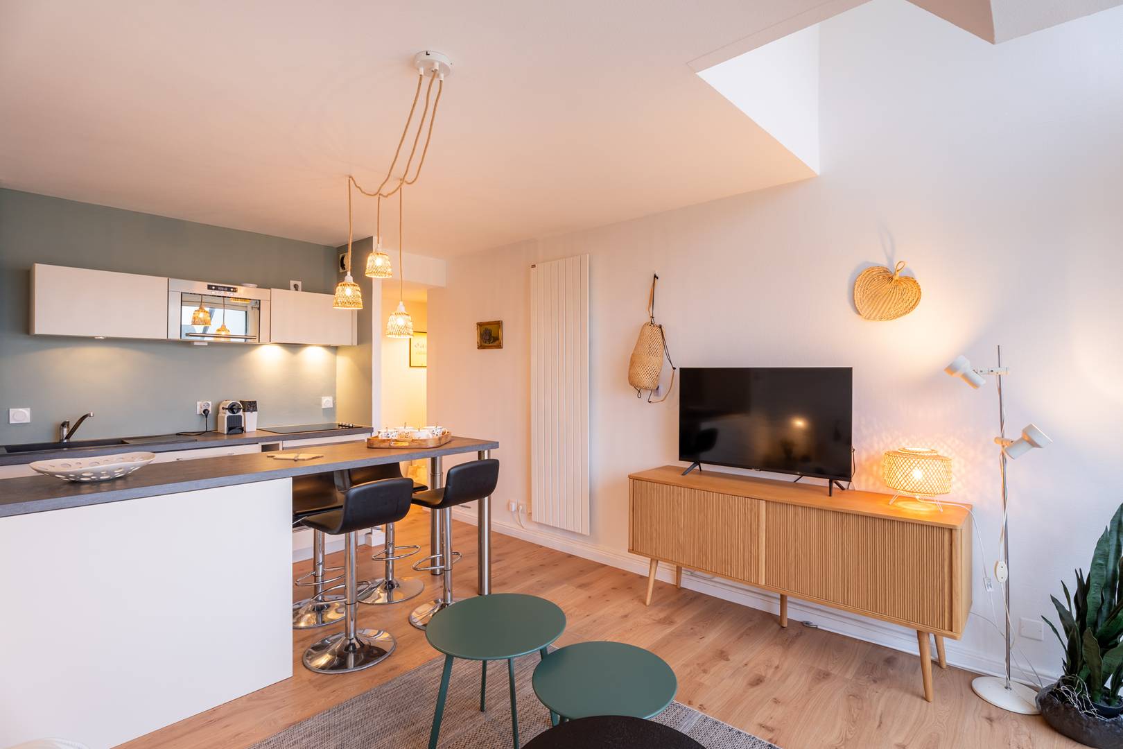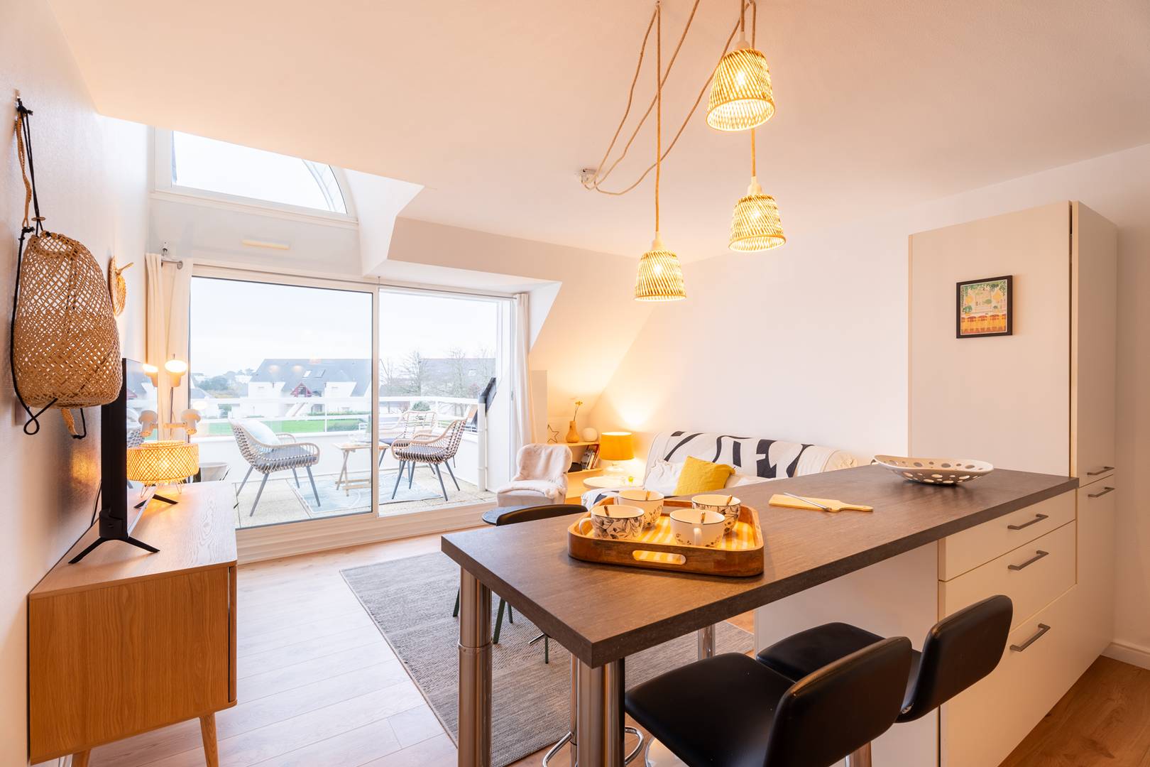 - Open-plan, fully equipped kitchen (4-ring ceramic hob, oven, microwave, refrigerator with freezer, dishwasher, washing machine). The extended countertop serves as a dining area with bar stools
