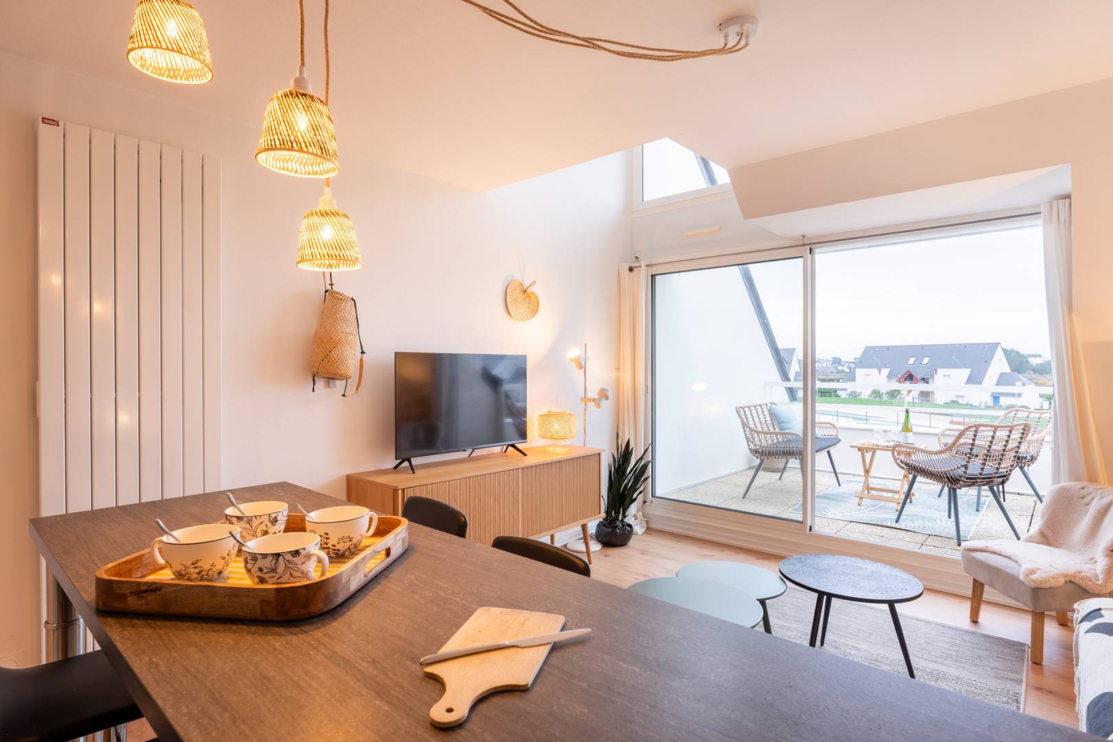 - Bright living room with lounge area (TV, sofa) opening onto a South-East facing balcony with garden furniture and an awning, offering a lovely view of the pool and residence gardens