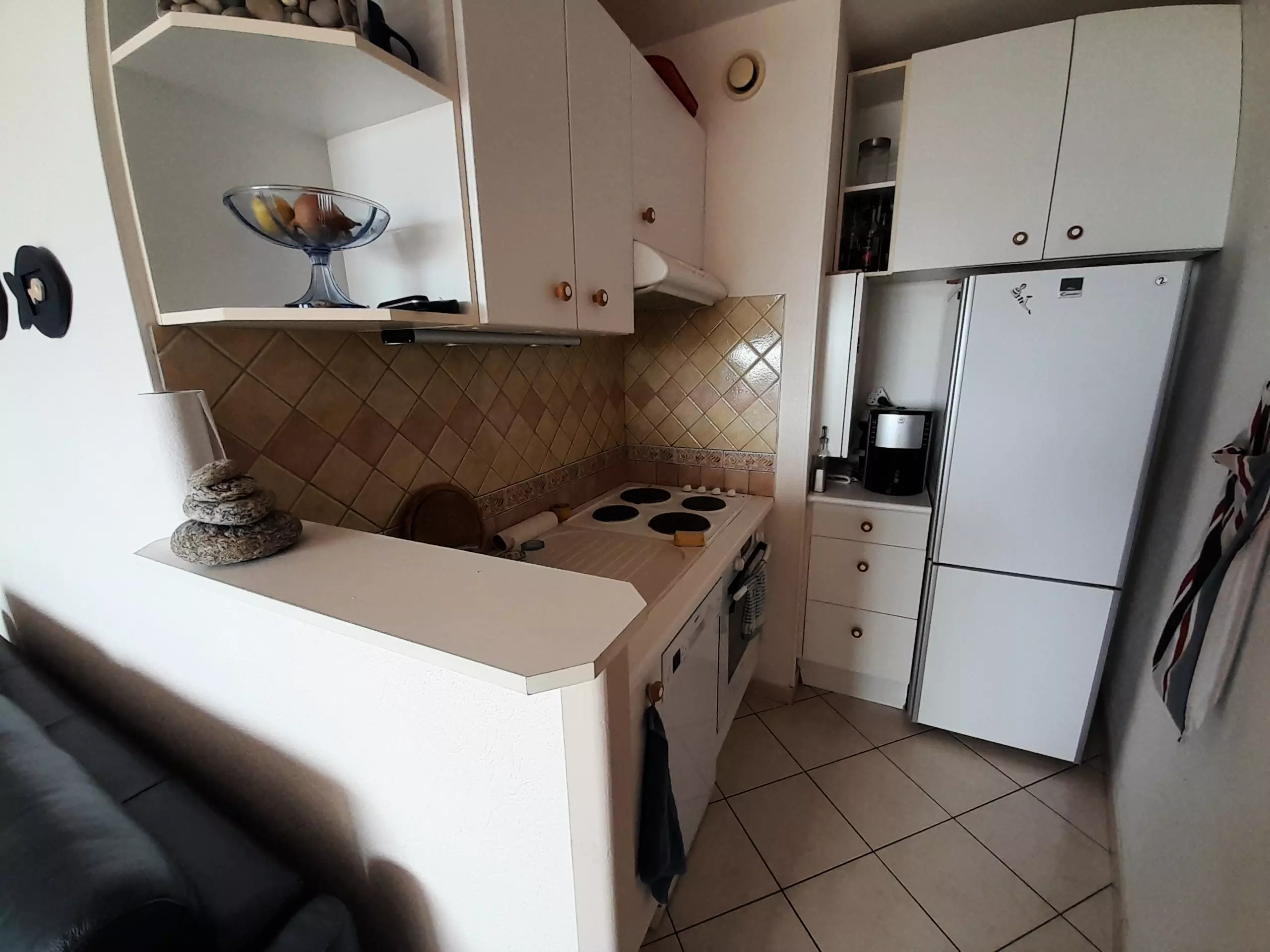 Upon entering, you will discover a small, cozy living room with a dining table and television, bathed in natural light and offering a sea view from the living room, ideal for your moments of relaxation.