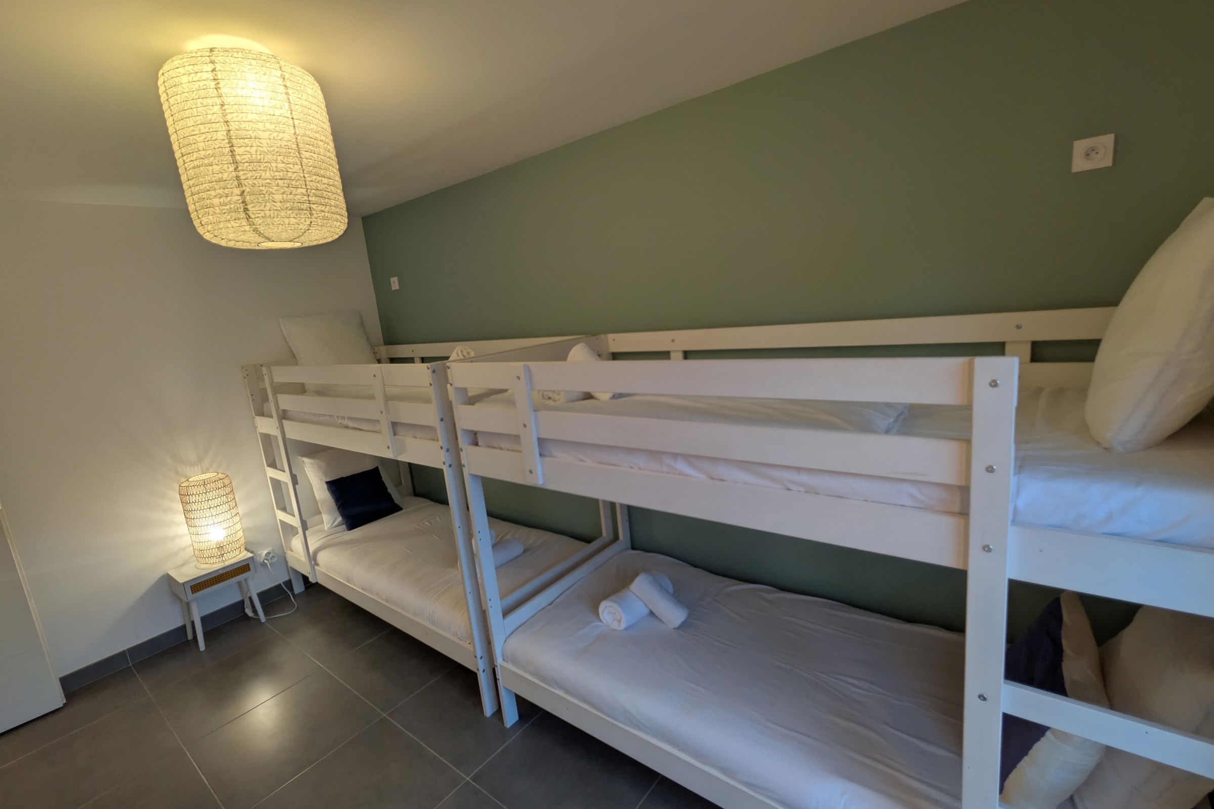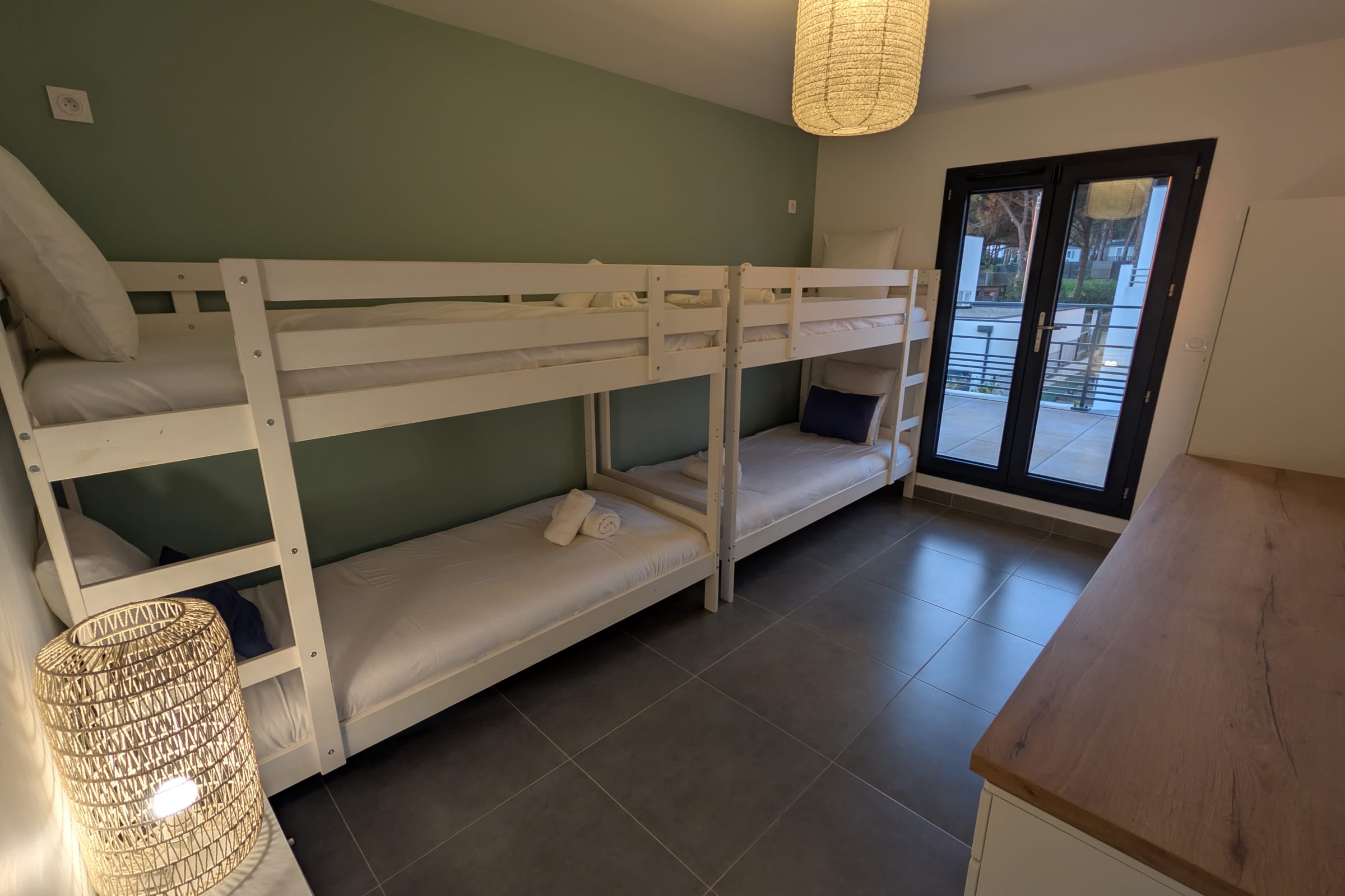 Designed around family comfort, the villa’s sleeping arrangements make holidays simple: parents enjoy the privacy of the primary suite with its own shower room, while the second double bedroom suits another couple or older kids. The dedicated bunk room sleeps four in single bunks (2 bunk beds, 2×2) and includes a large children’s desk—ideal for drawing, puzzles, or a quiet moment while dinner is prepared.