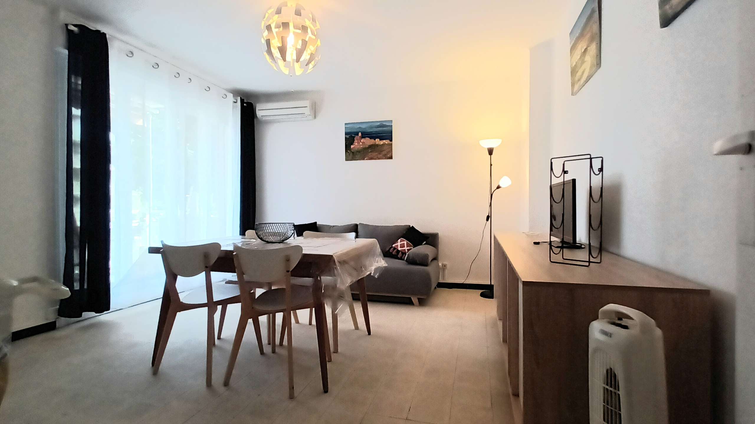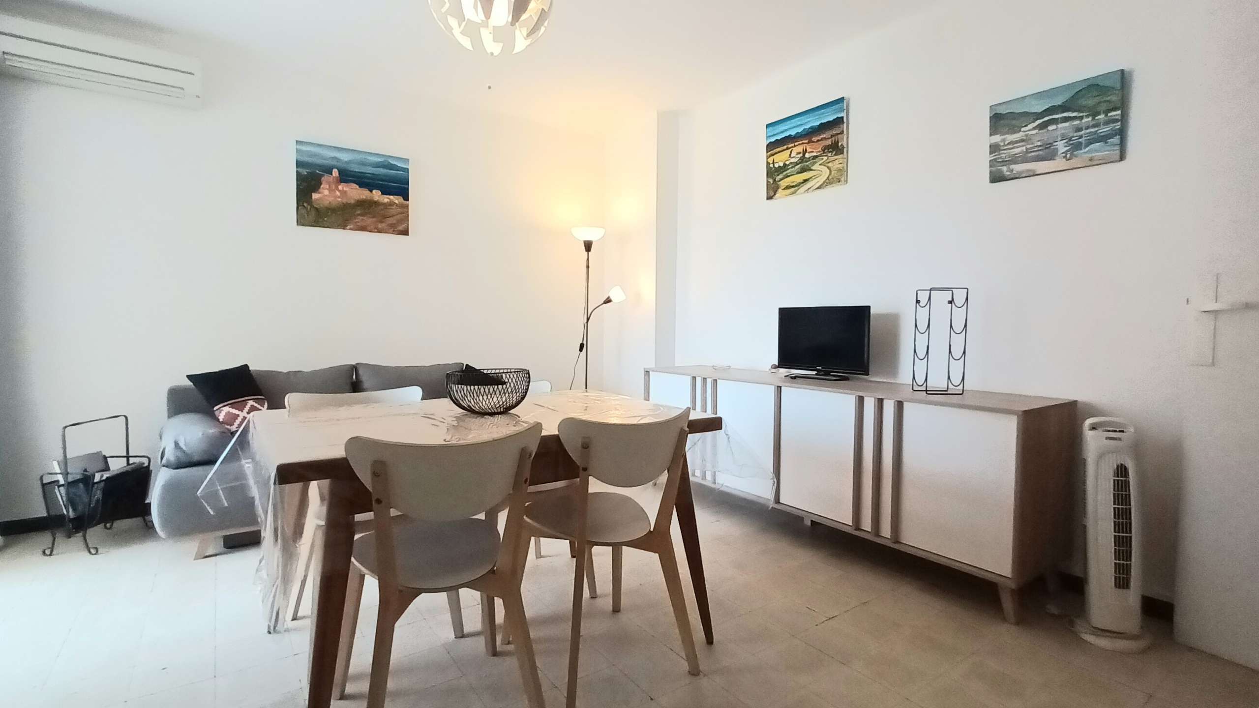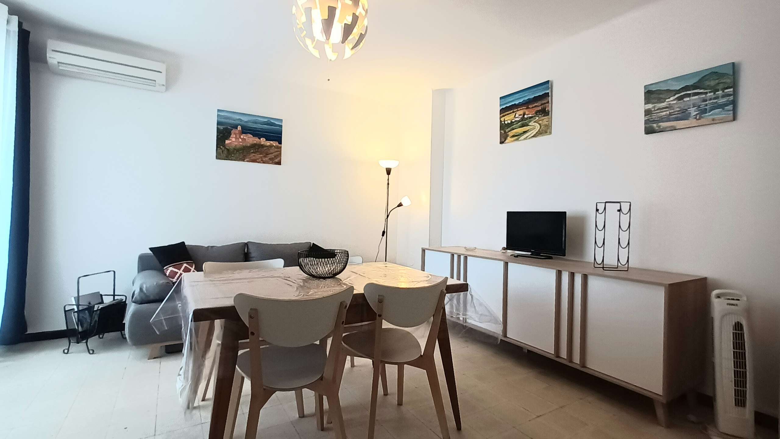 Air-conditioned, dual-aspect apartment on the 1st floor comprising an entrance hall leading to the living room with a 140cm sofa bed, a functional and well-equipped kitchen area, a bedroom with two single beds, and a bathroom with a toilet.