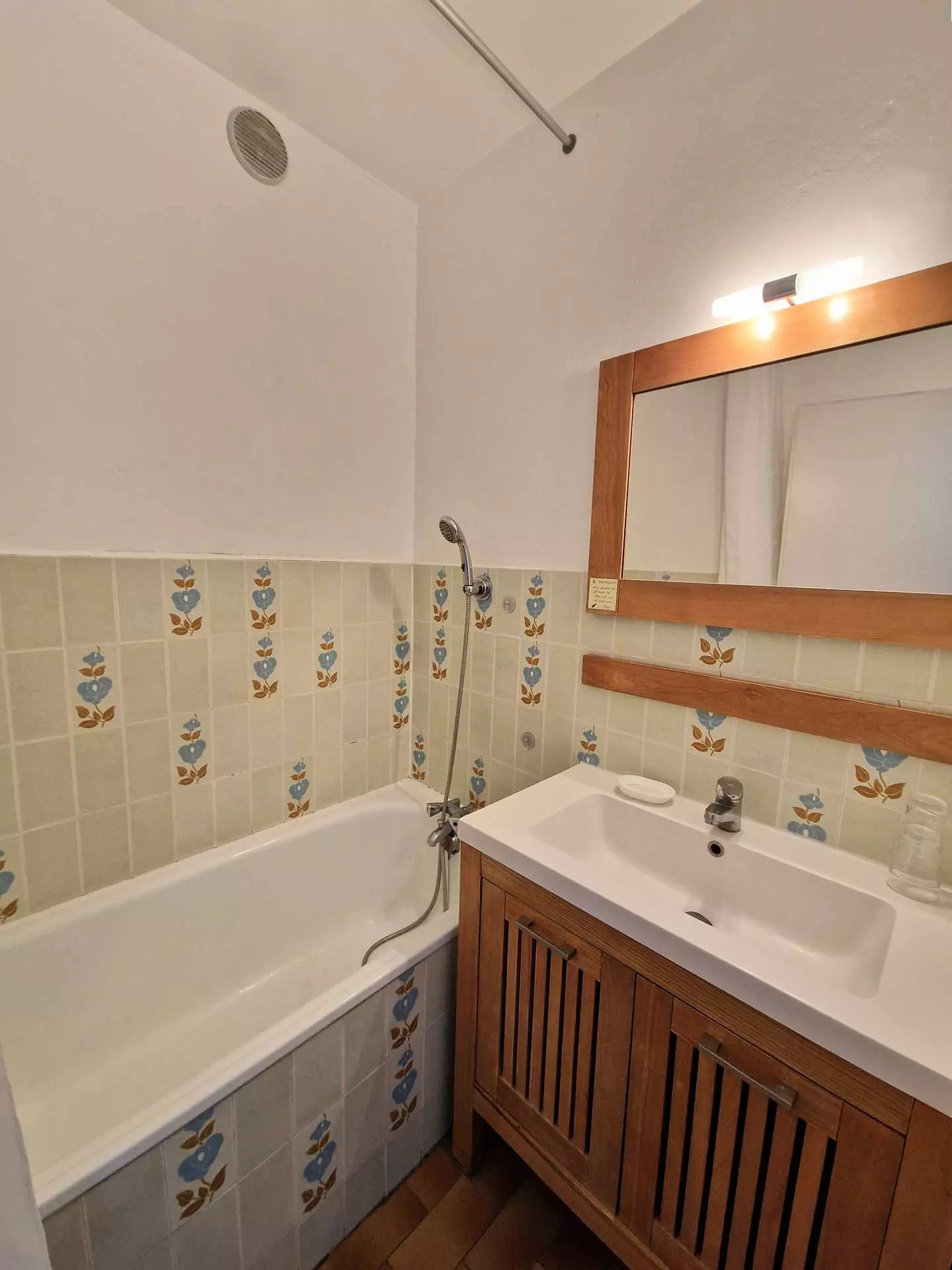 The apartment features a living room with a sofa bed, TV, and dining area. The fully equipped kitchen (ceramic hob, mini-oven, microwave, fridge-freezer, coffee maker, dishwasher) allows you to easily prepare your own meals. The comfortable bedroom, furnished with a double bed, offers direct access to the terrace through a window, letting you enjoy natural light from the moment you wake up. The bathroom with a bathtub provides added comfort.