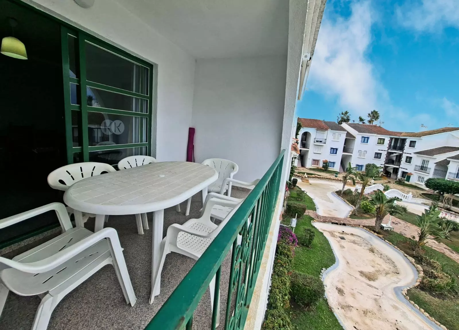 It has a terrace, internet access (Wifi), hair dryer, heat pump heating, air conditioning in the living room, communal swimming pool + children's pool, 1 fan, 1 television.
