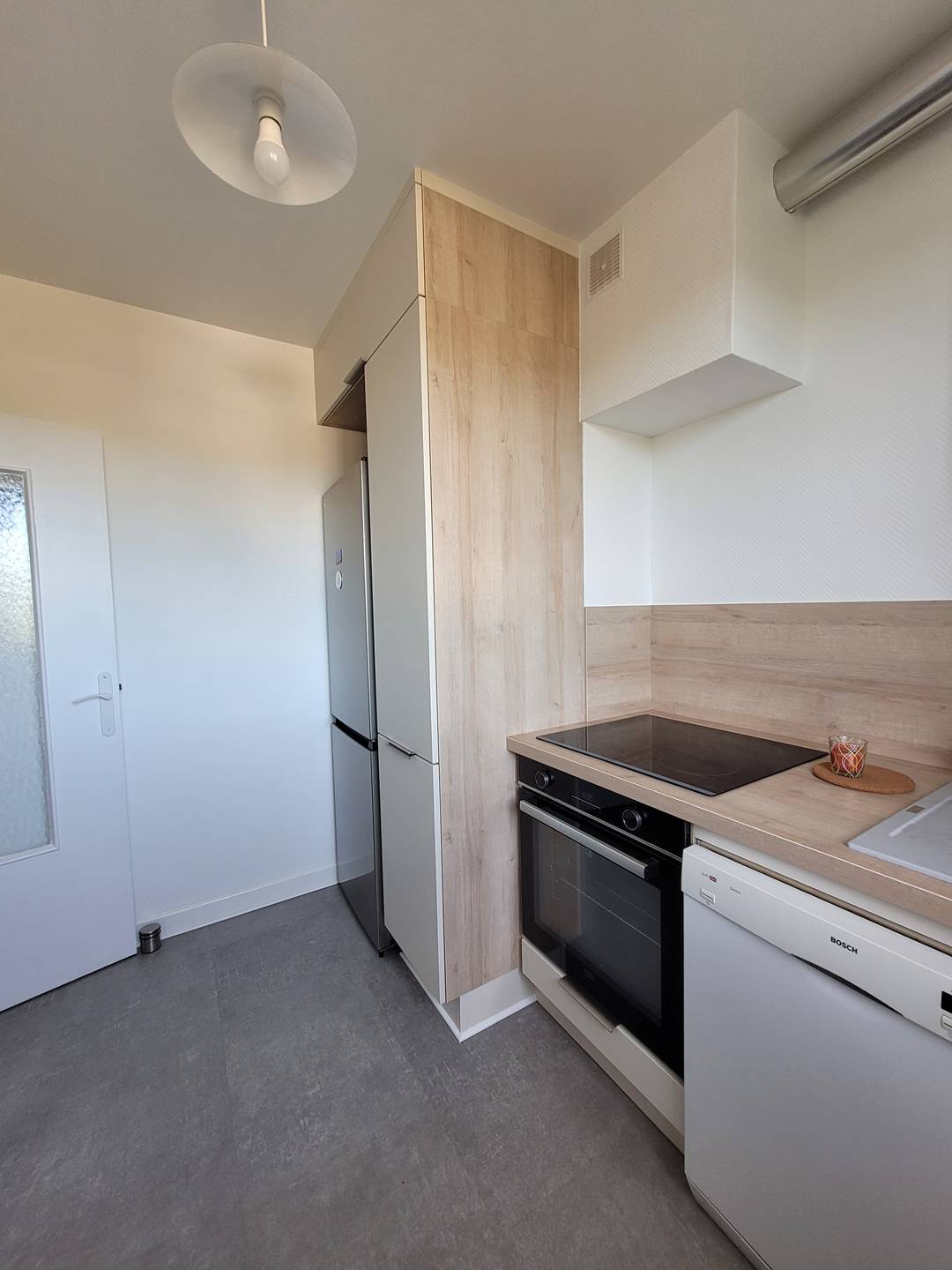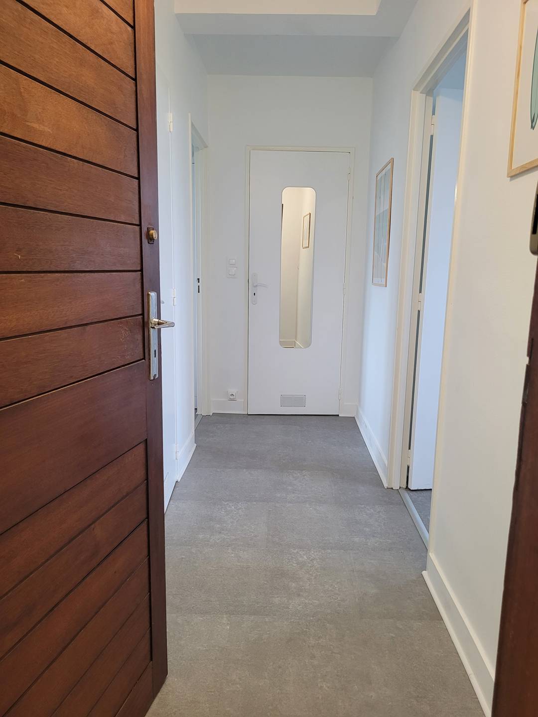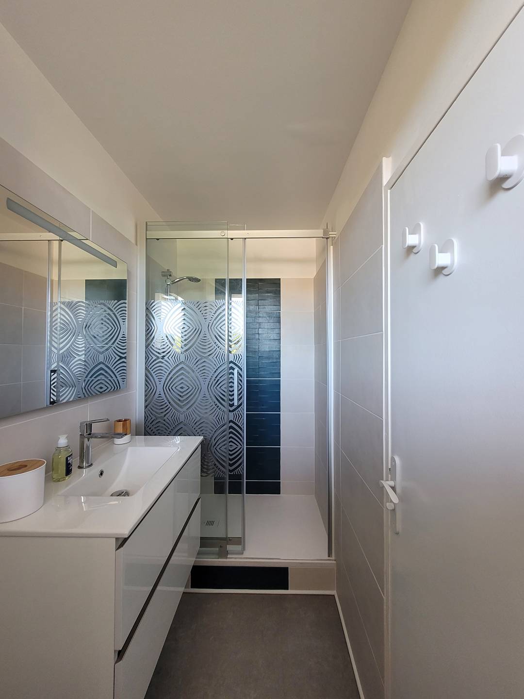 A hallway leads to the independent, fully equipped kitchen, facing east and fitted with a fridge-freezer, electric oven, ceramic hob, microwave and dishwasher. The shower room includes a shower, washbasin and washing machine, and benefits from natural light thanks to a window. The toilet is separate.