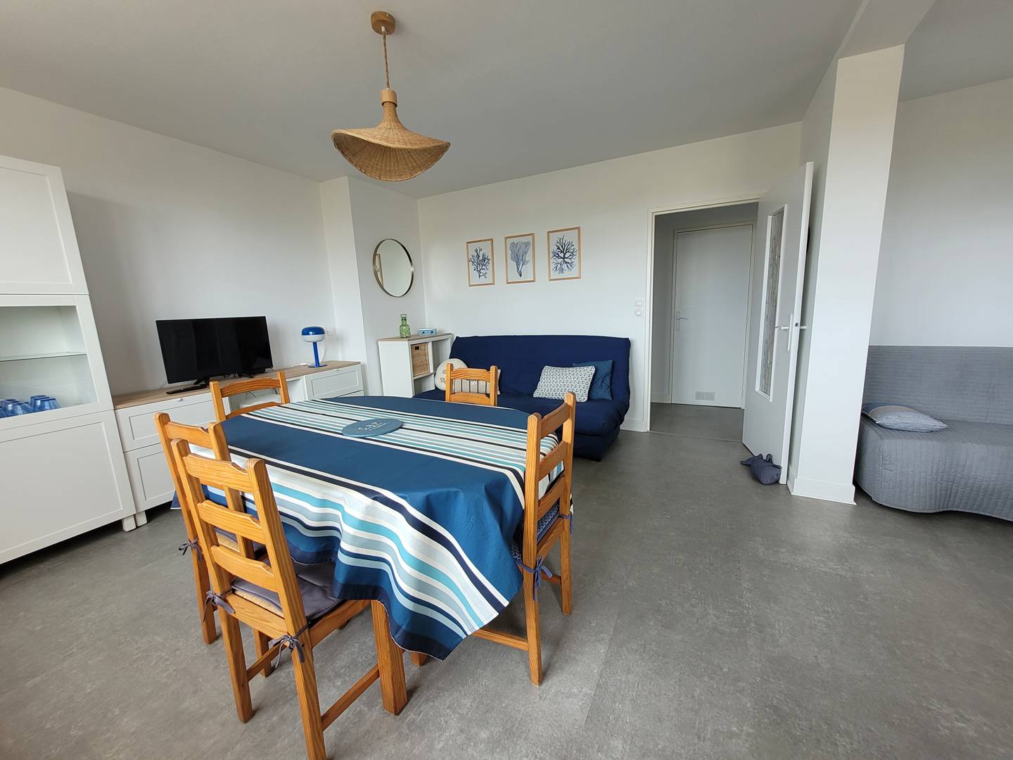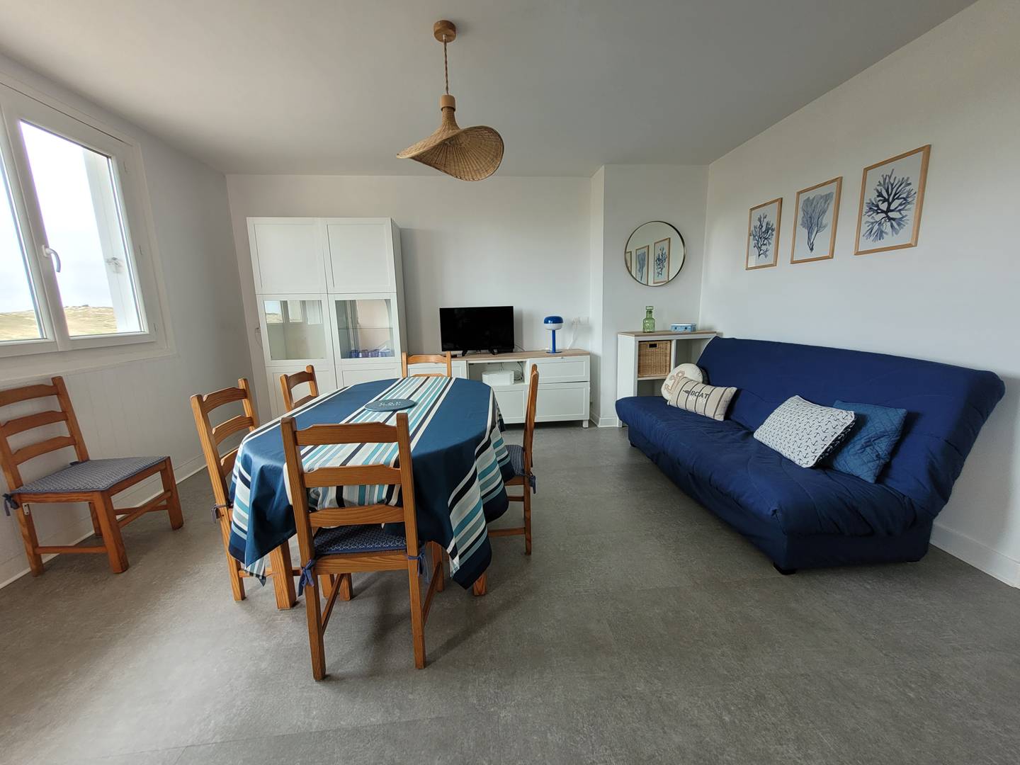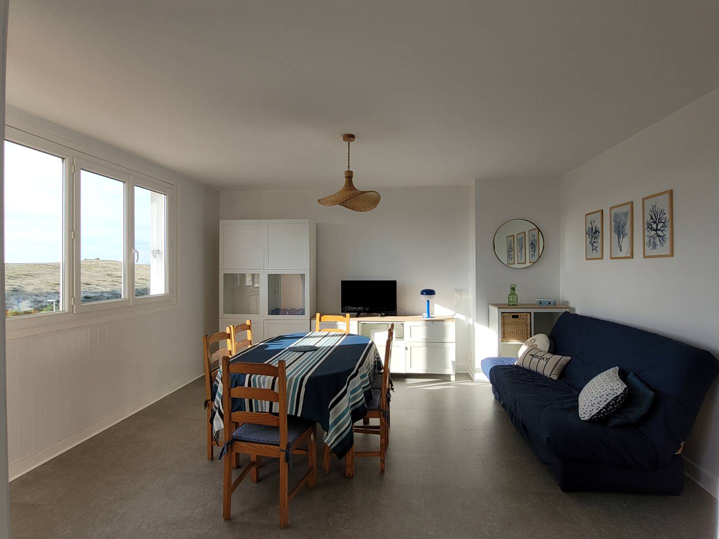 Located in Hossegor, Les Semis Residence, this spacious apartment offers comfortable accommodation for up to 4 guests. The entrance hall includes a storage cupboard and leads to a bright living room of approximately 25 sqm, featuring a seating area, television and air conditioning. A BZ sofa bed allows sleeping accommodation for two additional guests. The living room opens onto a west-facing balcony, ideal for enjoying the late afternoon light with views over the dunes.