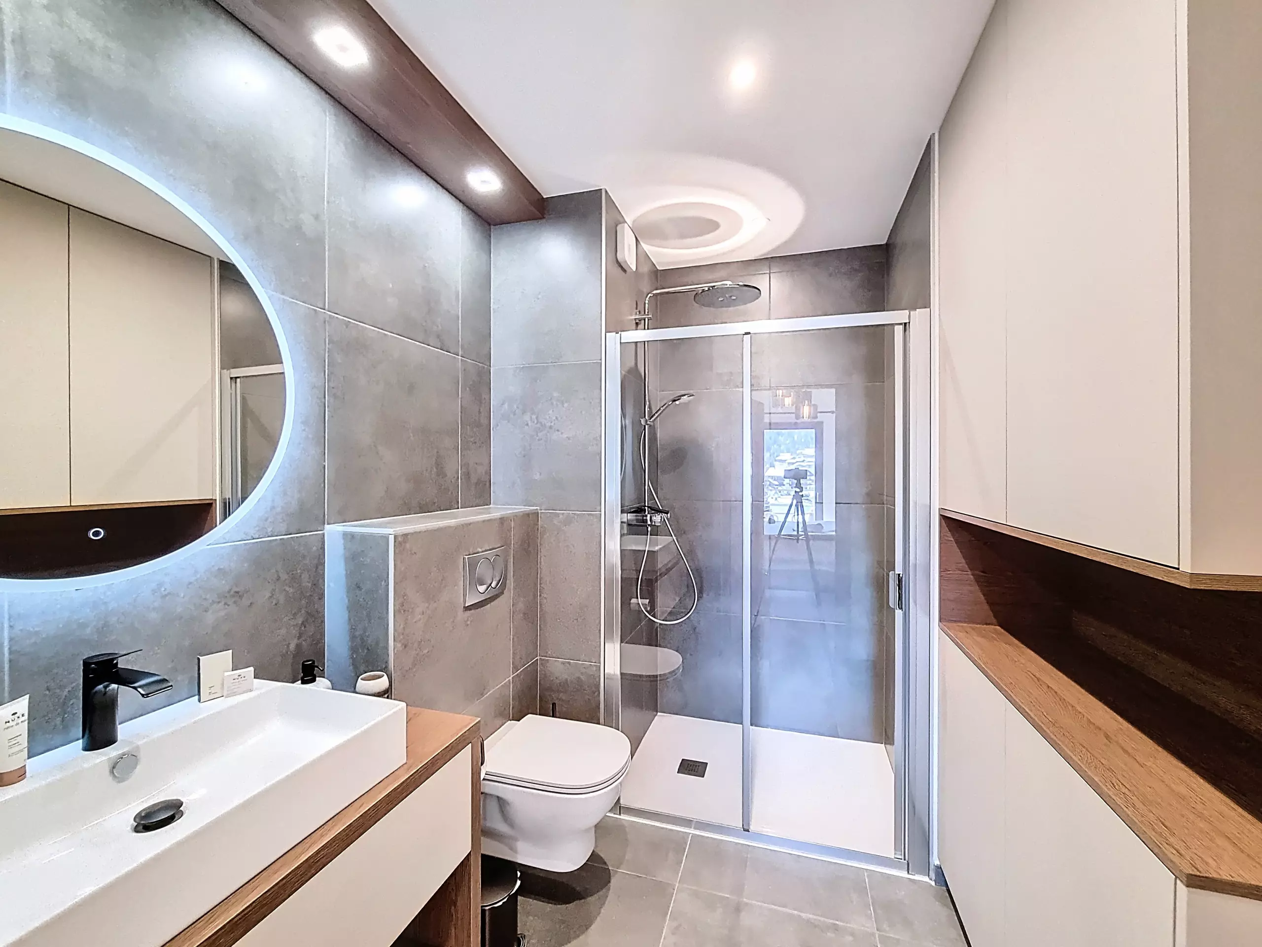 The apartment features two spacious and inviting bedrooms, arranged as follows: one bedroom with a king-size bed, and the other a cabin bedroom with a double bed and a bunk bed. Each bedroom has its own en-suite bathroom.