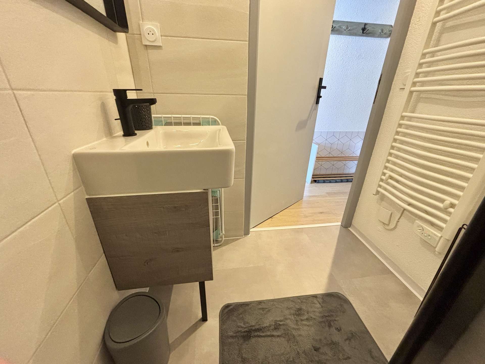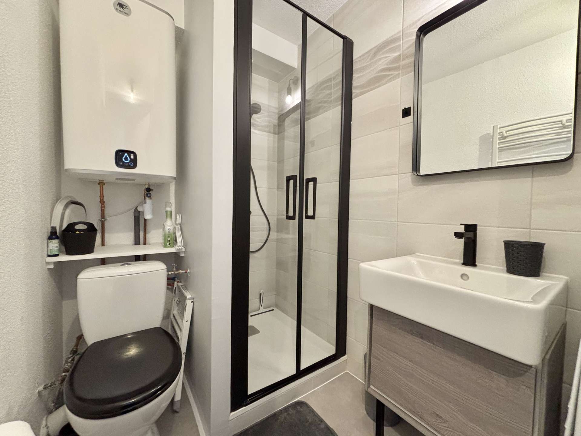 This holiday apartment, located on the ground floor of the residence, comprises an alcove with two single bunk beds (NB: the top bunk is not suitable for children under 6 years old), a living room/lounge with a 160 cm sofa bed, a fully equipped kitchen, and a bathroom with shower and toilet.