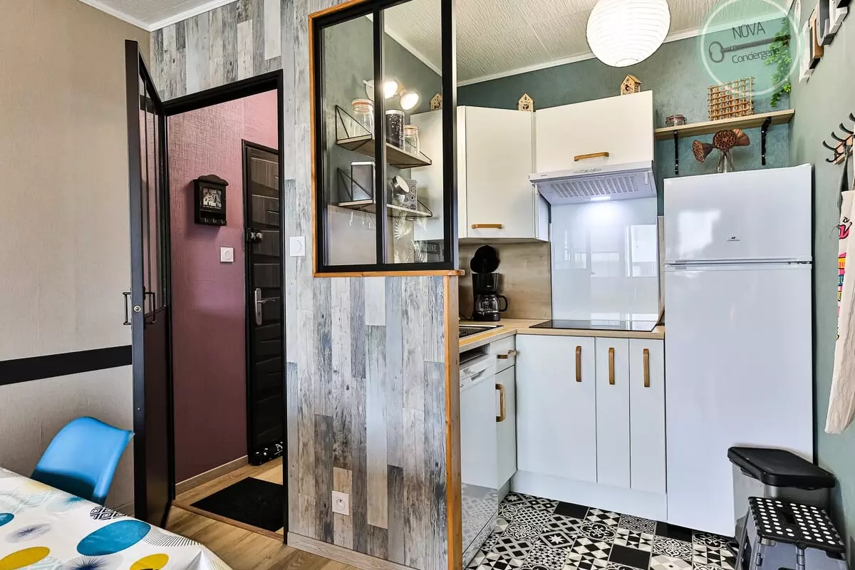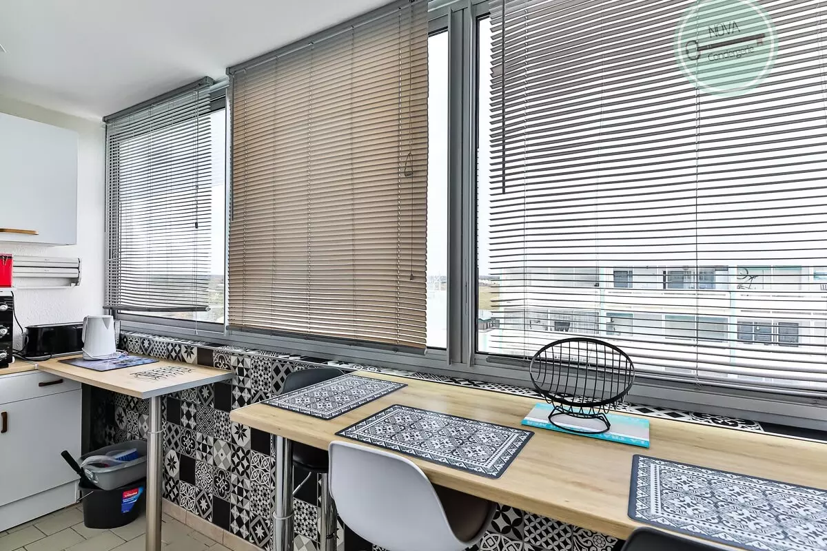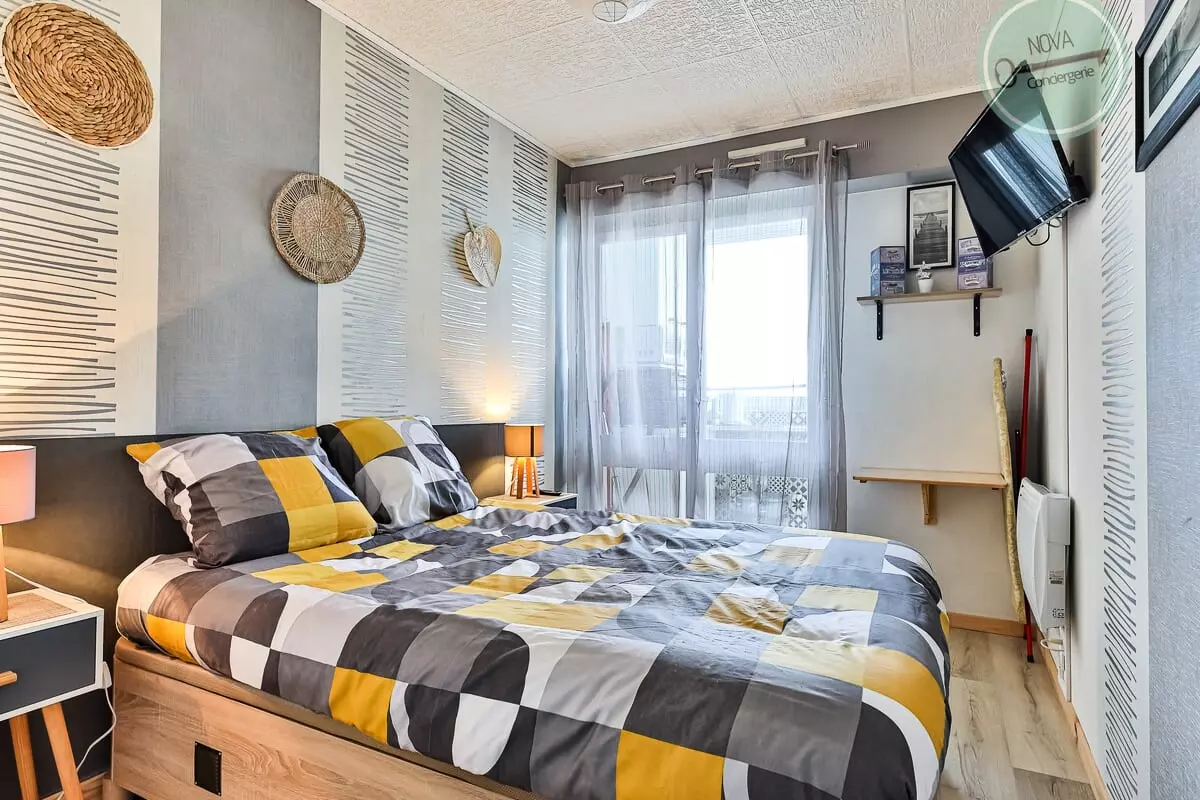 This beautiful, very bright apartment, located on the 7th and top floor, consists of a living room with TV and sofa bed, an equipped kitchenette, a shower room and a bedroom with a double bed and TV.