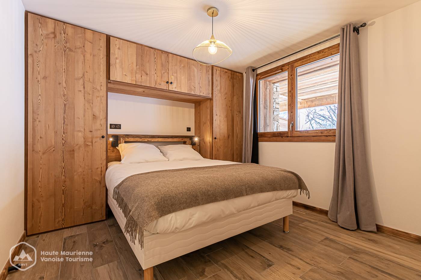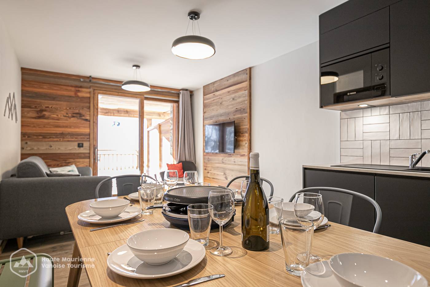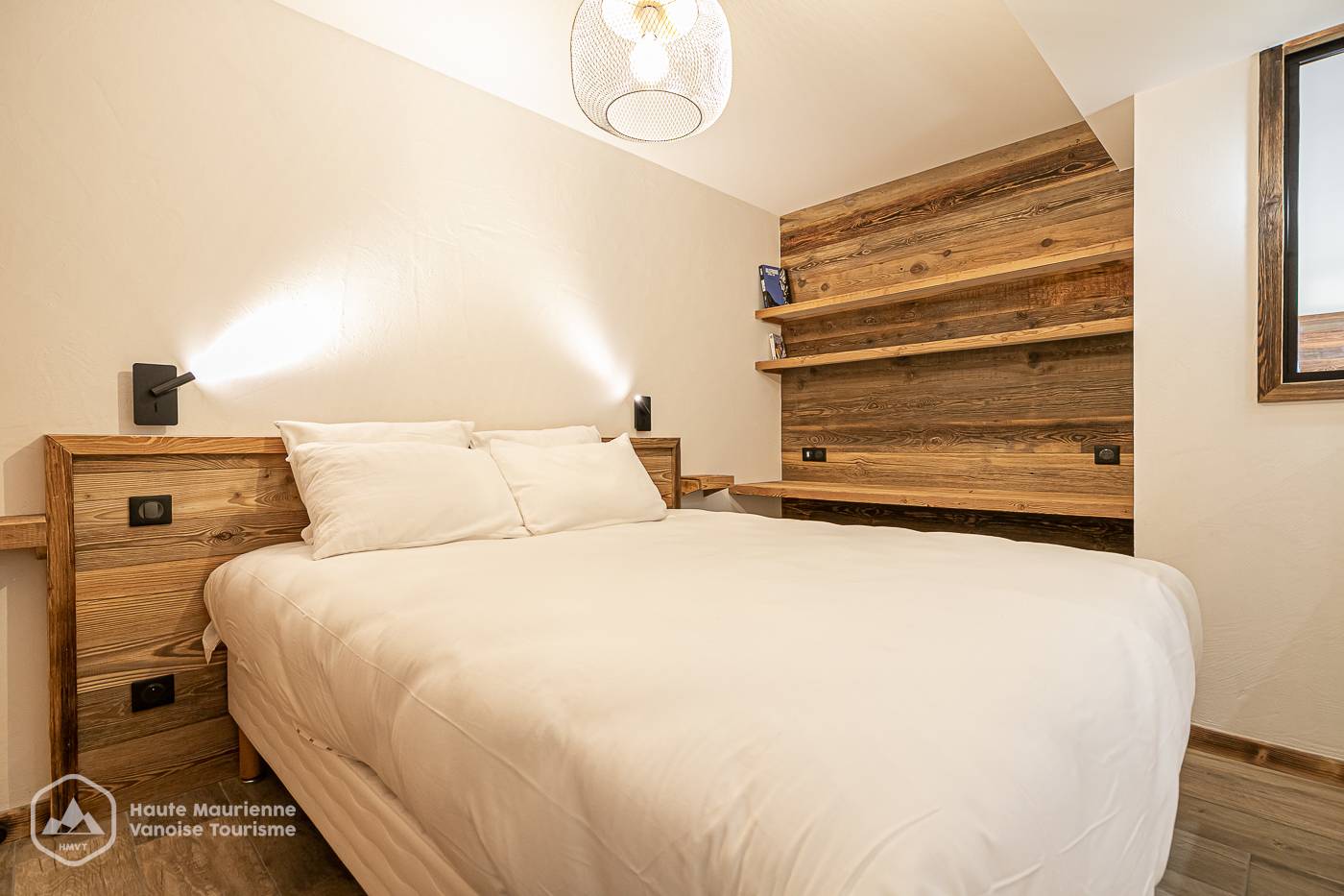 This apartment offers a modern and warm decoration and high quality equipment. Facing south, it directly overlooks the arrival of the slopes.